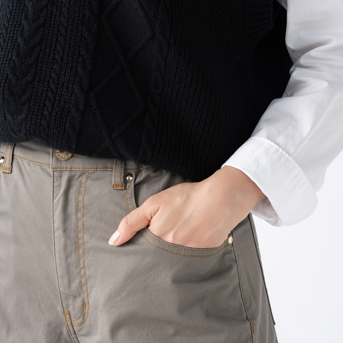 以前のカーヴィーパンツがすごく良かったので、今回もウエイト楽しみに待っていました。ん? 何か綺麗なラインが出ない! サイズ間違えたかな? 希望のお色は完売なので交換できない、、履き心地は良い、ゴールドの金具も可愛い。でも、、残念ですが返品します。