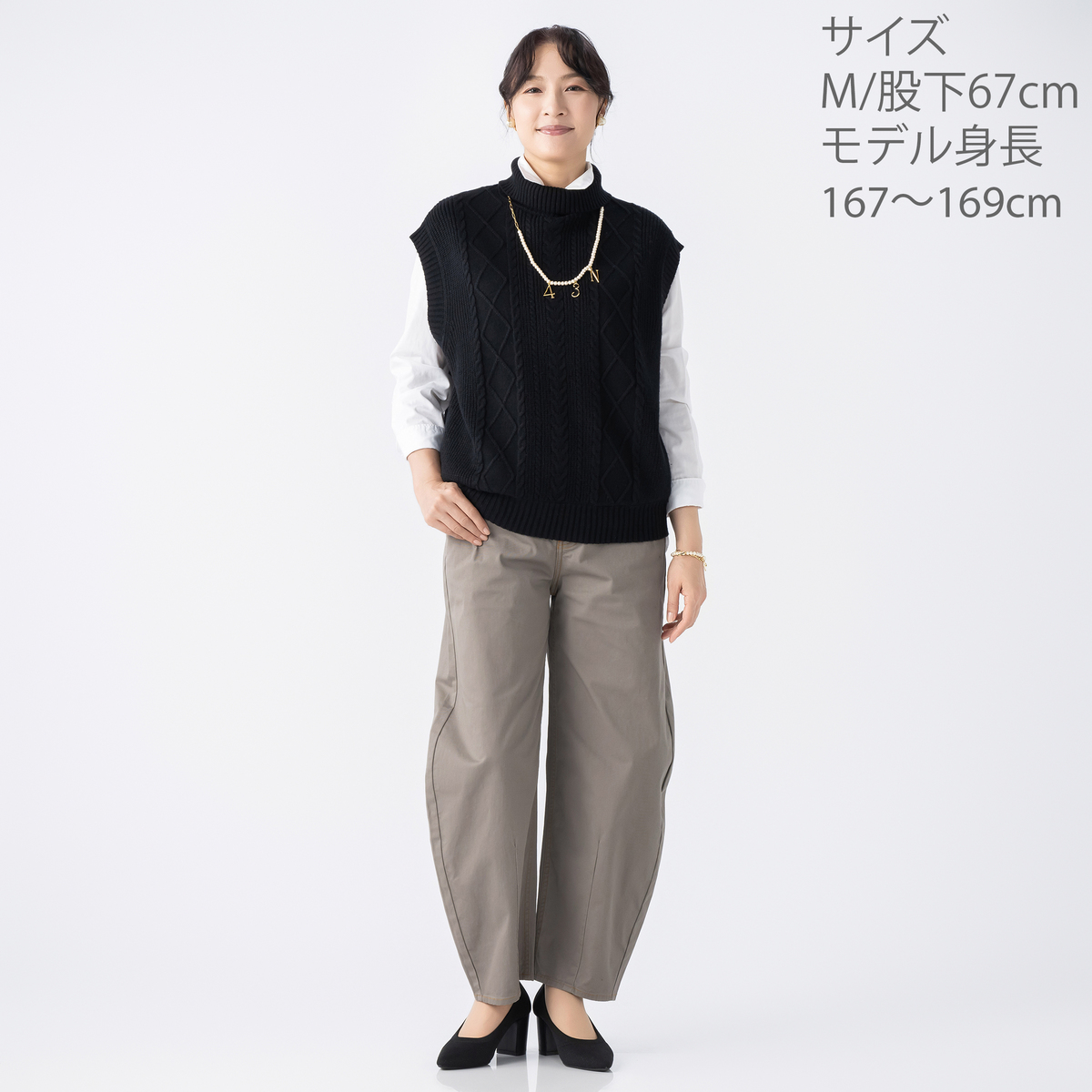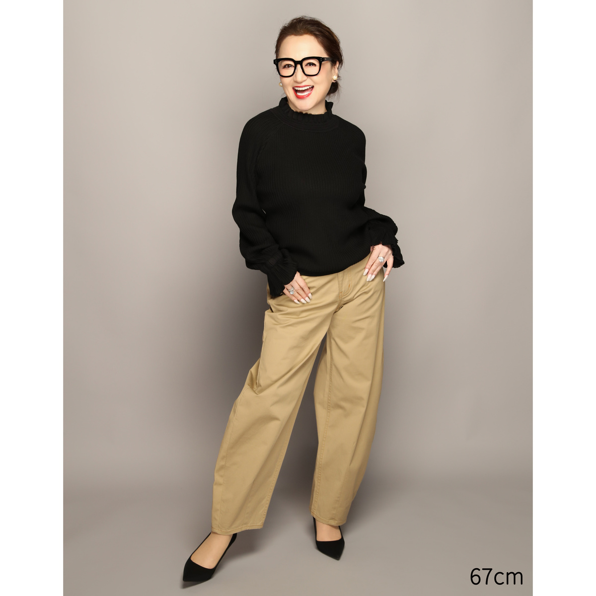 裾幅の絞り方は大いに魅力的。でもモデルさんの写真は個人的には太って見える。155cm以下の中肉体型が着るとどうなる?せめて全体の幅があと2cmから3cm細くして頂きたかったかな。希望色が無く諦めたブランドは、Lサイズで渡り幅33cm・前股上29cm。インスタやらない私は、オンエア見て判断するしかなさそう。