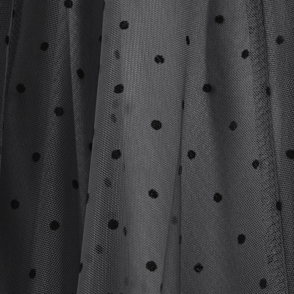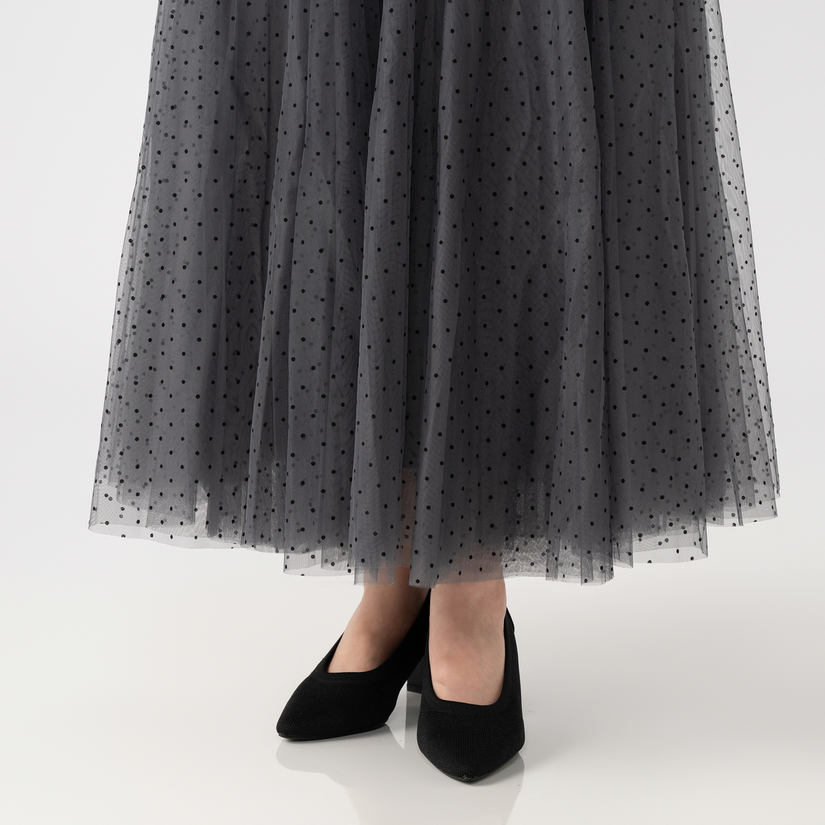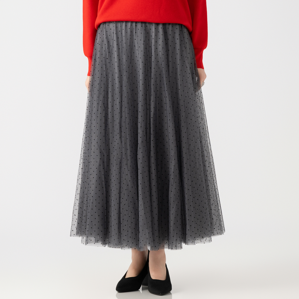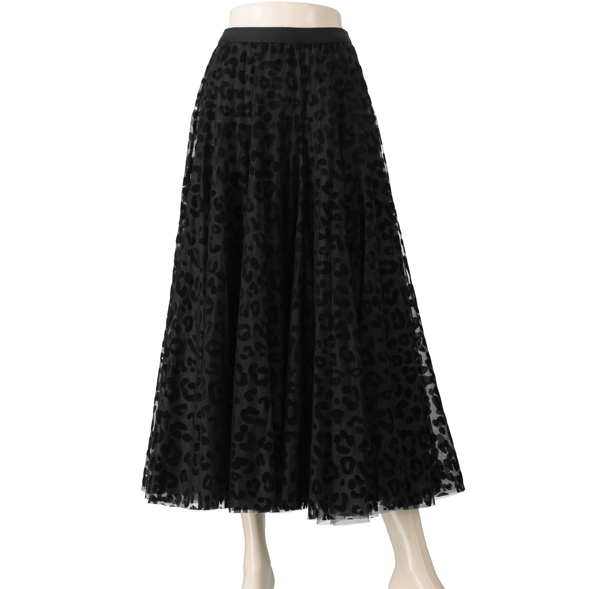 落ち感のある柔らかなソフトチュールにフロッキープリントを施したボリュームロングスカート。大小のドット柄とレオパード柄をご用意しました