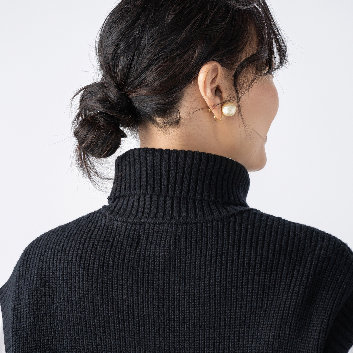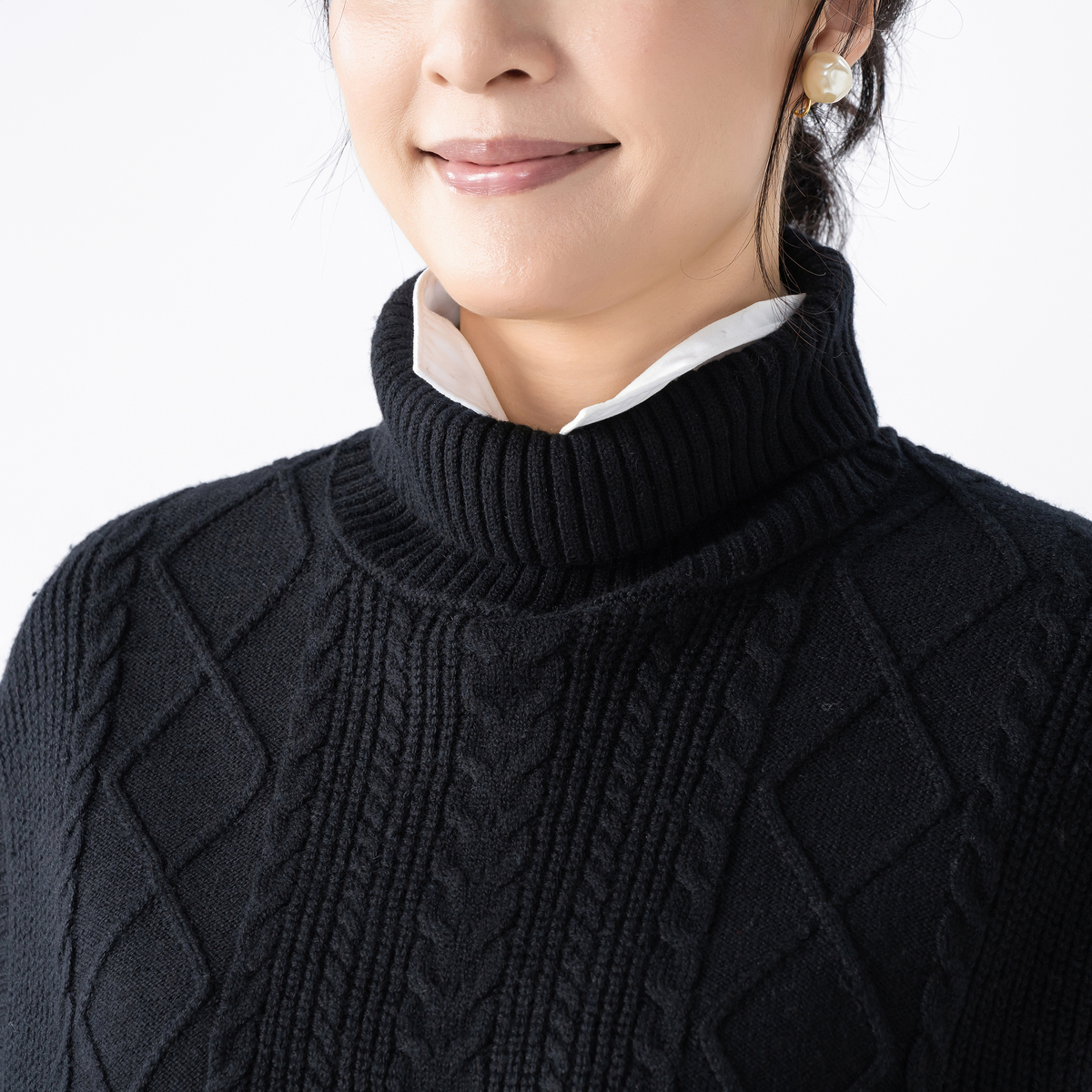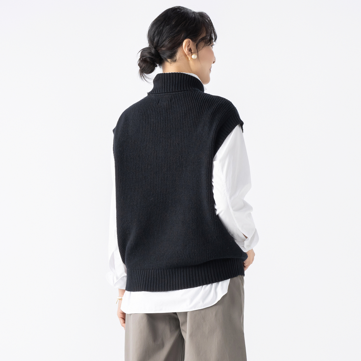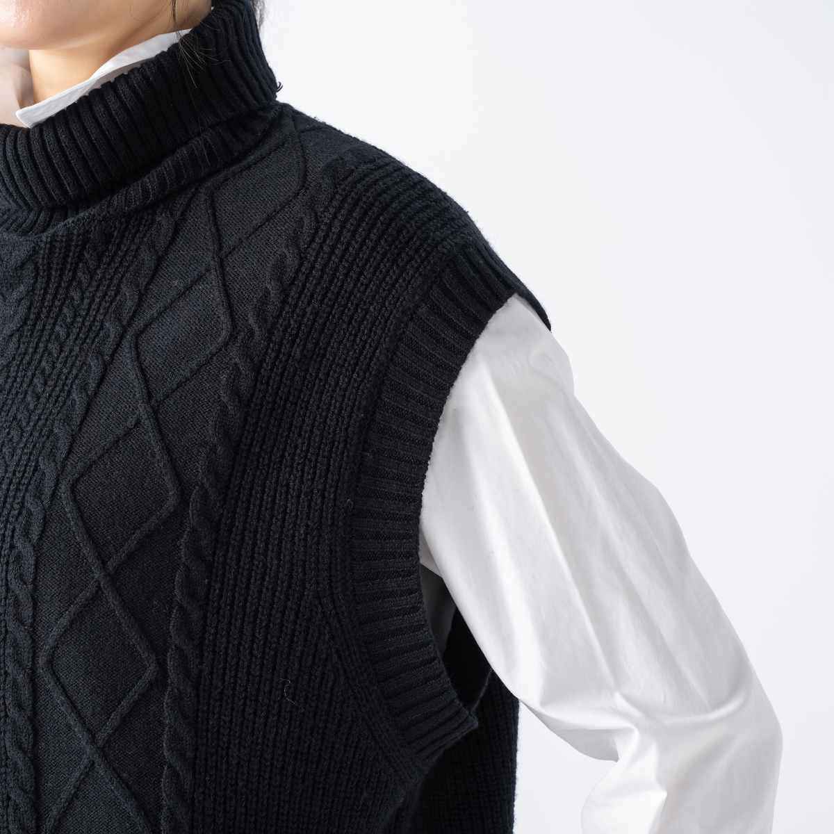 ケーブル編みが際立つタートルネックのニットベスト。前身頃に立体的な編地を配し、後ろ身頃は畦編みでふんわりと仕上げています。シャツやカットソーとの組合せで、レイヤードスタイルが楽しめます。ウールミックス糸のタッチも魅力です