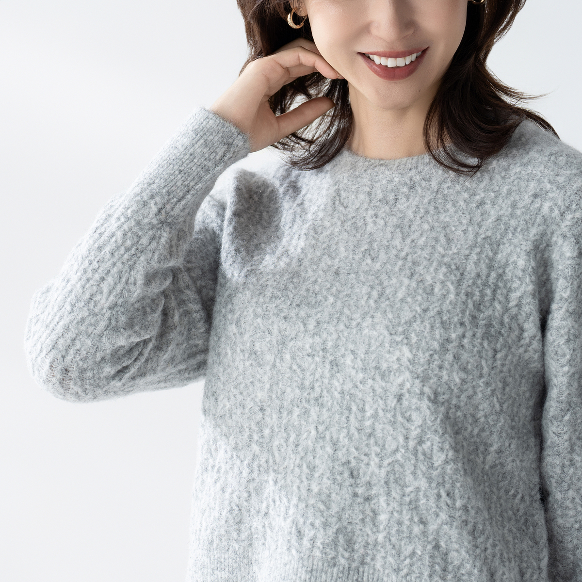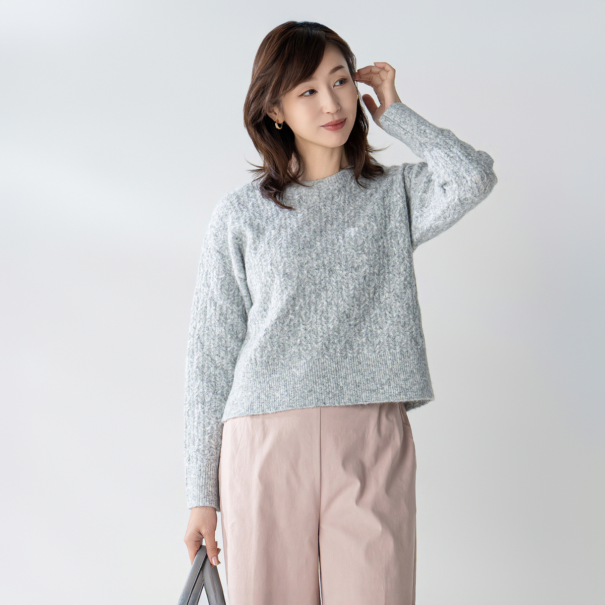着こなしに華やかさを添えるニットです。やさしいペールトーンと上品なメランジが、柔らかな雰囲気を演出。1枚でコーディネートが明るくなり、華やぎ感をプラスします