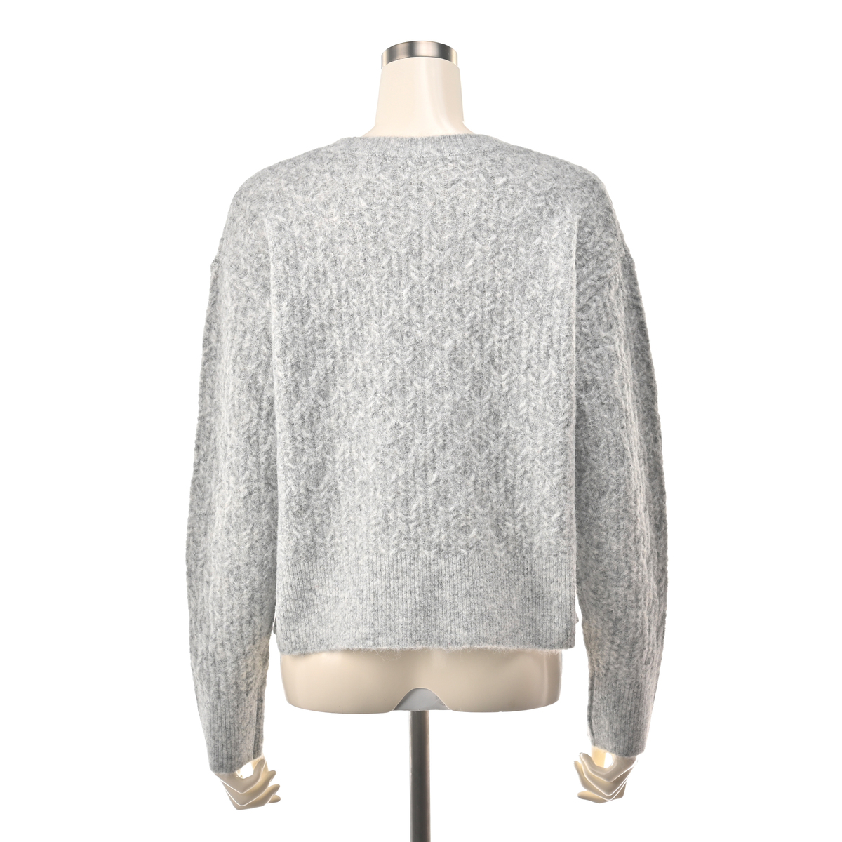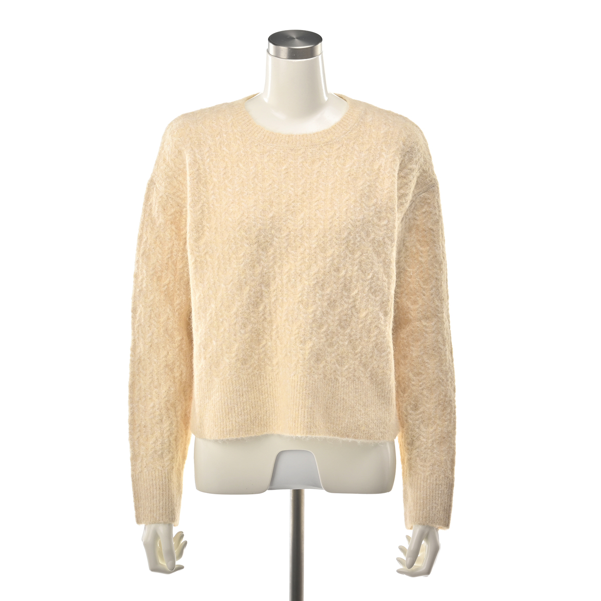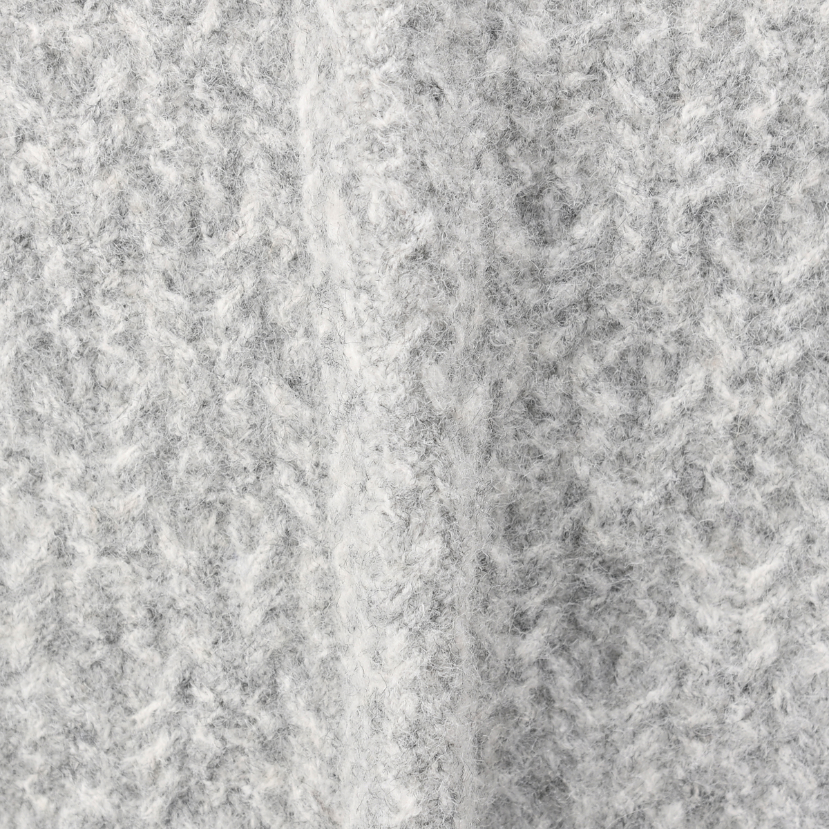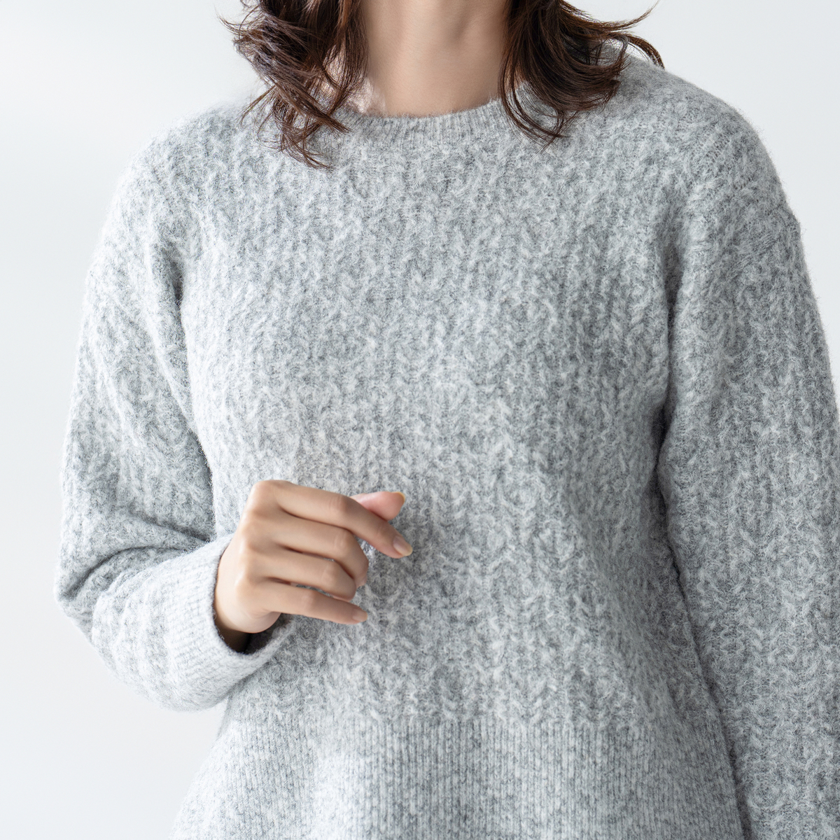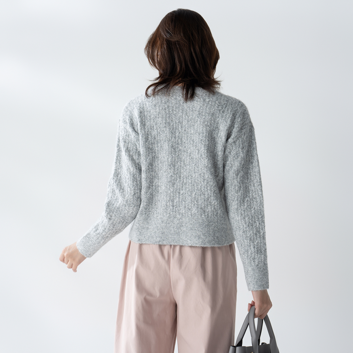 ふっくらとした6ゲージの編地。ポリエステル混紡でローゲージでも軽く、ケーブル柄の立体感がシンプルな色に奥行きをプラス。360度ぐるっと編み柄を入れることで、後ろ姿まで美しく見せてくれます