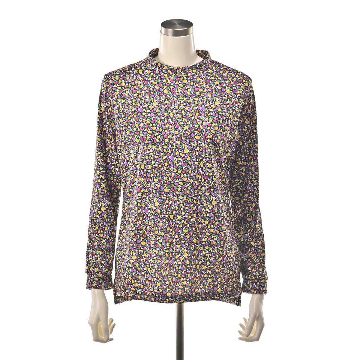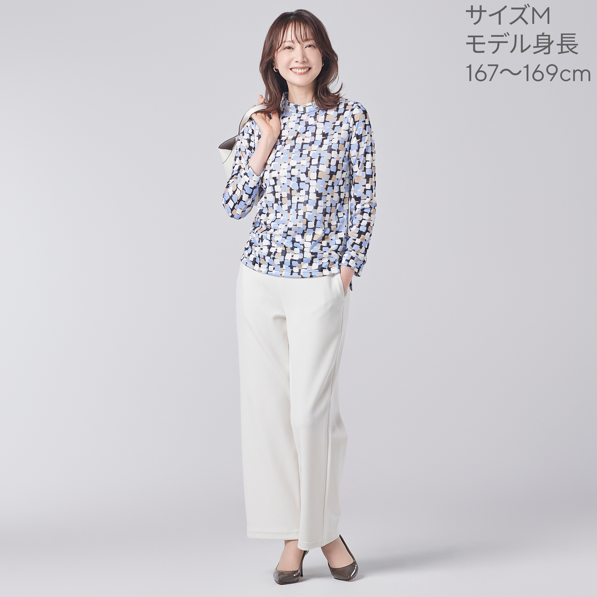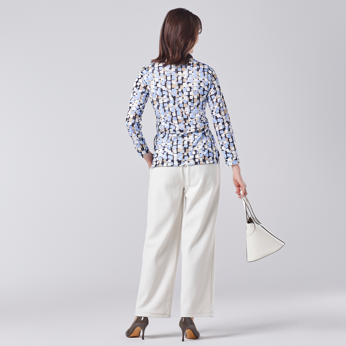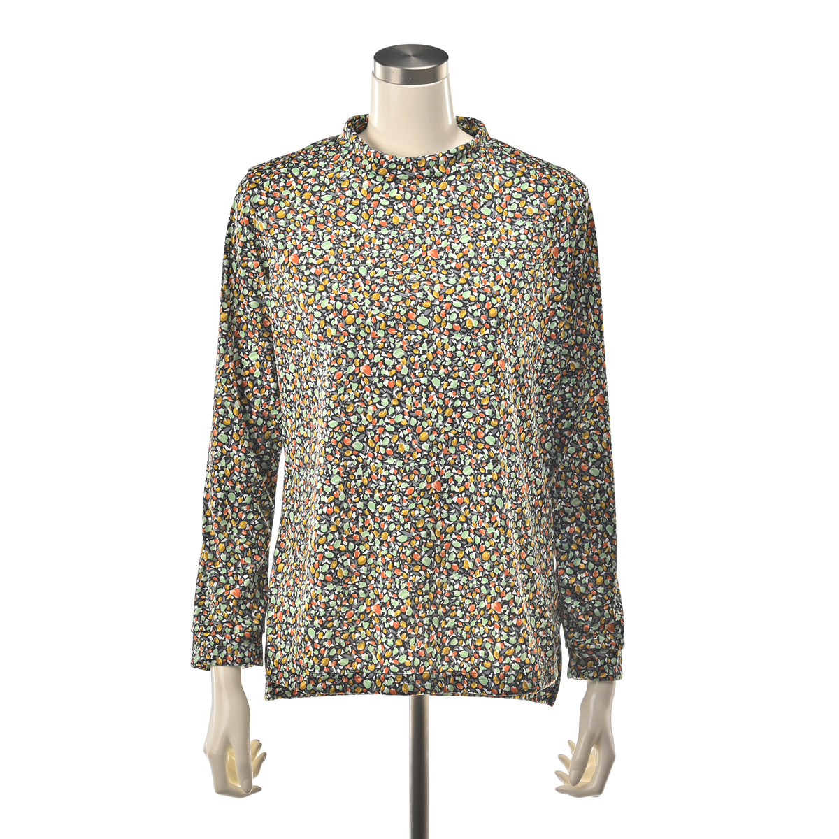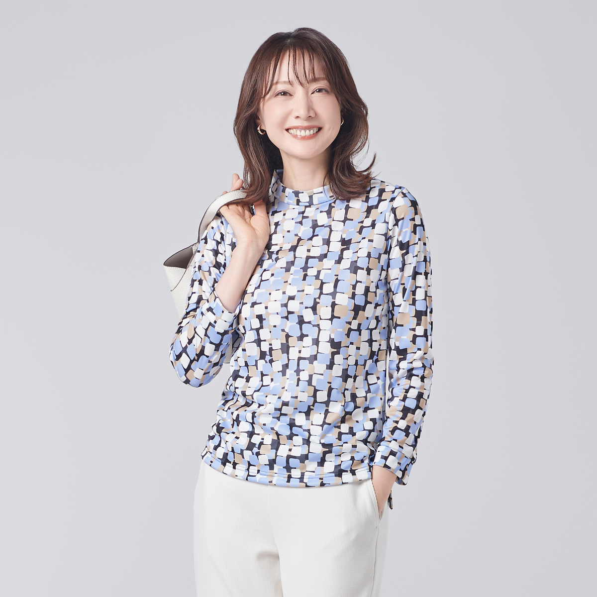 ゆとりのあるセミハイネックデザインが首まわりにさりげない上品さを与えます。身体にほどよく沿うシルエットで、パンツやスカートにも合わせやすく、インナーにも一枚着にも活躍。京都で染色加工された京プリントの生地が、着こなしに個性をプラスします