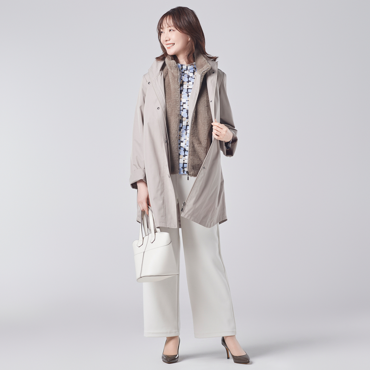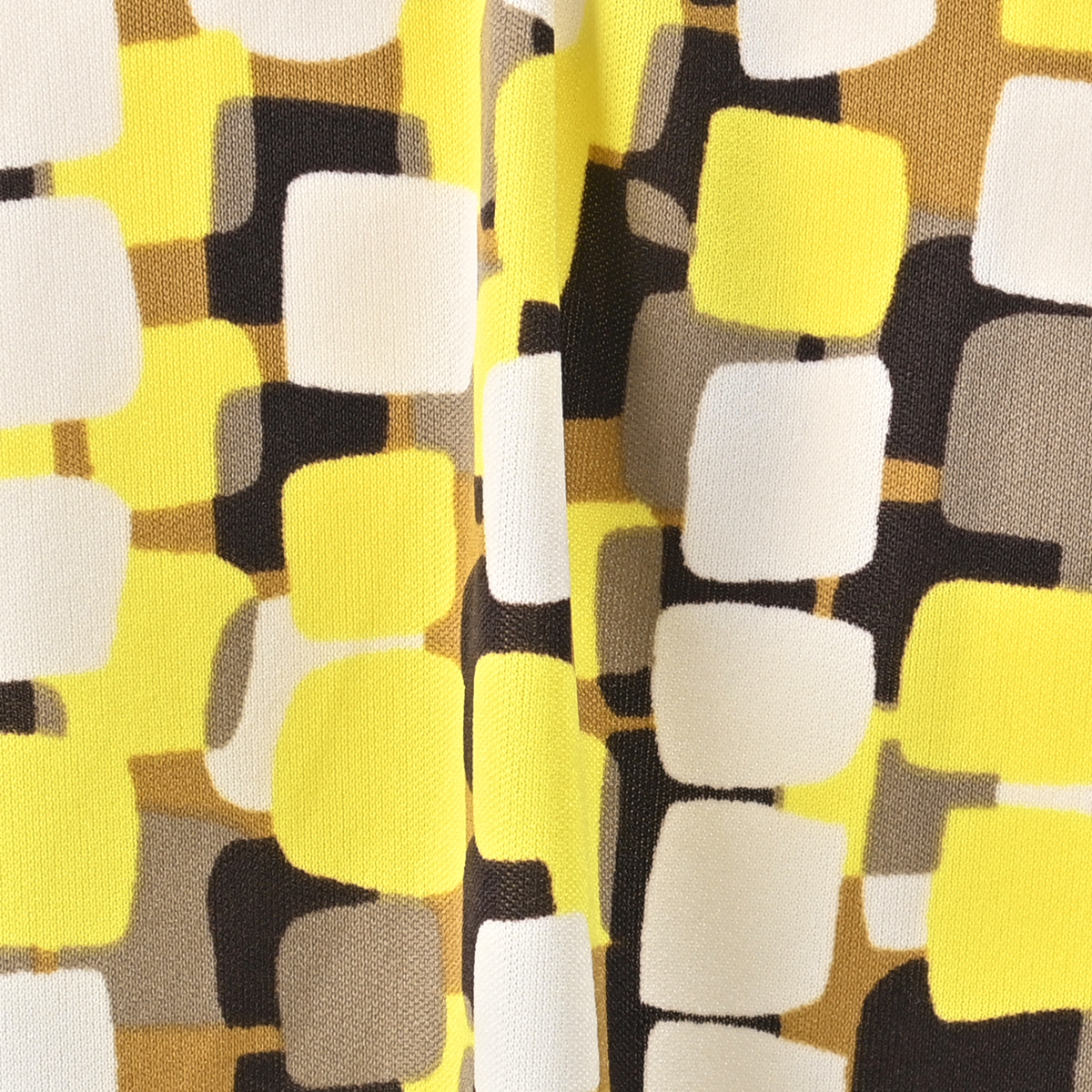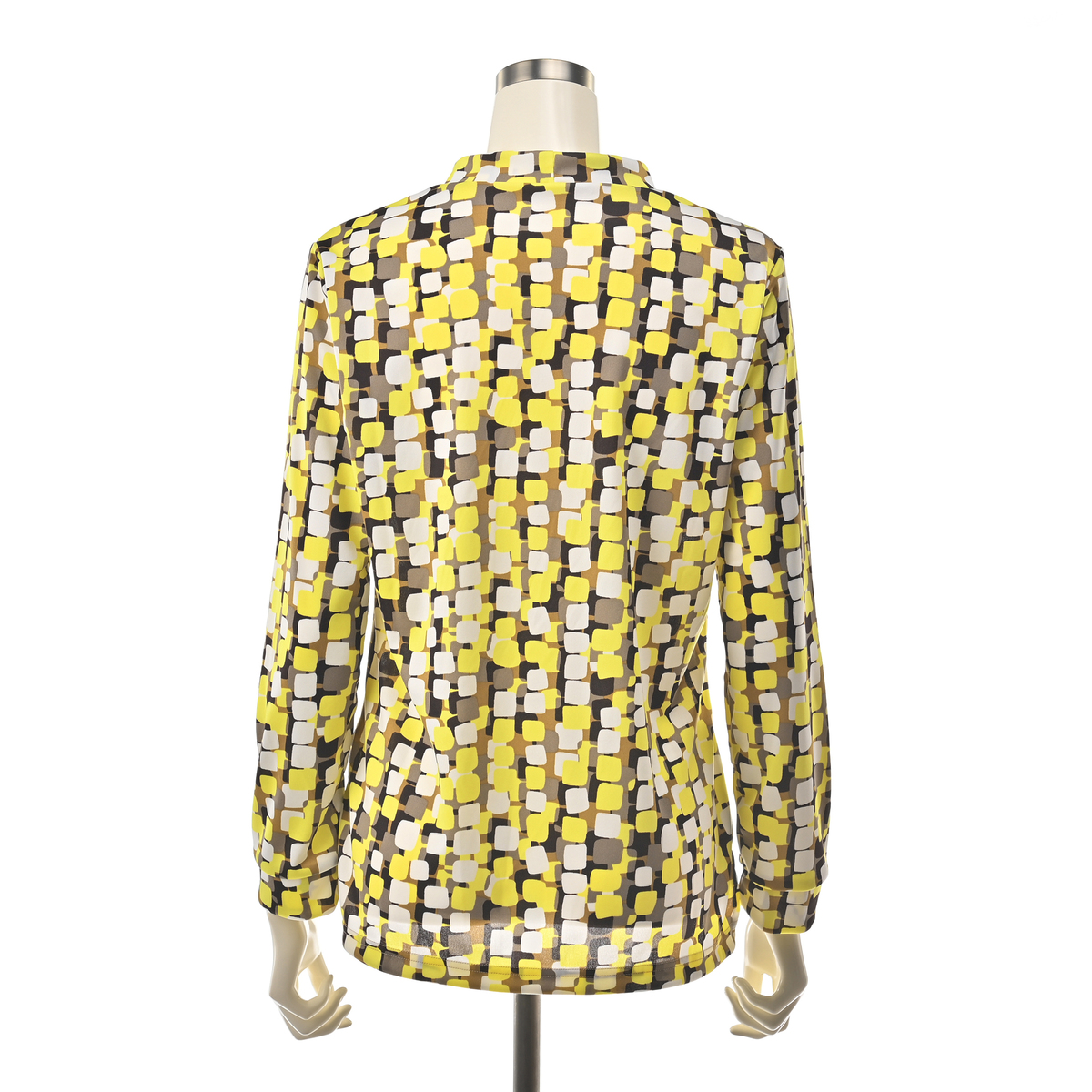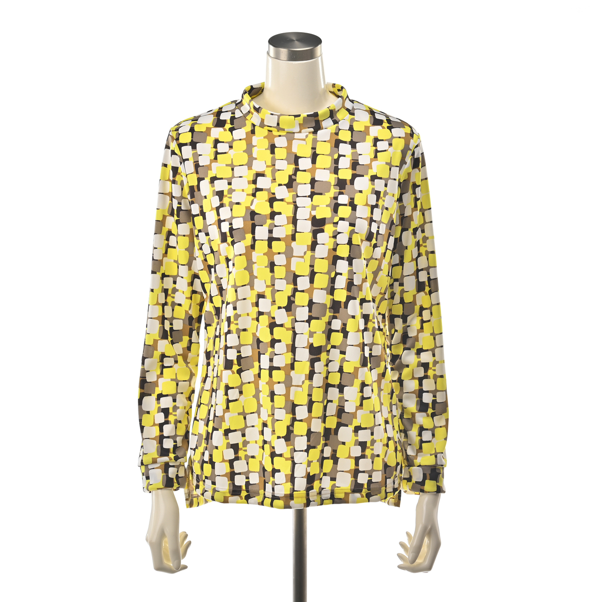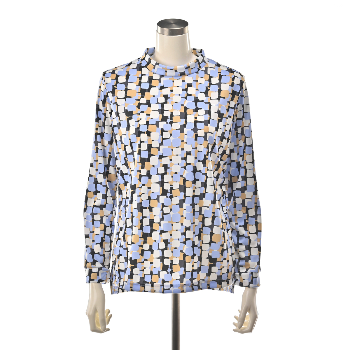 ゆとりのあるセミハイネックデザインが首まわりにさりげない上品さを与えます。身体にほどよく沿うシルエットで、パンツやスカートにも合わせやすく、インナーにも一枚着にも活躍。京都で染色加工された京プリントの生地が、着こなしに個性をプラスします