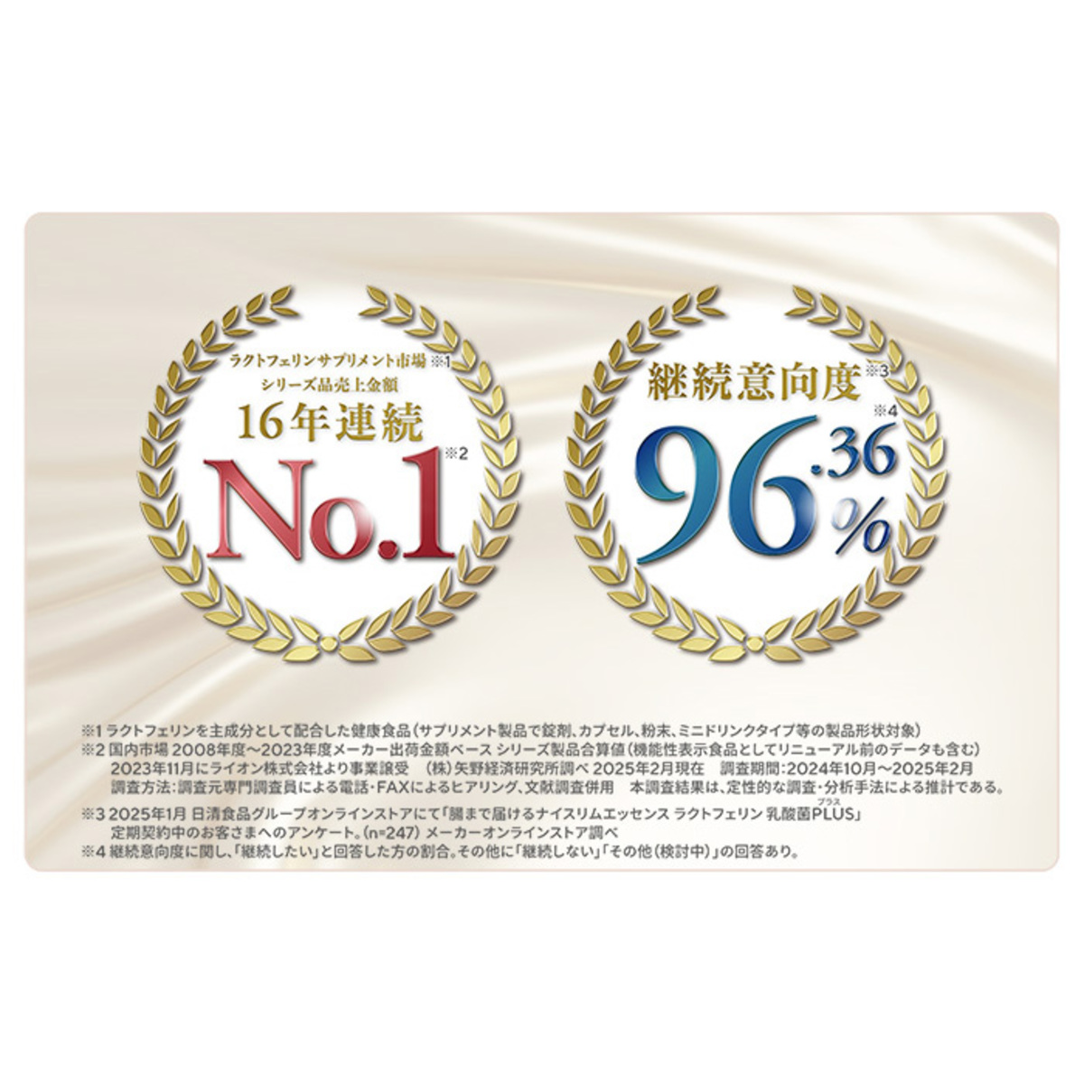 乳酸菌K-1(L. casei 327)を1日目安4粒あたりに1000億個配合。ラクトフェリンは、牛の生乳に約0.03%しか含まれていないとされています。本品は1日4粒目安で手軽に。水などと一緒にかまずにお召し上がりください