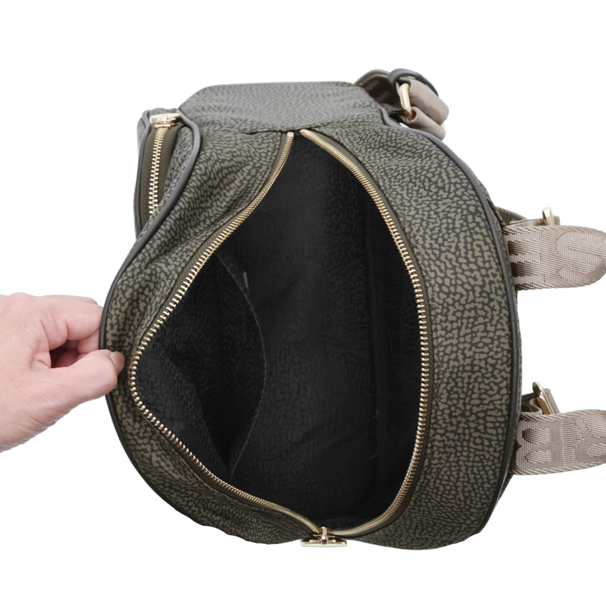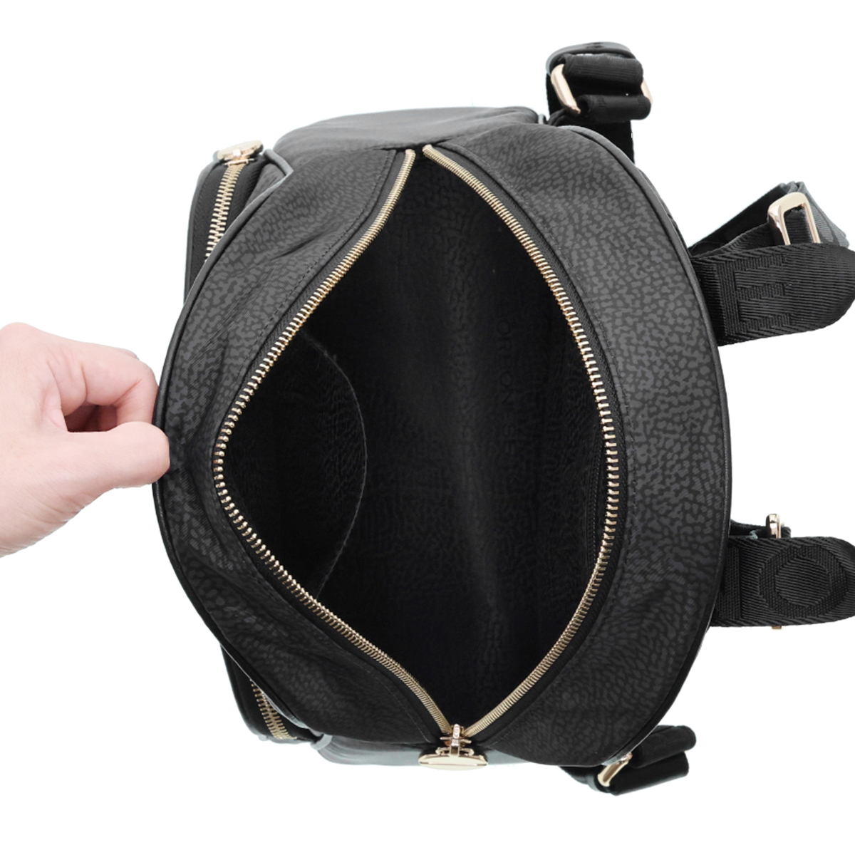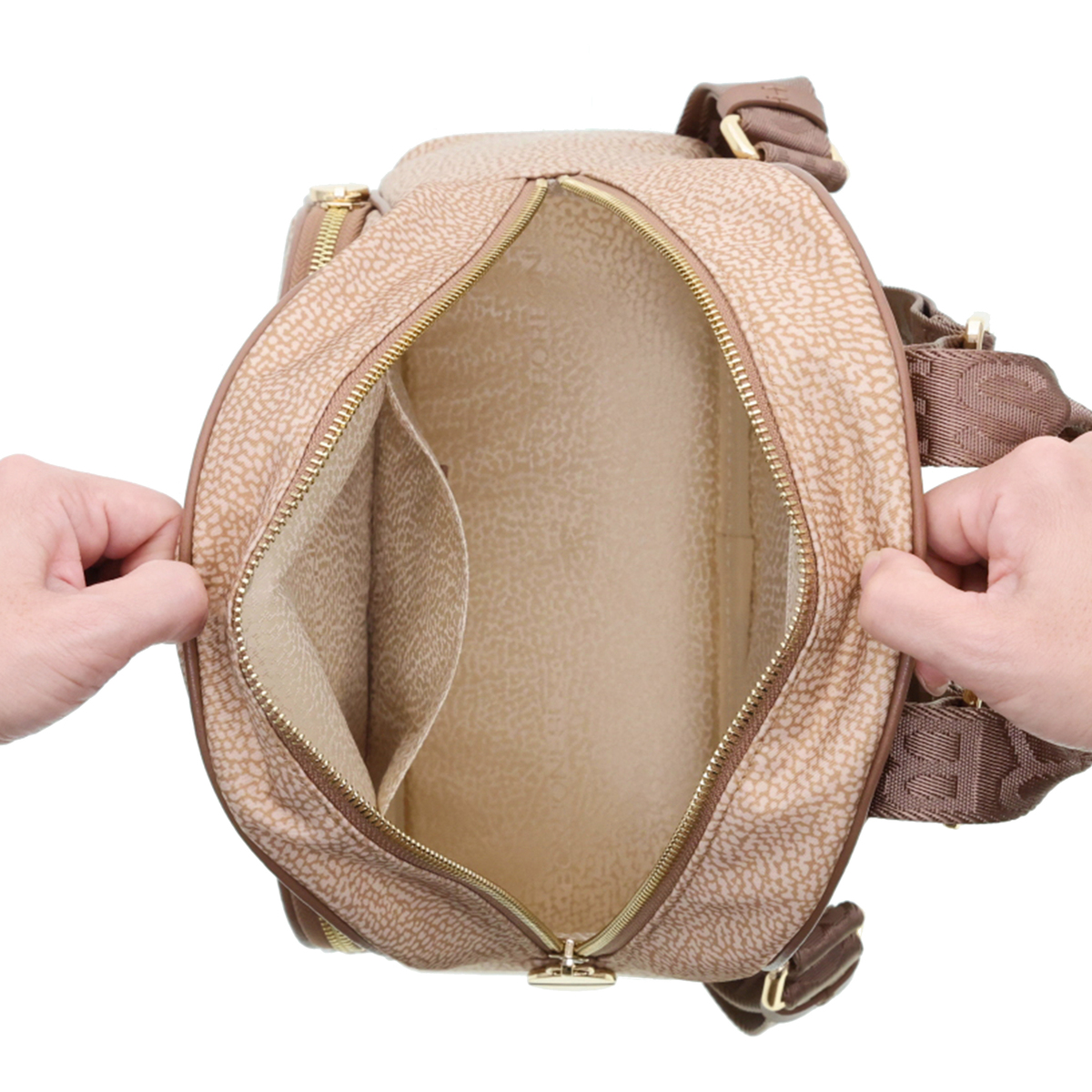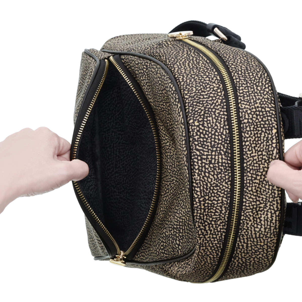 持ち手とショルダーベルトにブランドロゴを施し、ファスナースライダーにもアイコンが刻まれています。大きく開くファスナーで中身が取り出しやすく、細部までこだわったデザインが魅力です