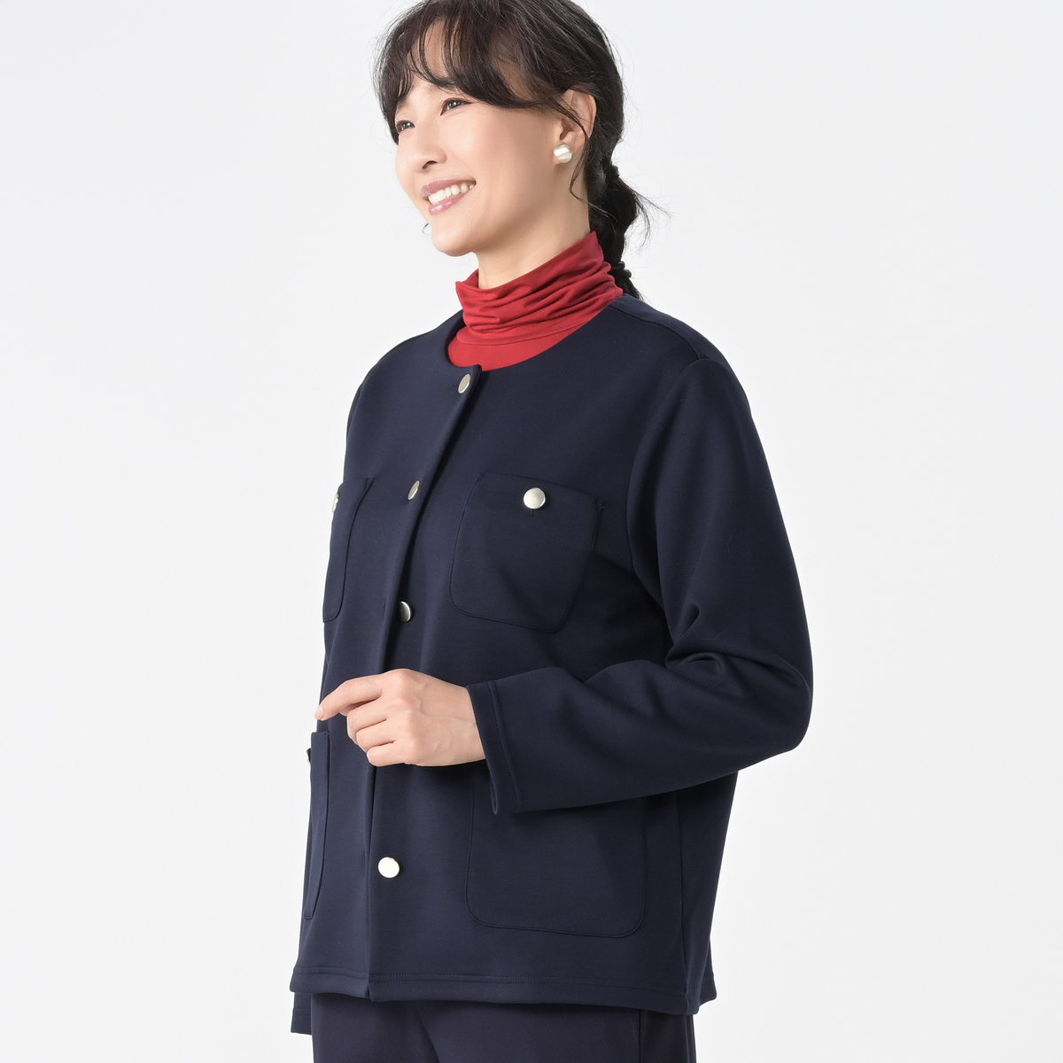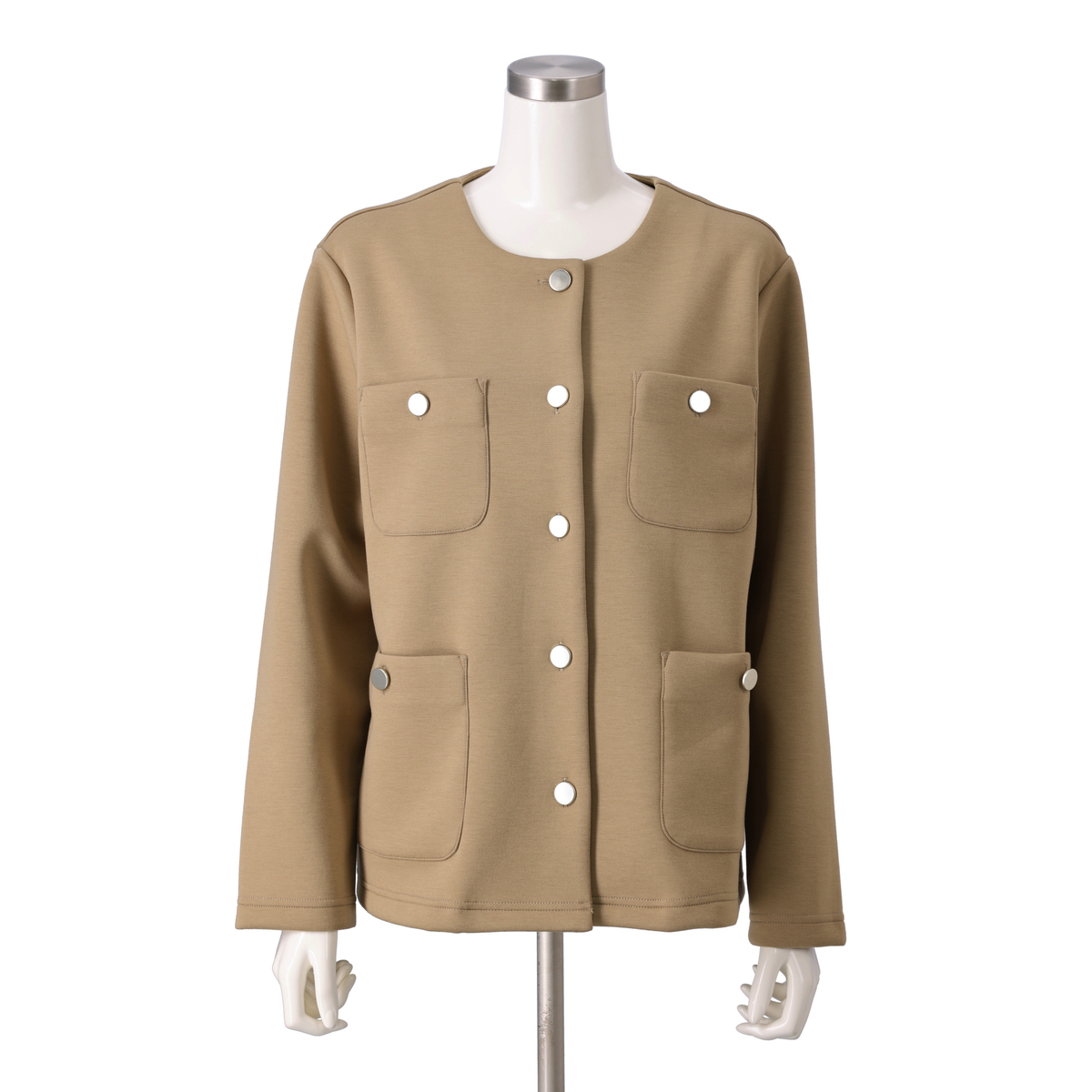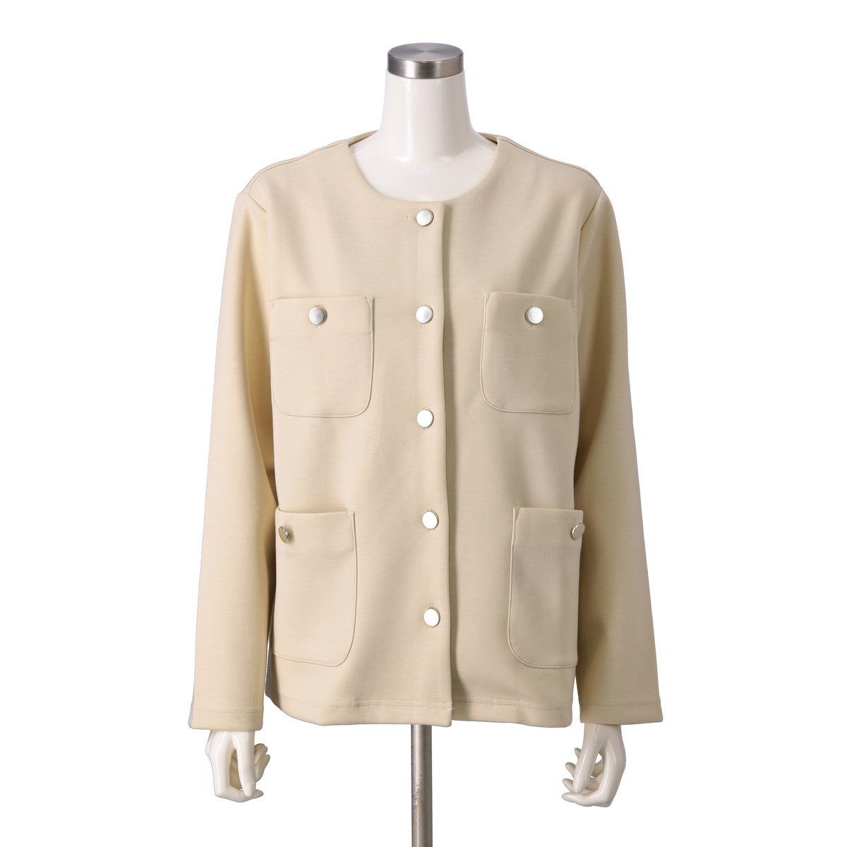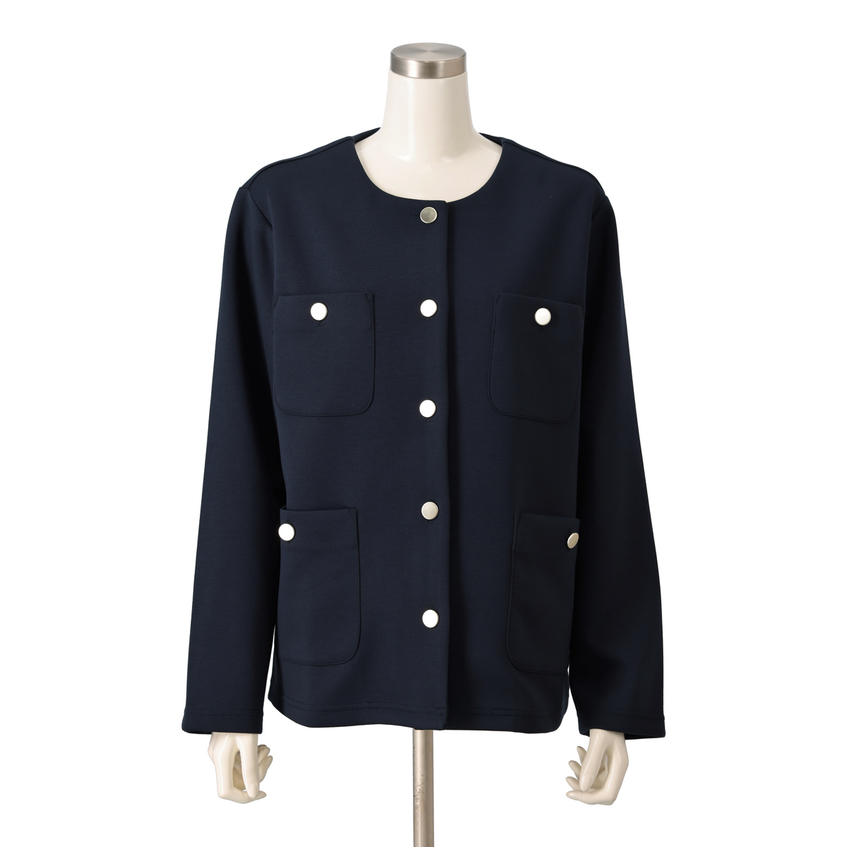 軽やかで膨らみのあるダンボールニット素材で仕立てたジャケット。胸と腰に配したポケットと、高級感のあるメタル調ボタンがポイントです