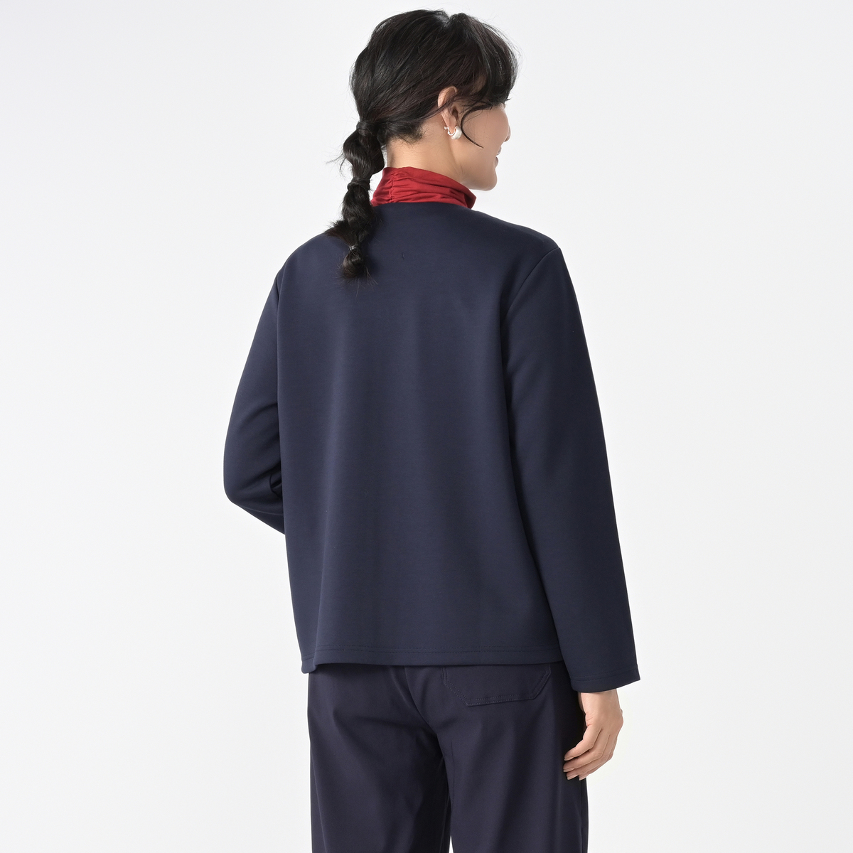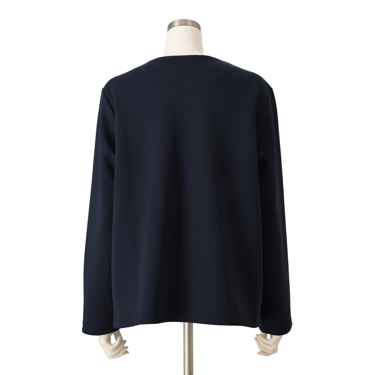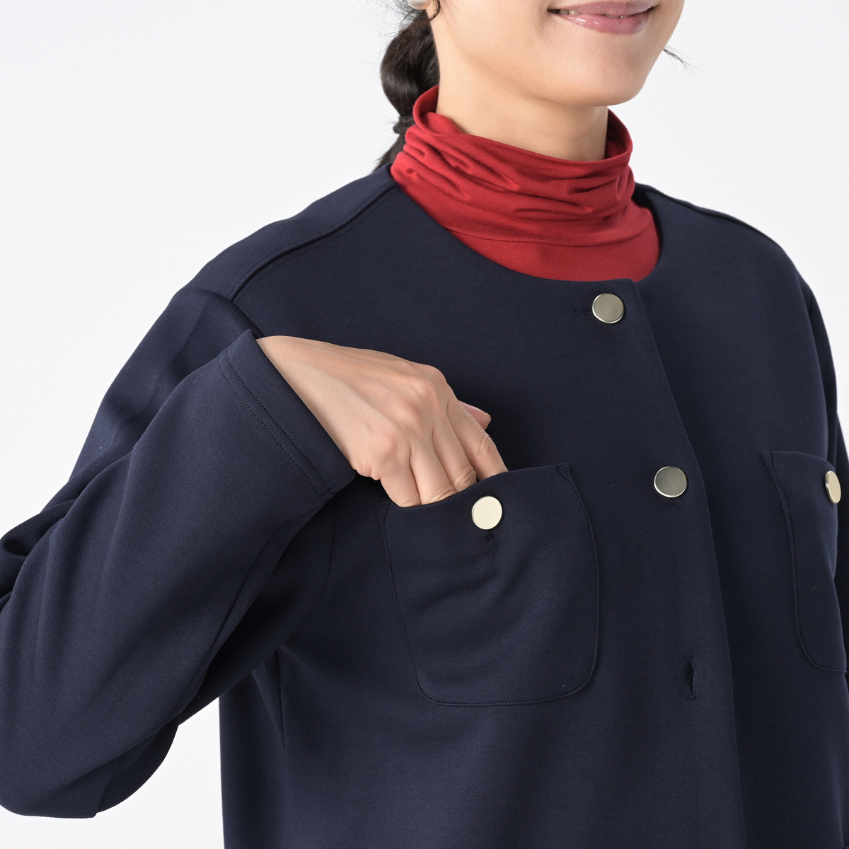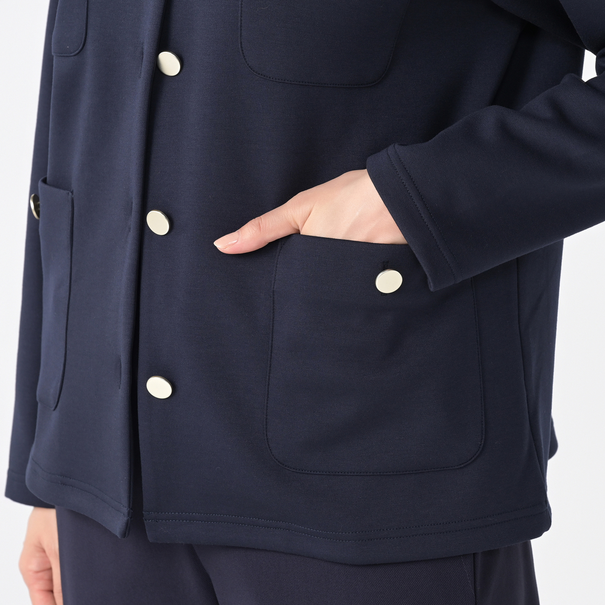 軽やかで膨らみのあるダンボールニット素材で仕立てたジャケット。胸と腰に配したポケットと、高級感のあるメタル調ボタンがポイントです