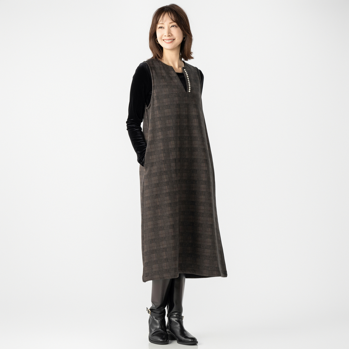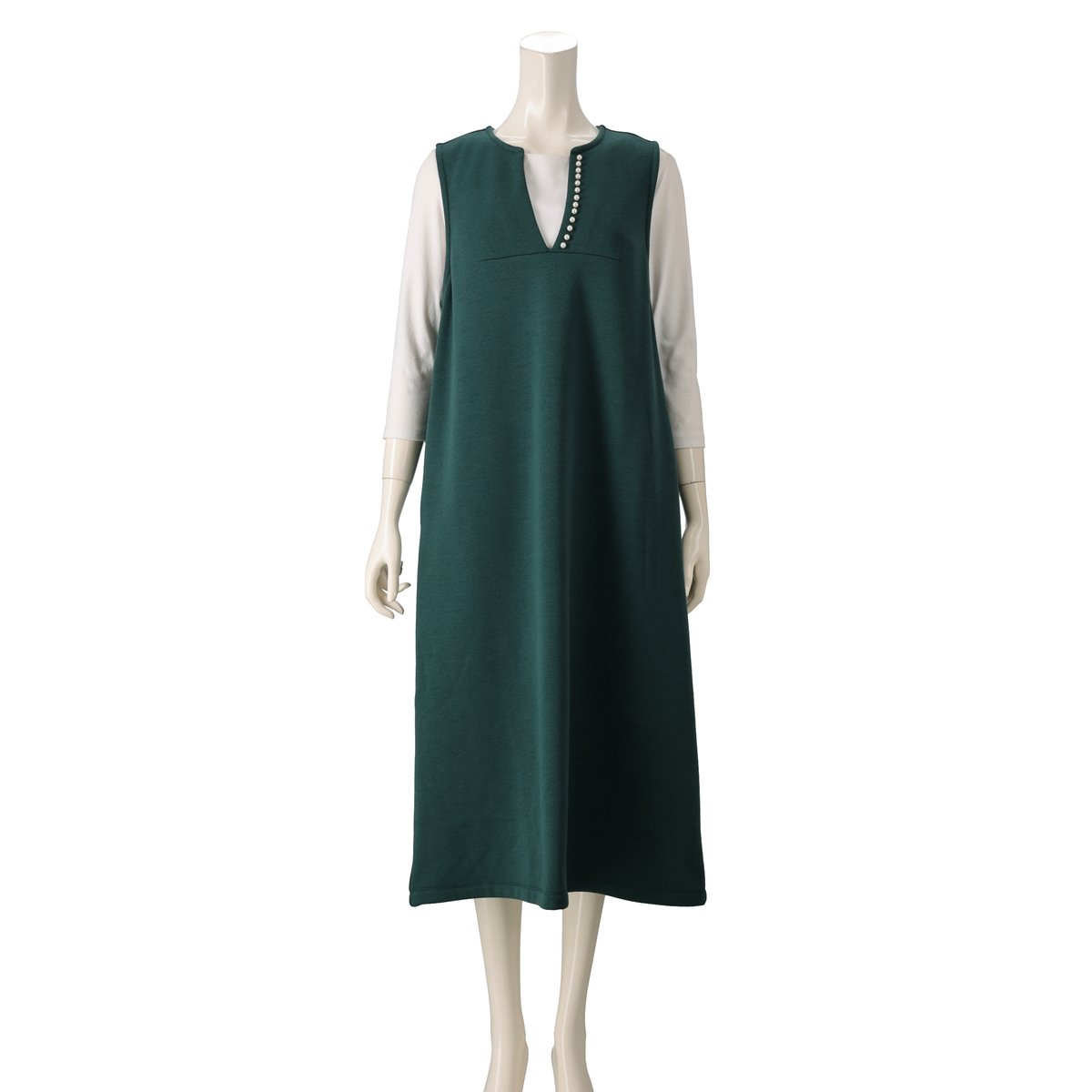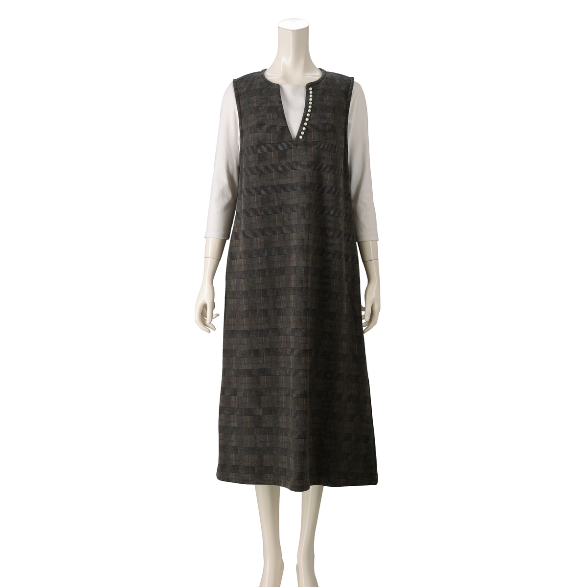 エニワイズ加工したジャンスカ。エニワイズ加工は、繊維中に油脂分が含まれているので、しっとりなめらかな肌ざわりです。肌寒い季節にぴったりの裏シャギー素材を使用しており、しっかりとした厚みがありながら伸縮性もよく、長時間着用しても窮屈さを感じにくい快適な着心地です