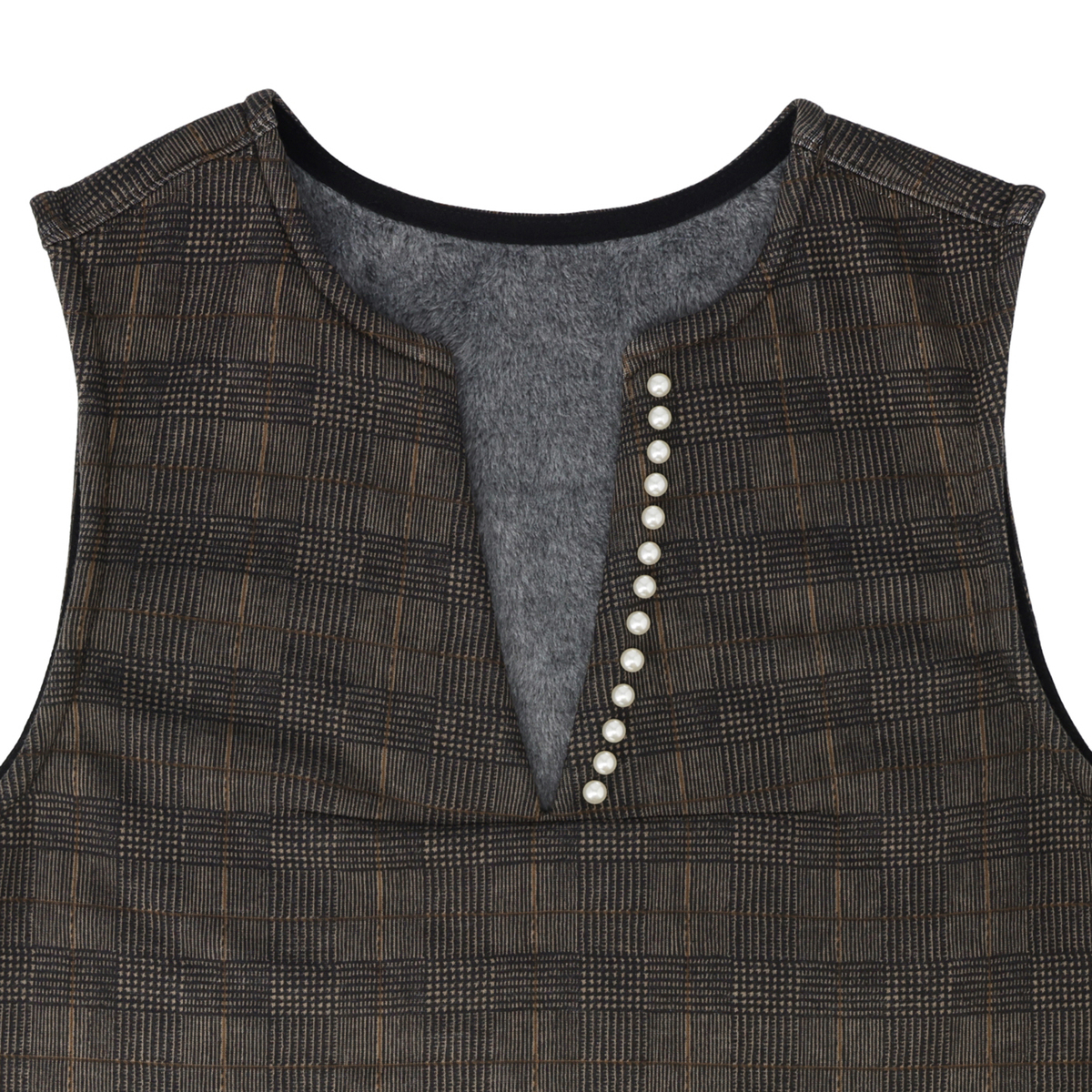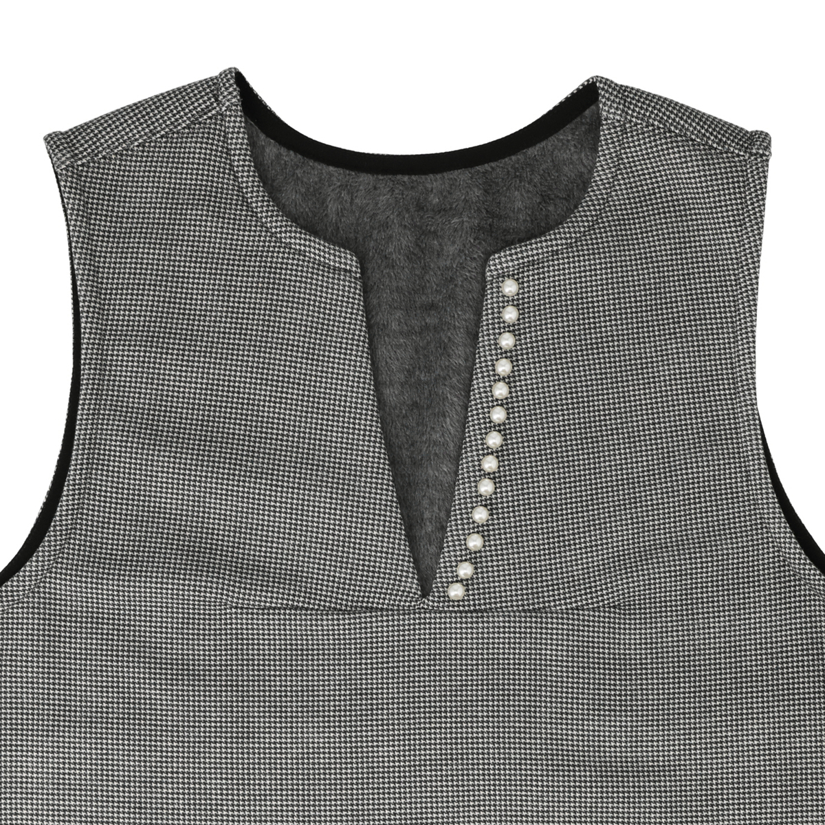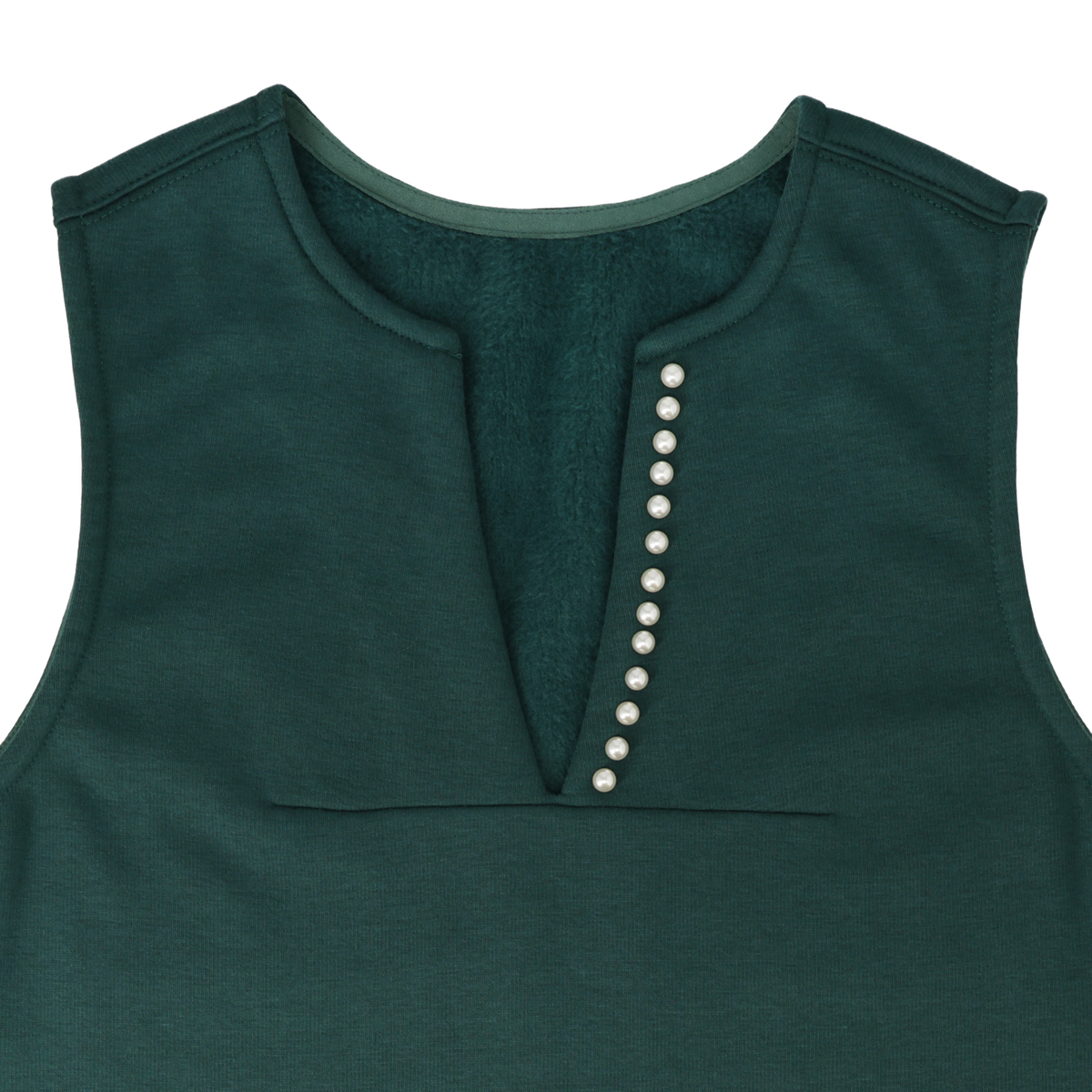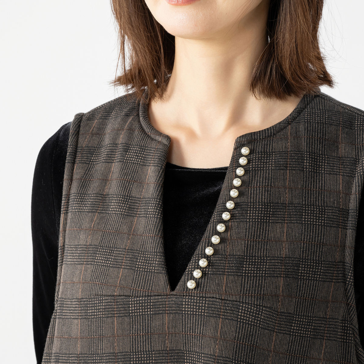 前身頃にあしらわれたパール調ボタンが、顔まわりに華やかさを添えます。上品で甘さのあるデザインに加え、縦のラインが全身をすっきりと見せてくれる視覚効果も期待できます