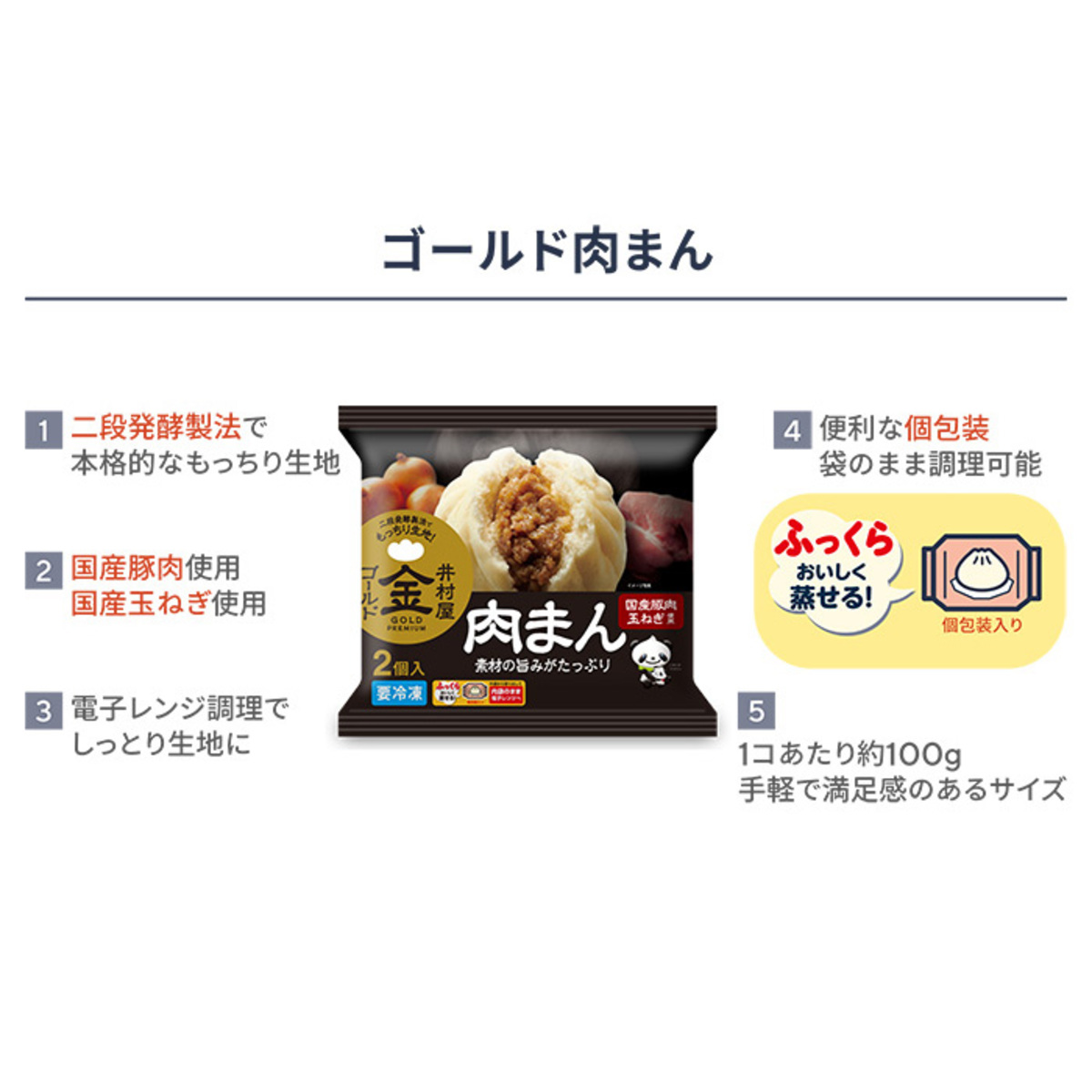 手包みしたような、本格的な生地を目指した「二段発酵製法」で仕上げた肉まん。発酵を2回行うことで、風味や旨み、もっちりとした食感を引き出した生地に。電子レンジで温めるだけで、包みたての美味しさを手軽に味わえます