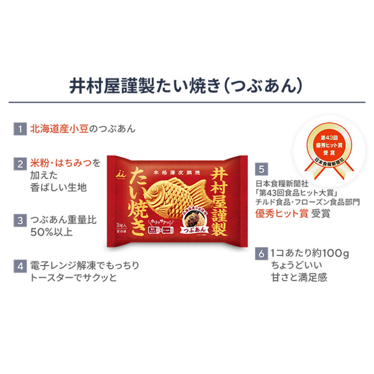 つぶあんたっぷりの本格薄皮たい焼きです。頭から尻尾の先まであんをたっぷりと楽しめます。米粉をブレンドした生地にはちみつを加えて香ばしく焼き上げ、カリッ!サクッ!食感に。電子レンジ解凍でもっちりと、追加のトースター調理でサクッと香ばしい焼きたてのような美味しさが楽しめます