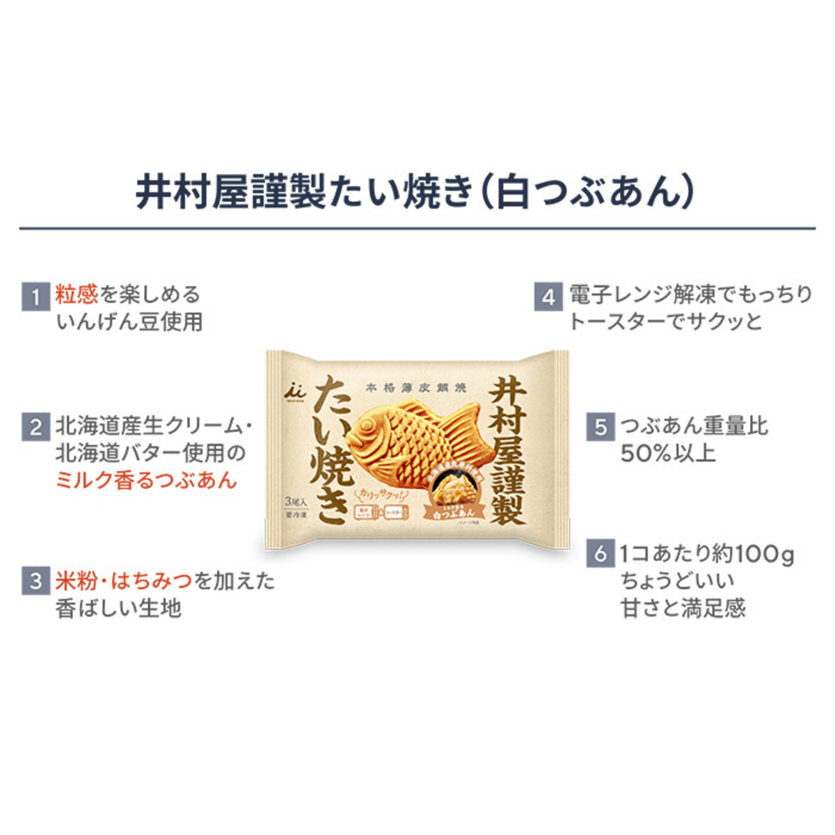 [アレルギー物質特定原材料8品目] 卵、小麦、乳 ※生地にはちみつを使用しています。1歳未満のお子様には与えないでください。 [内容量] 300g(3コ入)×8袋 [賞味期限] 出荷時点で賞味期限まで120日以上ある商品をお届けします [保存方法] 開封前:冷凍(ー18℃以下)で保管してください 開封後:開封・解凍後はお早めにお召し上がりください [お召し上がり方] 電子レンジで加熱 凍ったままの商品を袋から取り出し皿にのせてラップをかけずに下記の時間を目安に加熱してください ターンテーブルの端に置く ※ターンテーブルがない場合は中央に置いてください 調理時間の目安: 【500W】1個/1分30秒、2個/2分50秒、3個/4分 【600W】1個/1分20秒、2個/2分30秒、3個/3分40秒 ※調理時間の目安は機種により異なります ※冷たい場合は、10秒ずつ加熱を追加してください ※加熱しすぎると固くなったり、場合によっては黒く焦げて発火する事がありますのでご注意ください 【仕上げ】電子レンジ調理後、トースターで約2分加熱してください ※調理時間の目安は機種によって異なりますので表面が焦げないよう様子を見ながら加熱してください [注意事項] ※本品製造ラインでは、乳成分・大豆を含む製品を生産しています ※生地にはちみつを使用しています。1歳未満のお子様には与えないでください ※生地に黒い焦げが付いている場合があります ※ご家庭の冷凍庫は温度変動が大きいので、購入後は賞味期限内であっても早めにお召し上がりください ※一度解凍した商品を再び凍らせると品質が変わることがありますので、避けて下さい [原料原産地] つぶあん:つぶあん(砂糖、小豆、水あめ、食塩)(国内製造) 白つぶあん:(いんげん豆、砂糖、加糖練乳、脱脂粉乳、クリーム、バター、食塩)(国内製造) [原産国] 日本 [原材料] ■井村屋謹製たい焼き(つぶあん):つぶあん(砂糖、小豆、水あめ、食塩)(国内製造)、米粉、小麦粉、液卵、植物油脂、砂糖、コーンフラワー、はちみつ、果糖、食塩/膨脹剤、加工でん粉、(一部に小麦・卵を含む) ■井村屋謹製たい焼き(白つぶあん):白つぶあん(いんげん豆、砂糖、加糖練乳、脱脂粉乳、クリーム、バター、食塩)(国内製造)、米粉、小麦粉、液卵、植物油脂、砂糖、コーンフラワー、はちみつ、果糖、食塩/膨脹剤、加工でん粉、(一部に小麦・卵・乳成分を含む)