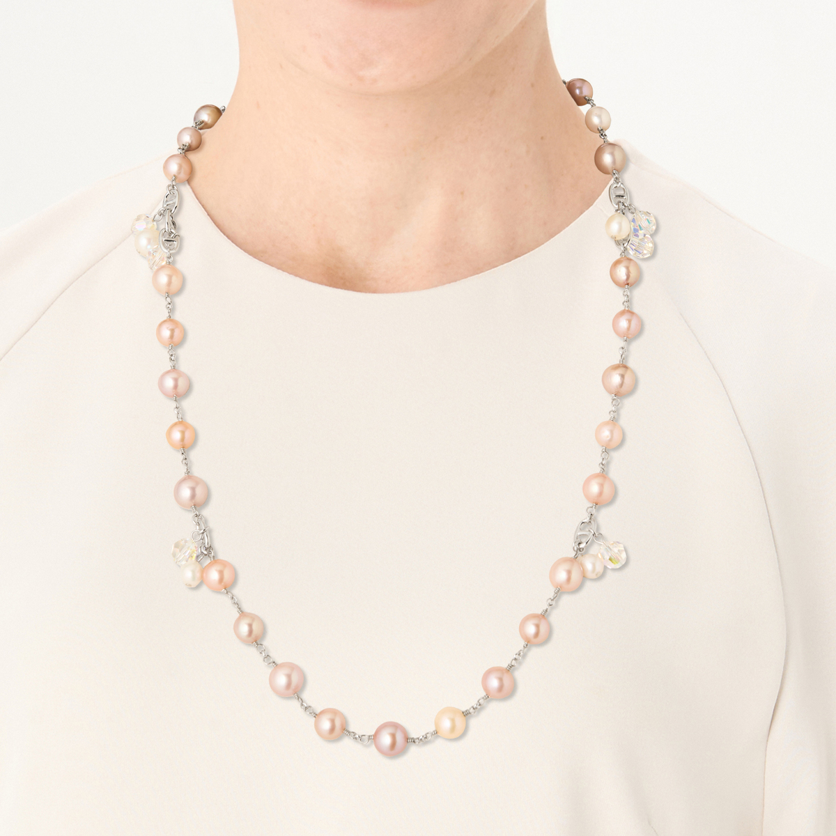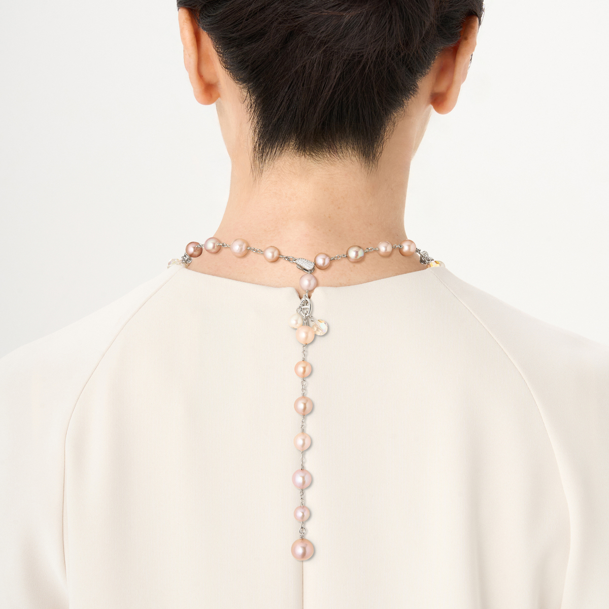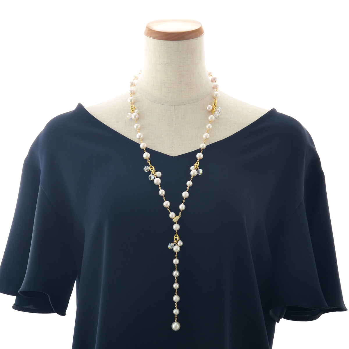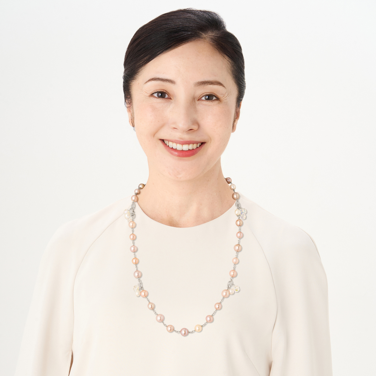 美しい照りと艶が魅力のオーロラリップル真珠を贅沢に連ねたロングネックレスです。クリスタルガラスとオーロラリップル真珠が揺れる、華やかさと上品さを兼ね備えたデザインに仕上げました。留め具は開閉式で、お好みの位置で留めることができます