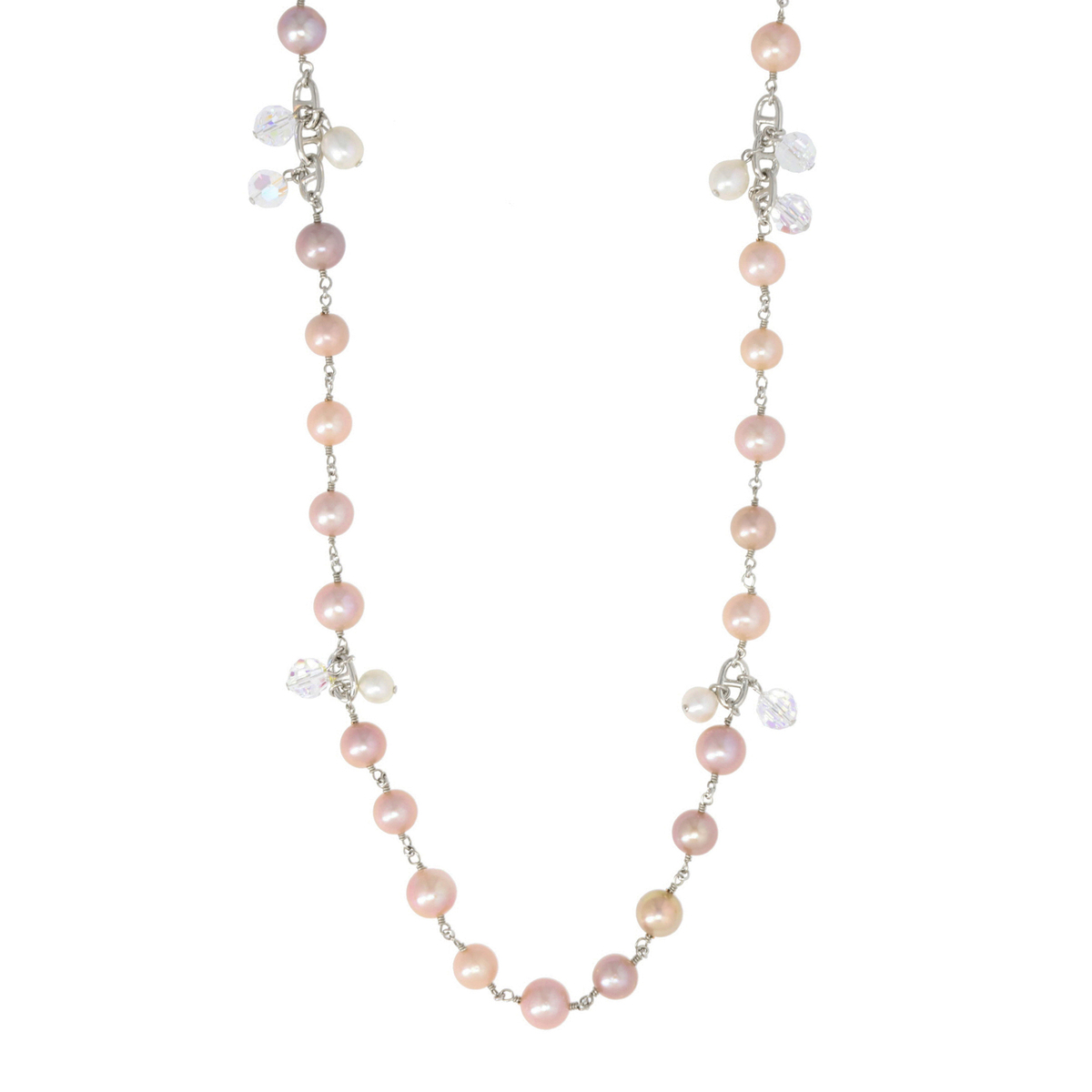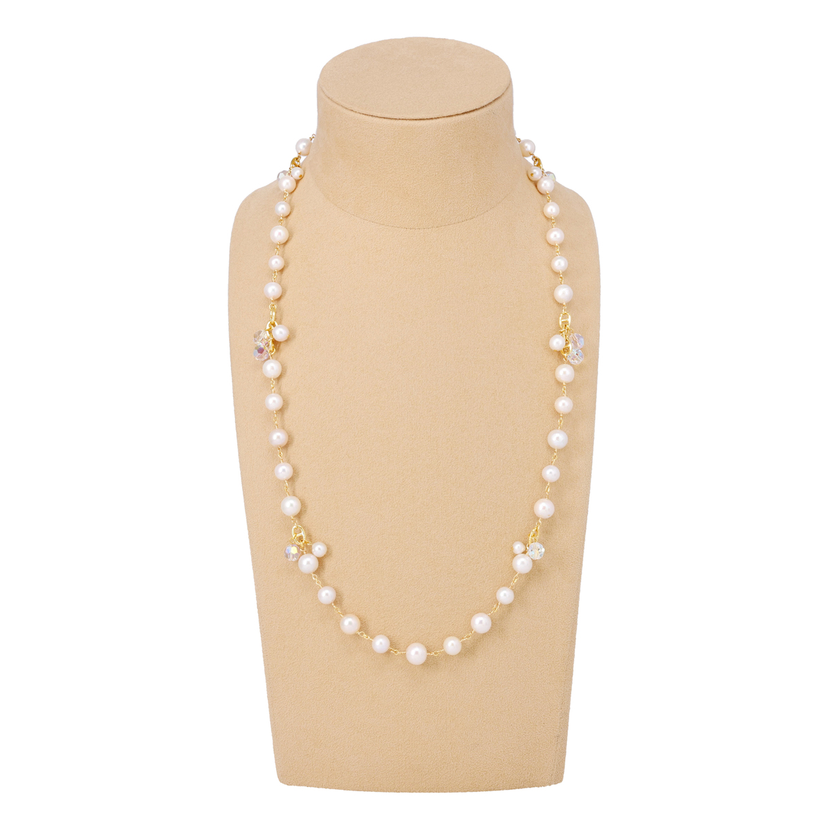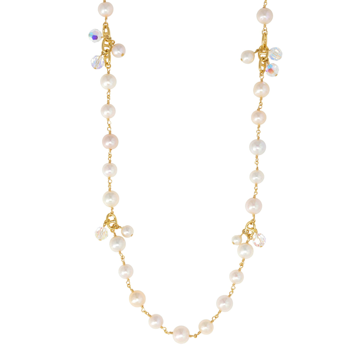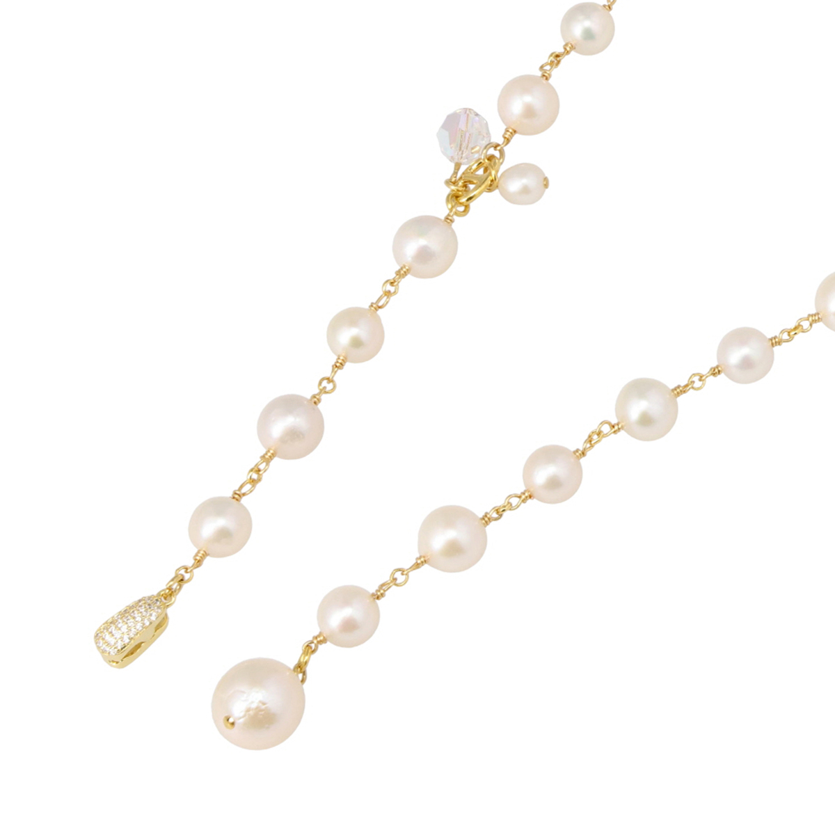 美しい照りと艶が魅力のオーロラリップル真珠を贅沢に連ねたロングネックレスです。クリスタルガラスとオーロラリップル真珠が揺れる、華やかさと上品さを兼ね備えたデザインに仕上げました。留め具は開閉式で、お好みの位置で留めることができます