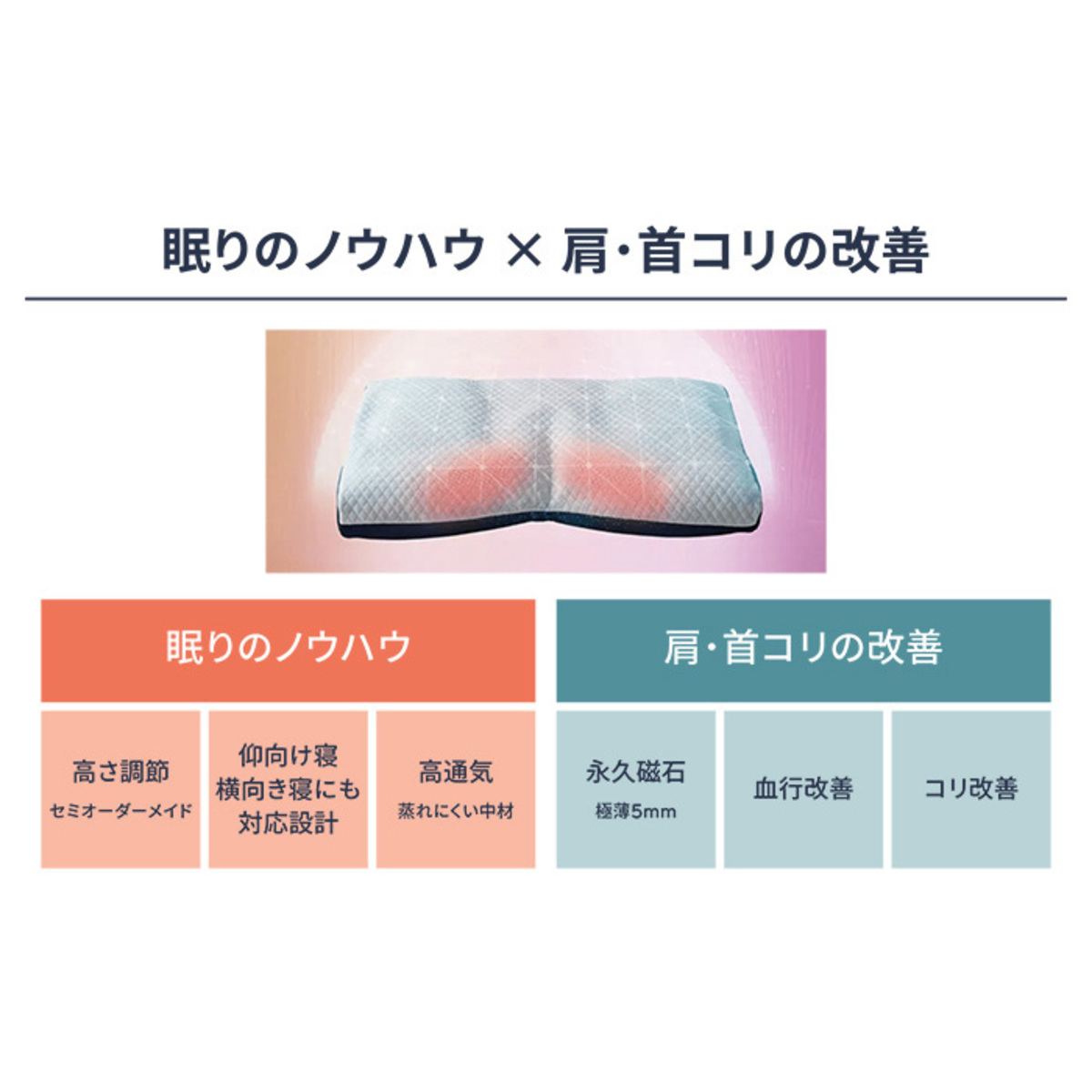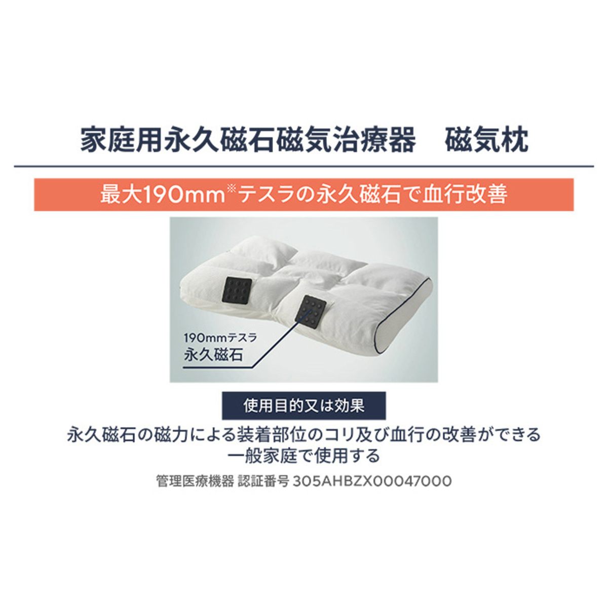 家庭用永久磁石磁気治療器(管理医療機器)として認証された枕です。永久磁石の磁力による装着部位のコリ及び血行の改善ができます