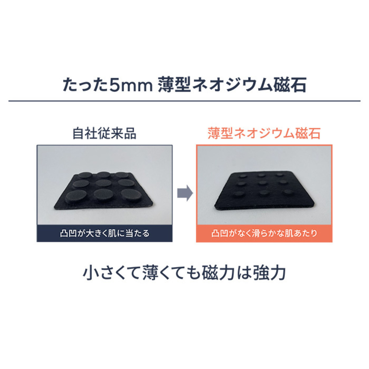 永久磁石にはネオジウム磁石を採用。最大磁束密度190ミリテスラ、厚さ5mmの薄型の磁石を1シートあたり9個、合計18個配置。磁石部分が表になるように左右のポケットに磁石シートを挿入し、専用カバーに入れてご使用ください