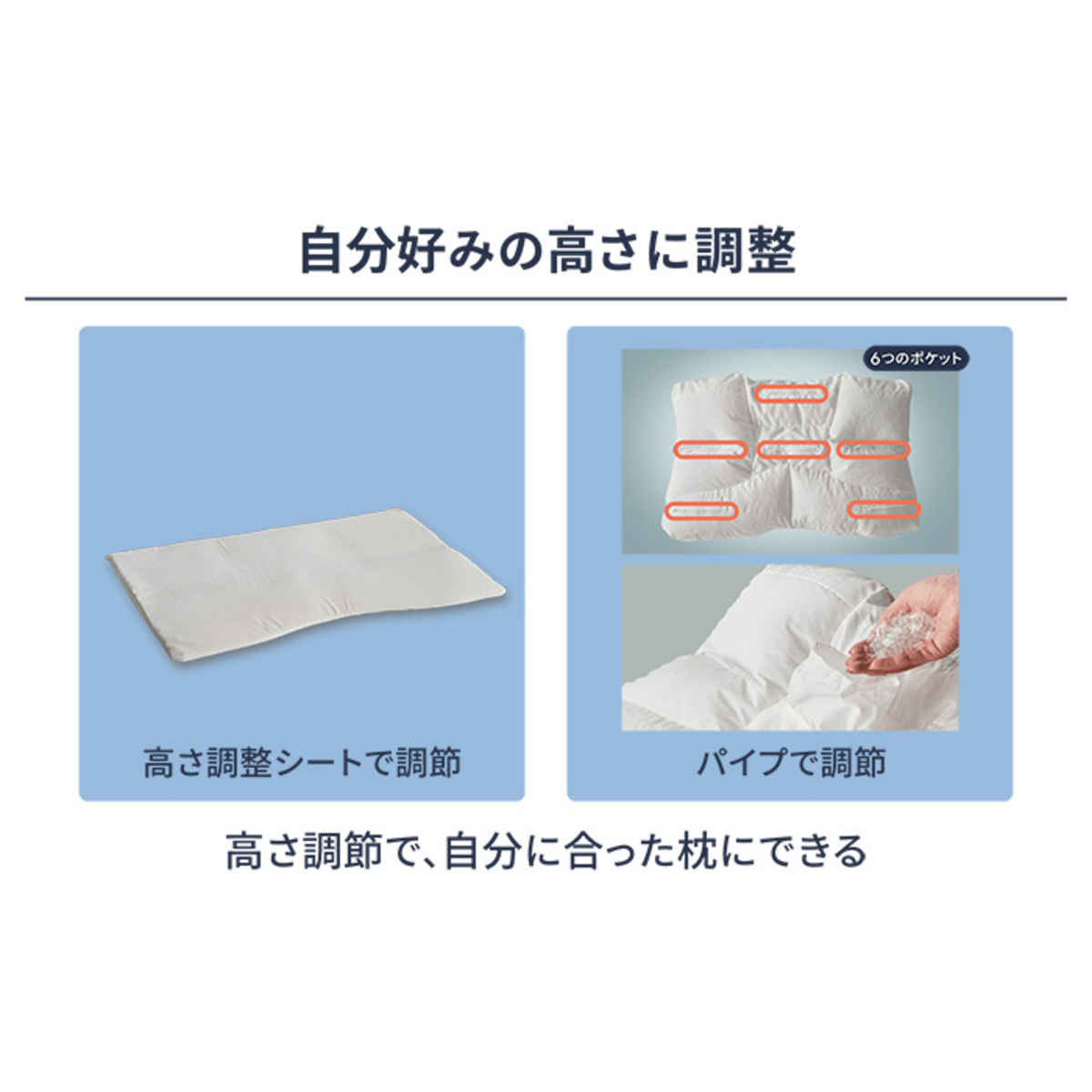 高さ調整シートを使用することで、自分の好みの高さに調節可能。各ポイントごとに調整ができる「6つのポケット」で中素材の分量を変え、自分に合った枕にカスタマイズできます
