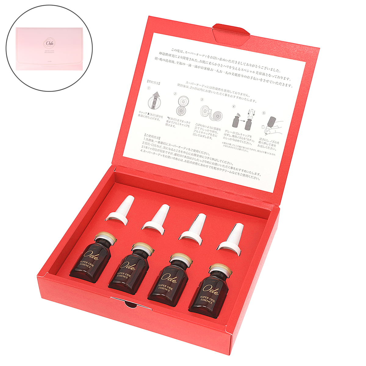 [セット内容] ・スーパーオーディ 15mL×4 ・キャップ×4 ・オーディモイストリラックスバスa 25g×3包(プレゼント) [使用方法] <スーパーオーディ> 1.洗顔後、一番最初にスーパーオーディをご使用ください 2.目元、口元など、気になるところを中心にお顔全体にうすく伸ばしてください 3.1本1ヶ月位が目安ですが、最初の1本目は少したっぷりめにお使いいただく事をおすすめいたします 4.スーパーオーディをお使いのあとは、お肌の状態にあわせて化粧水やクリームなどをご使用ください <オーディモイストリラックスバスa> 浴槽(約160L〜 200L)のお湯に本品(1包25g)を入れ、よくかき混ぜてください 【日本製】 [注意事項] <スーパーオーディ> ※お肌に異常が生じていないかよく注意して使用してください。化粧品がお肌に合わないとき、即ち次のような場合には、使用を中止してください。そのまま、化粧品類の使用を続けますと、症状を悪化させることがありますので、皮膚科専門医等にご相談されることをおすすめします (1) 使用中、赤味、はれ、かゆみ、刺激、色抜け(白斑等)、黒ずみ等の異常があらわれた場合 (2) 使用したお肌に、直射日光があたって上記のような異常があらわれた場合 ※傷やはれもの・湿しん等、お肌に異常のあるときはお使いにならないでください ※目に入った場合は、水で充分洗い流してください ※お子様の手の届かない所に保管してください ※極端に高温または低温の場所、直射日光のあたる場所には保管しないでください ※高濃度のため卵殻膜が沈遊・沈殿する場合がございます。白濁したように見えることもございますが品質には問題ございませんのでそのような場合は振ってからご使用ください ※本製品は防腐剤を使用しておりません ※開封後は2ヶ月以内のご使用をお願い致します <オーディモイストリラックスバスa> ※「とろみ成分」で床や浴槽が大変滑りやすくなりますので、小さいお子様や高齢者の方、妊娠中の方の入浴は特にご注意ください ※本品を床等にこぼしたまま放置すると水を吸収し、すべりやすくなりますのですぐに取り除いてください ※お湯から上がる際、身体に付着した「とろみ成分」で、転倒しないよう充分にご注意ください ※お湯を抜いた後、浴槽の底に「とろみ成分」が残ると大変滑りやすくなりますので、すぐに浴槽を洗ってください ※皮膚あるいは体質に異常がある時は使わないでください ※使用中や使用後、皮膚に発疹、発赤、かゆみ、刺激感などの異常があらわれた場合、使用を中止し医師にご相談ください ※本品が目に入った場合はこすらず直ちに水またはぬるま湯で十分に洗い流してください。目に異物感が残る場合は、眼科医にご相談ください ※入浴以外の用途には使用しないでください ※本品は食べられません。万一大量に飲み込んだ場合は、水を飲ませる等の処置を行った後、医師にご相談ください ※開封後はすぐにお使いください。1 回で1 包分を使い切ってください ※本品は浴槽・風呂釡を傷めるイオウは入っておりません ※全自動給湯機・24 時間風呂でのご使用はお控えください。ろ過機(フィルター)が目詰まりする等、浴槽や風呂釡を傷める可能性があります ※使用後の二度焚きはおやめください。誤って二度焚きした場合は、風呂釡・フィルターを洗い流してください ※残り湯を長く放置しないでください ※残り湯は洗濯に使わないでください ※浴槽のお湯は洗髪に使用しないでください ※衣類につけないようにご注意ください。しみになる場合があります ※残り湯は植物の水やりに使用しないでください ※乳幼児の手の届かない所に保管してください ※高温多湿の場所や直射日光のあたる場所には置かないでください [成分] スーパーオーディエクストラリッチ: 水、BG、加水分解卵殻膜、ヒアルロン酸Na、スクワラン、加水分解シベルリンドネラ多糖体、ポリクオタニウム-51、センチフォリアバラ花油 オーディ モイストリラックスバスa: スクロース、グルタミン酸Na、PEG-115M、シリカ、加水分解卵殻膜、カミツレ花エキス、グリチルリチン酸2K、加水分解シルク、ヒアルロン酸Na、スクワラン、ホホバ種子油、サクシノイルアテロコラーゲン、プロテアーゼ、リパーゼ、ブドウ種子油、 パルマローザ油、 パチョリ葉油、オオバナソケイ花エキス、ダイウイキョウ油、エンピツビャクシン油、 ニオイテンジクアオイ油、 水、セルロースガム、o-シメン-5-オール、エタノール、BHT、 酸化チタン