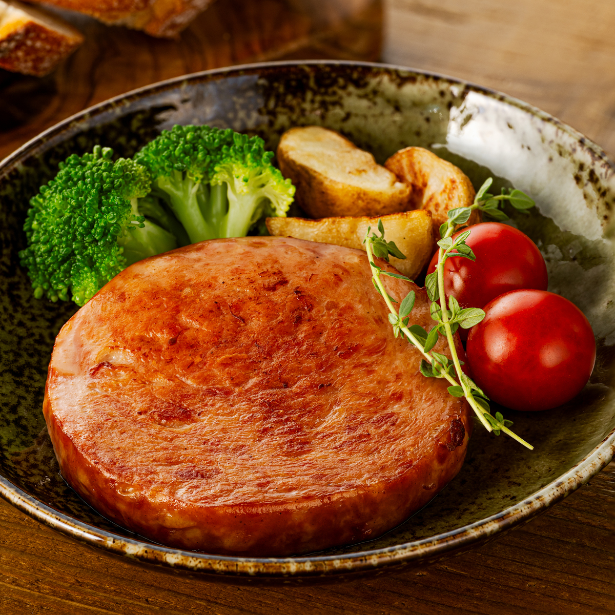 豚肉のみを使用したソーセージを厚切りのステーキ状に仕上げました