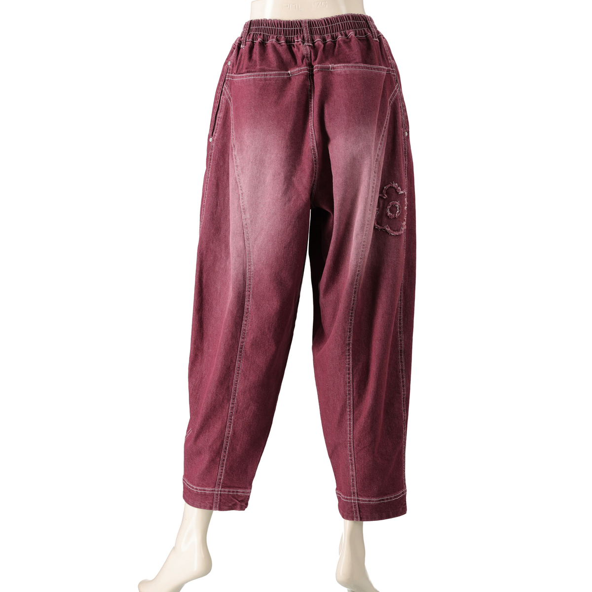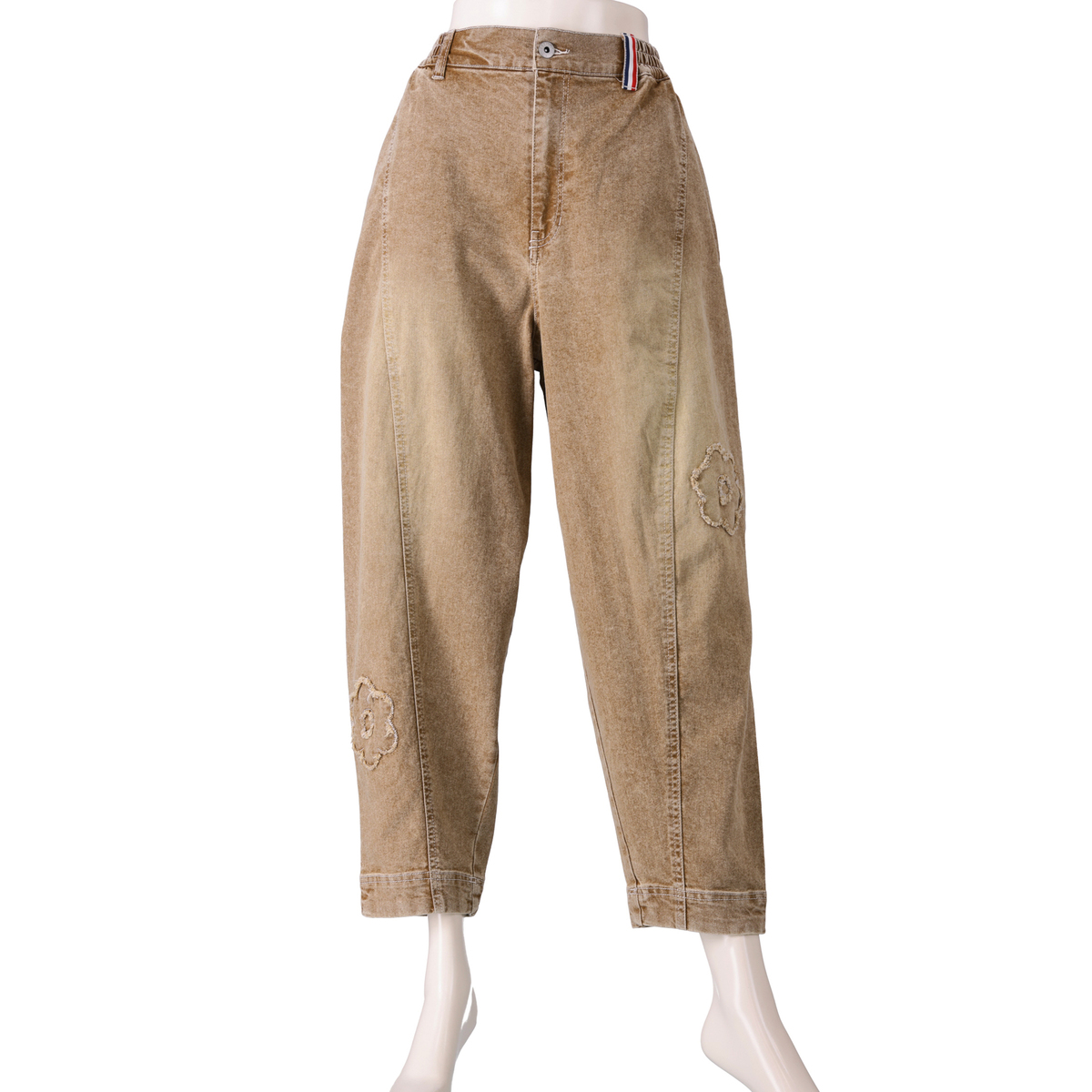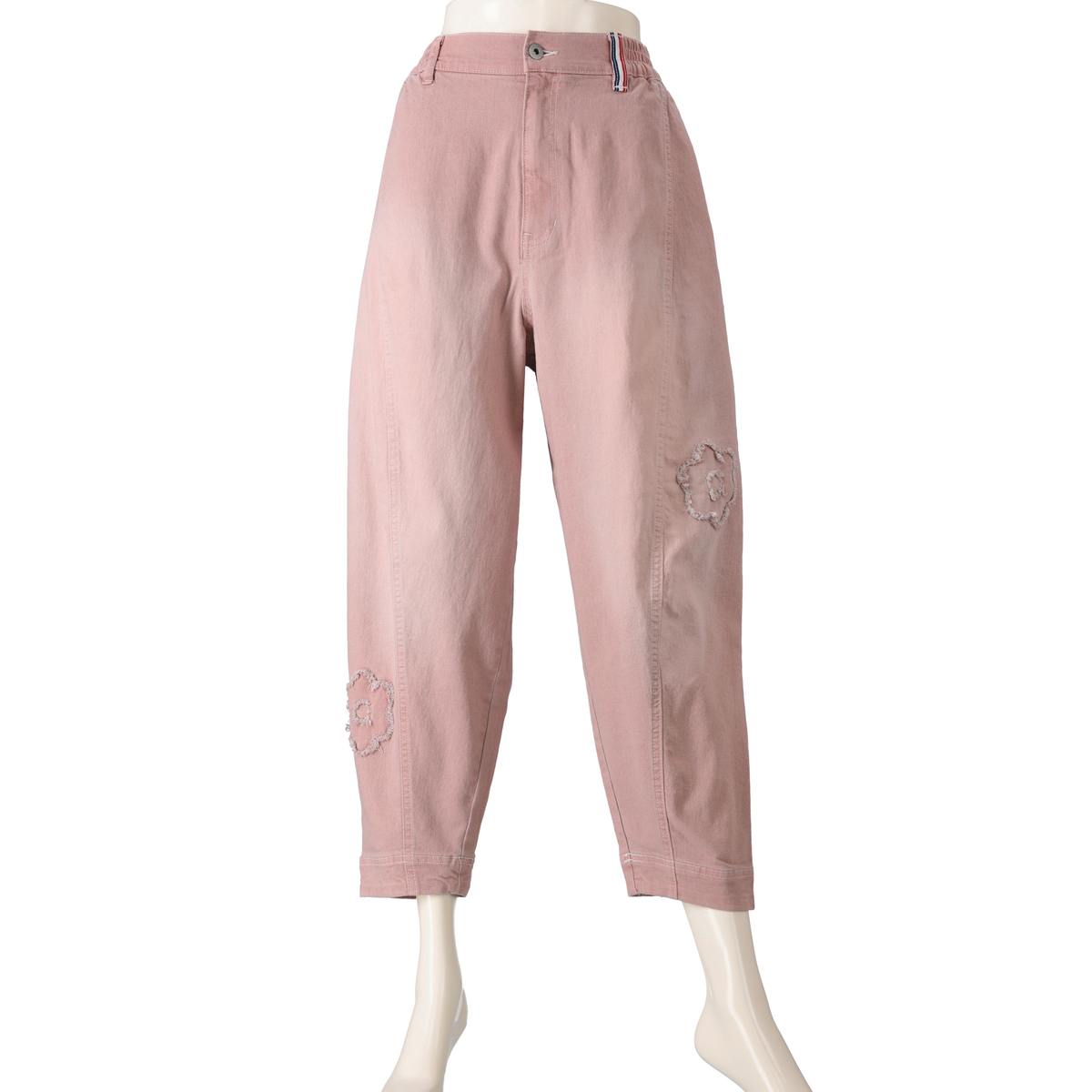 フラワーアップリケが大人可愛いキャットパンツ。お腹周りとヒップ周りにゆとりを持たせたパターンで、裾にかけて細くなっているテーパードシルエットです。足首が見える短め丈で、ロング丈のパンツが苦手な方にもおすすめです