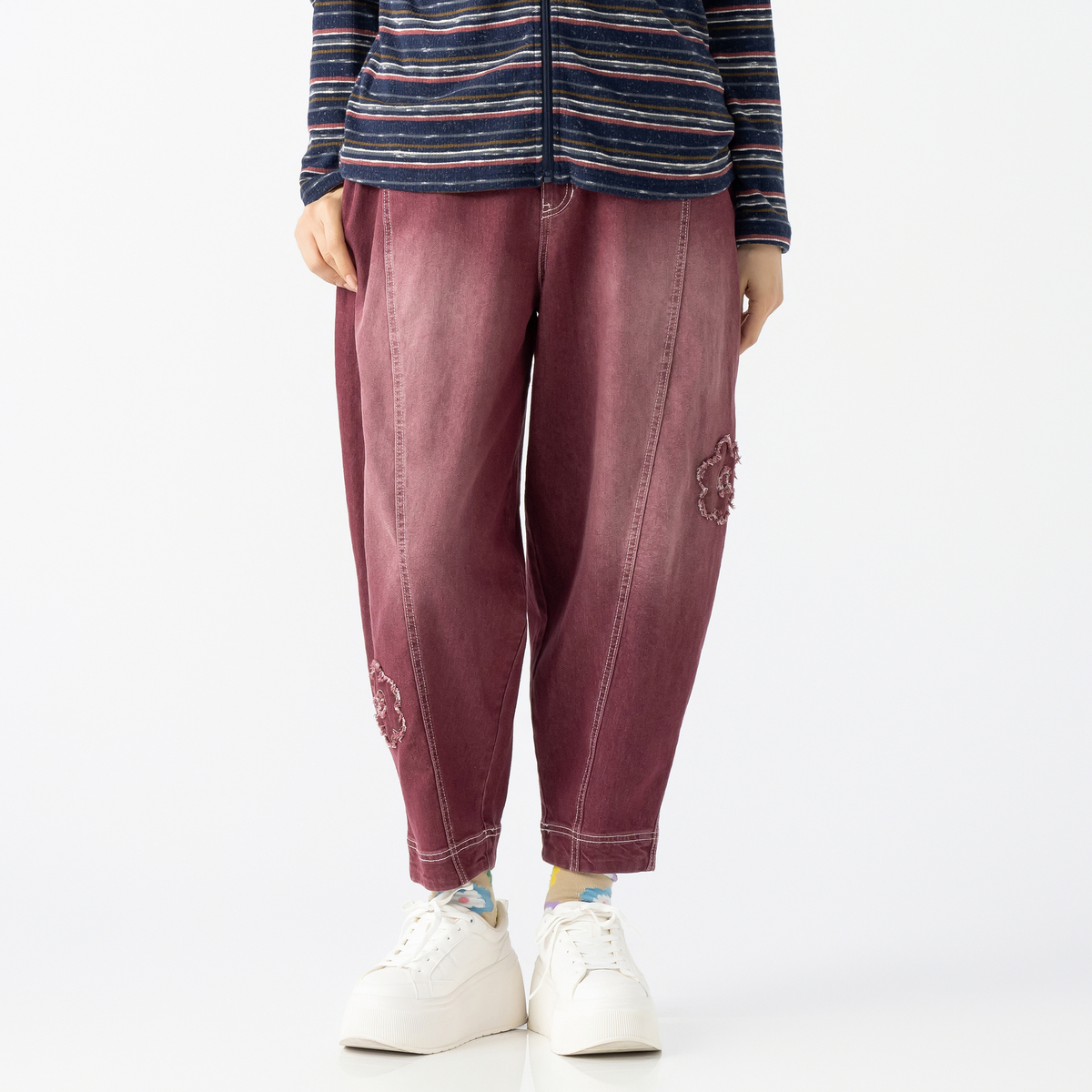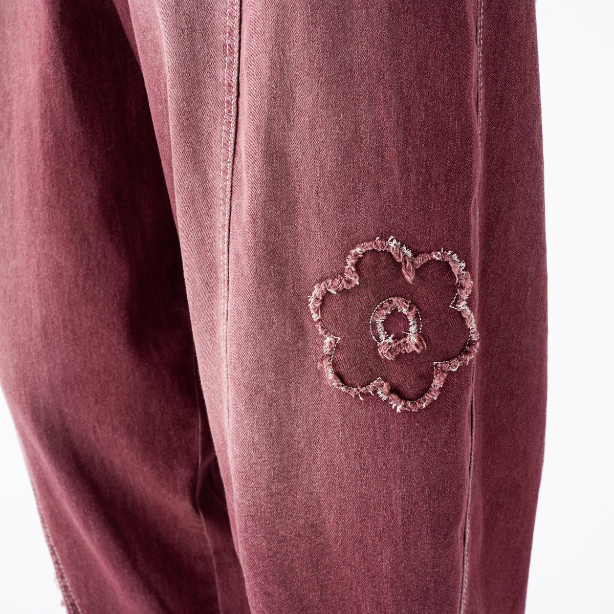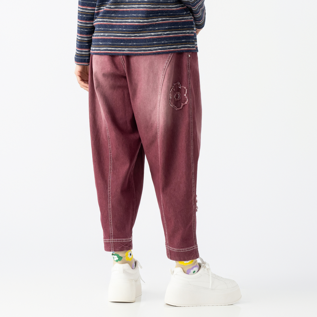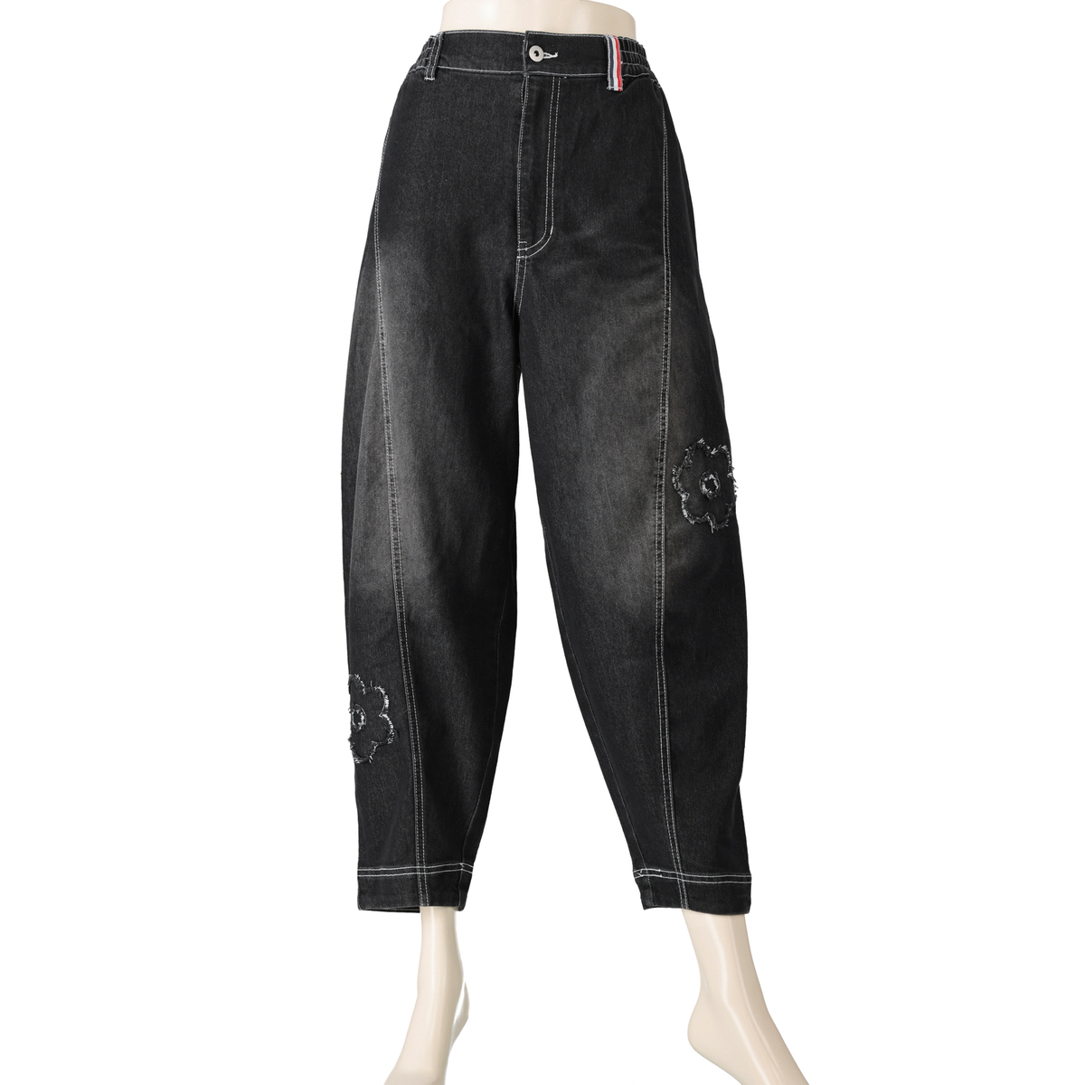 フラワーアップリケが大人可愛いキャットパンツ。お腹周りとヒップ周りにゆとりを持たせたパターンで、裾にかけて細くなっているテーパードシルエットです。足首が見える短め丈で、ロング丈のパンツが苦手な方にもおすすめです