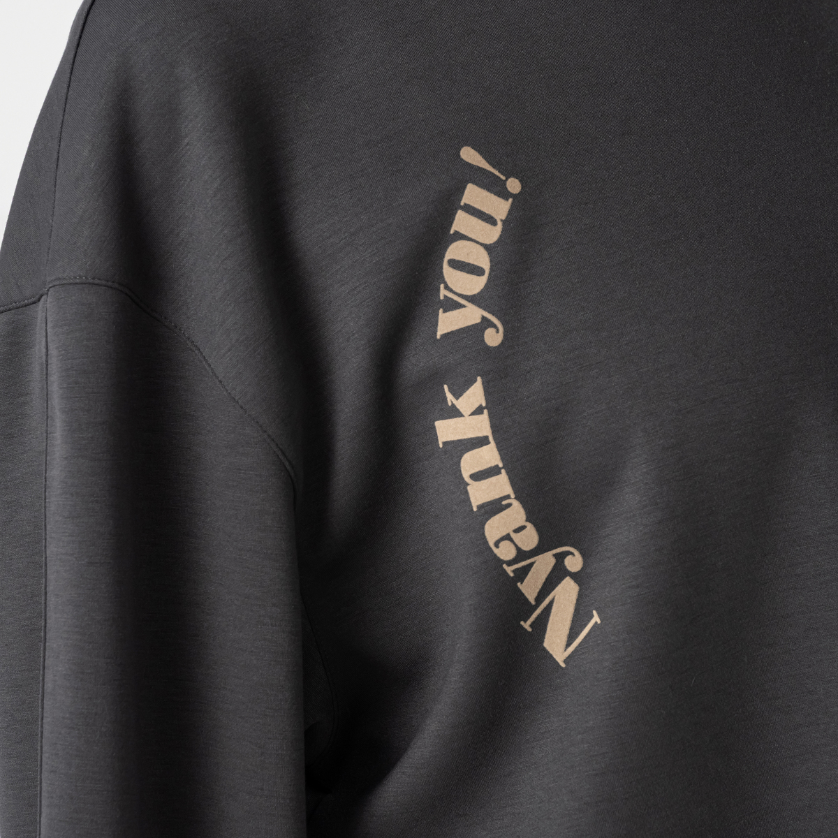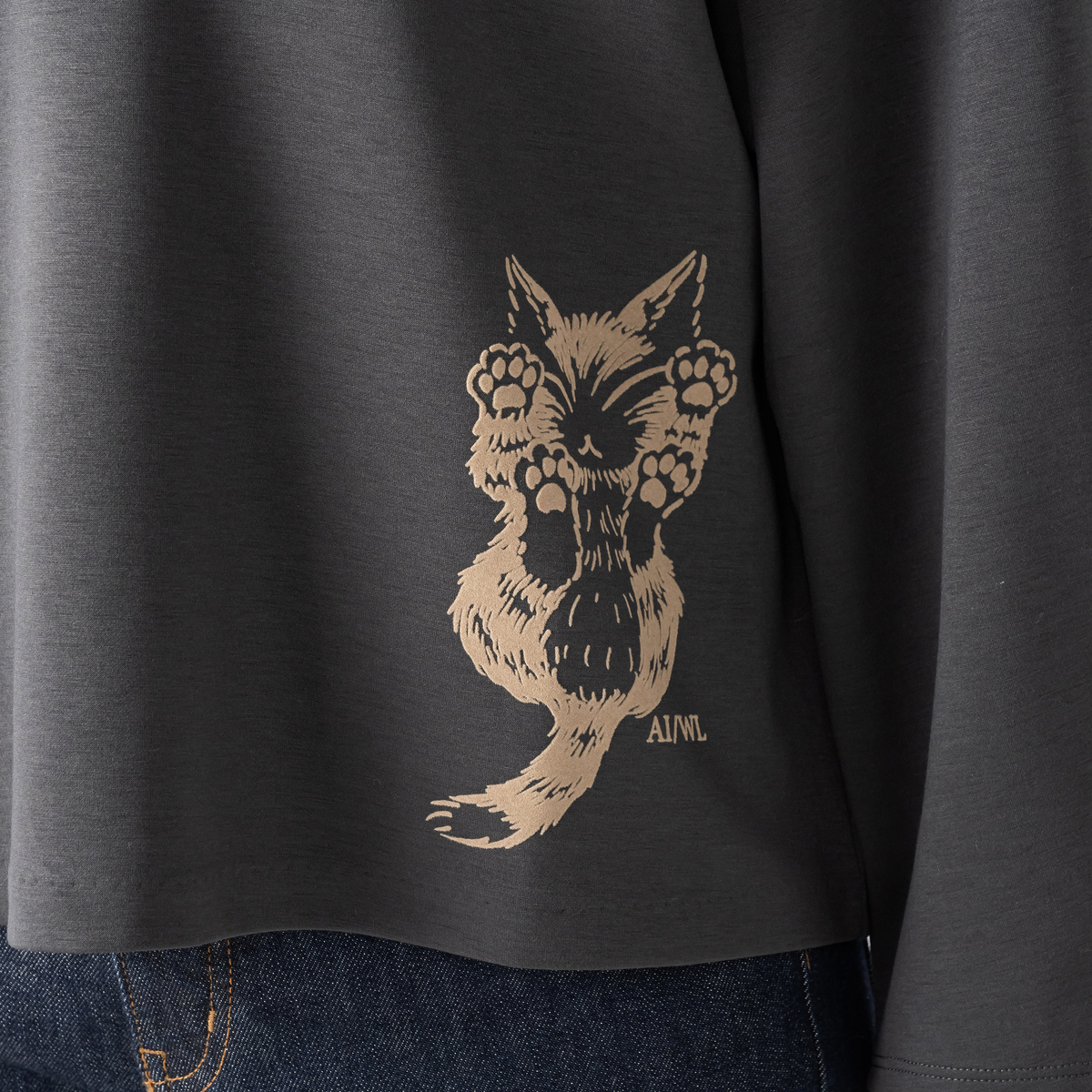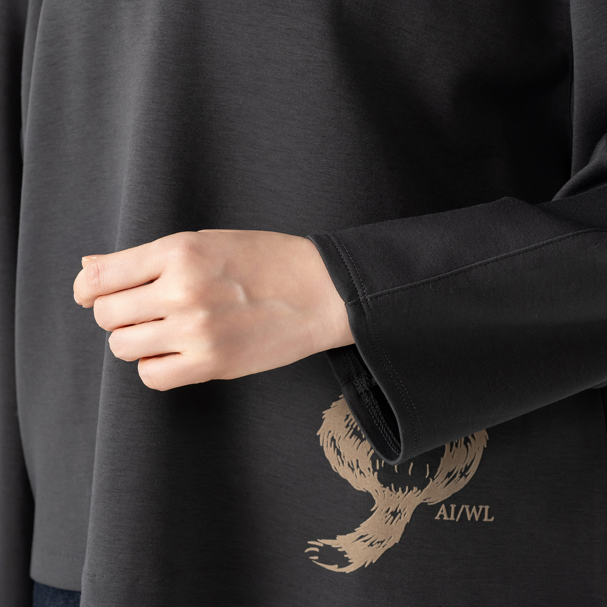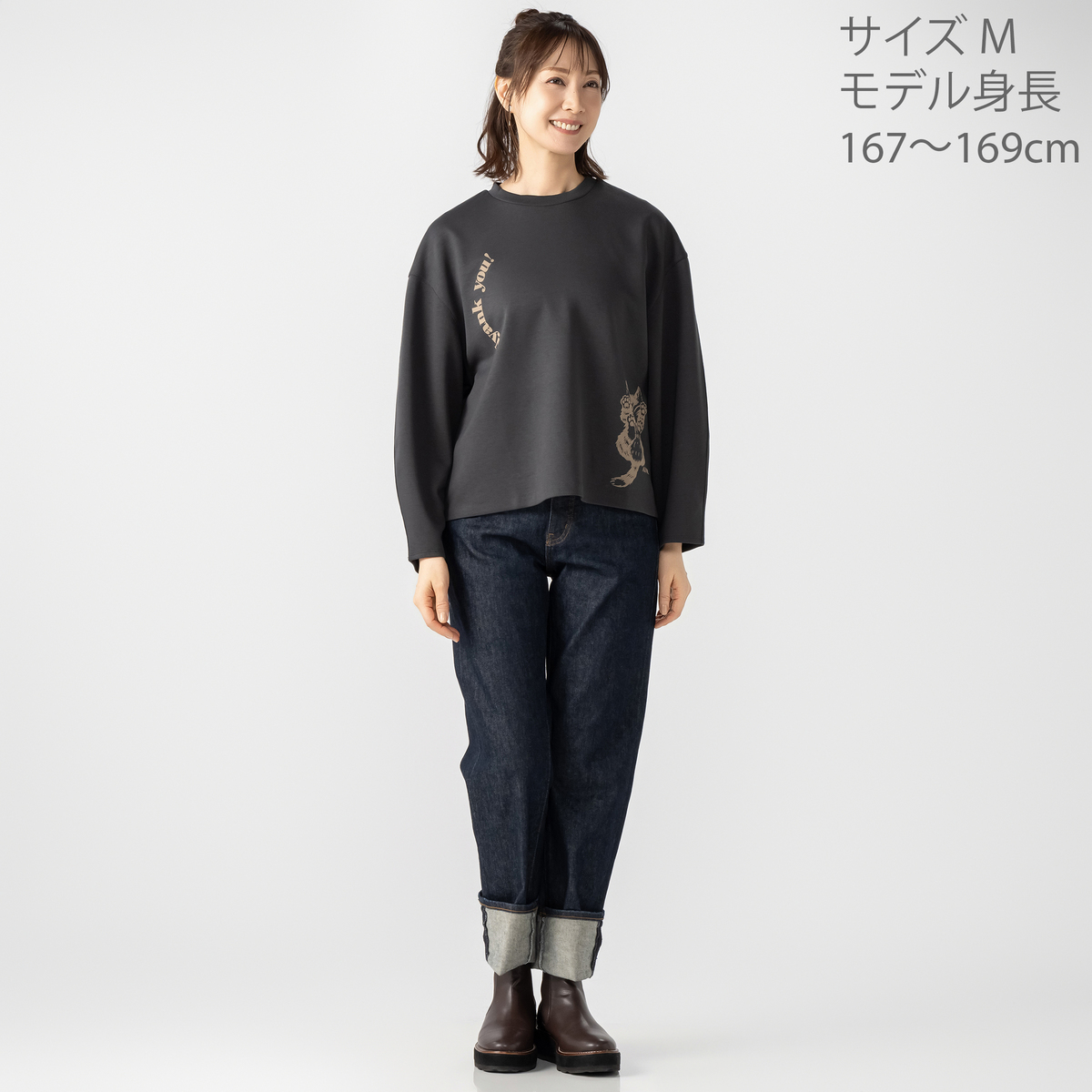 わちふぃーるどのプリントプルオーバー。ストンとしたボクシーなシルエットで体型を拾いにくく、リラックス感のある着心地です