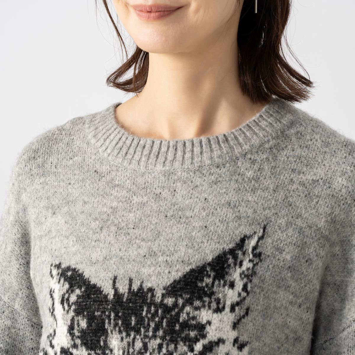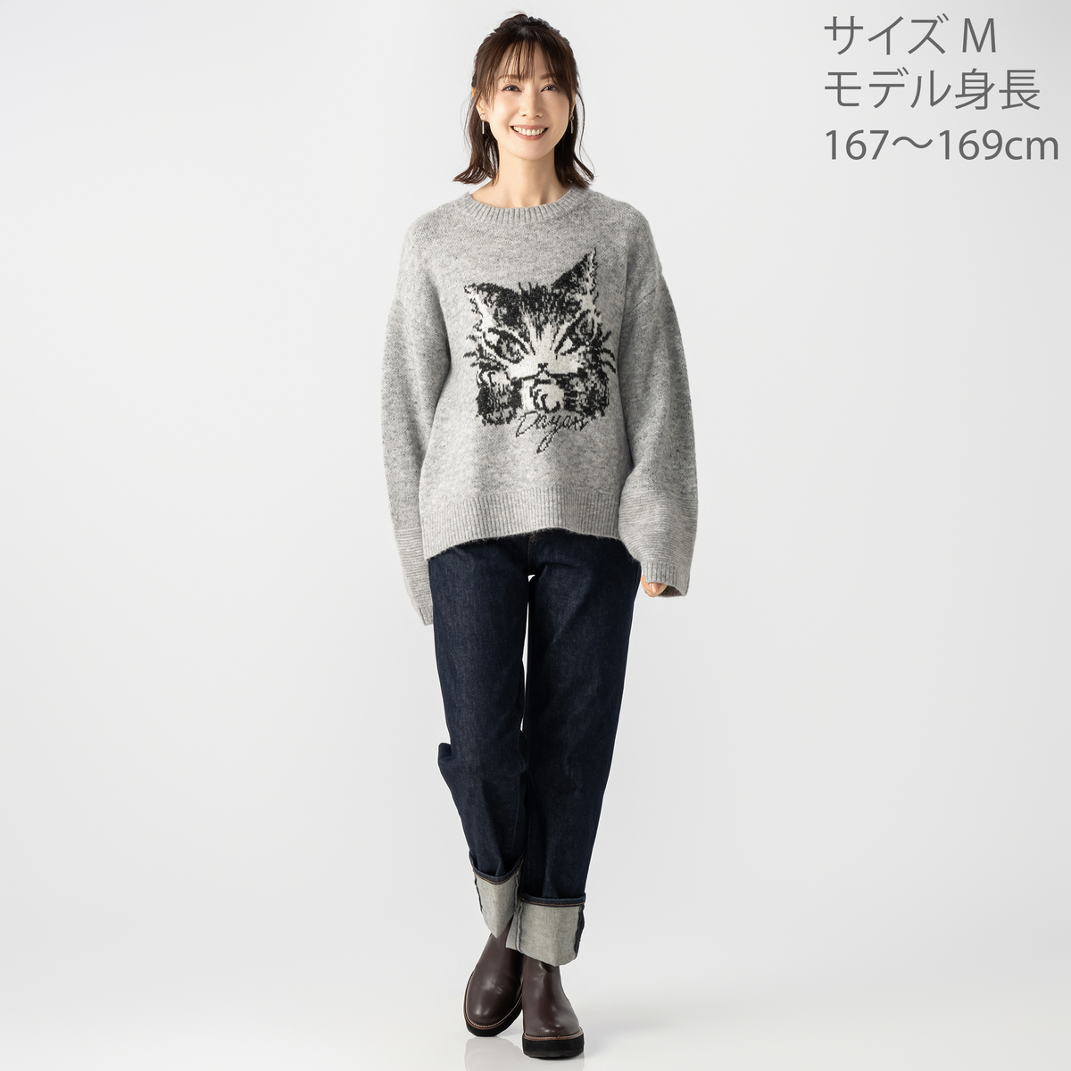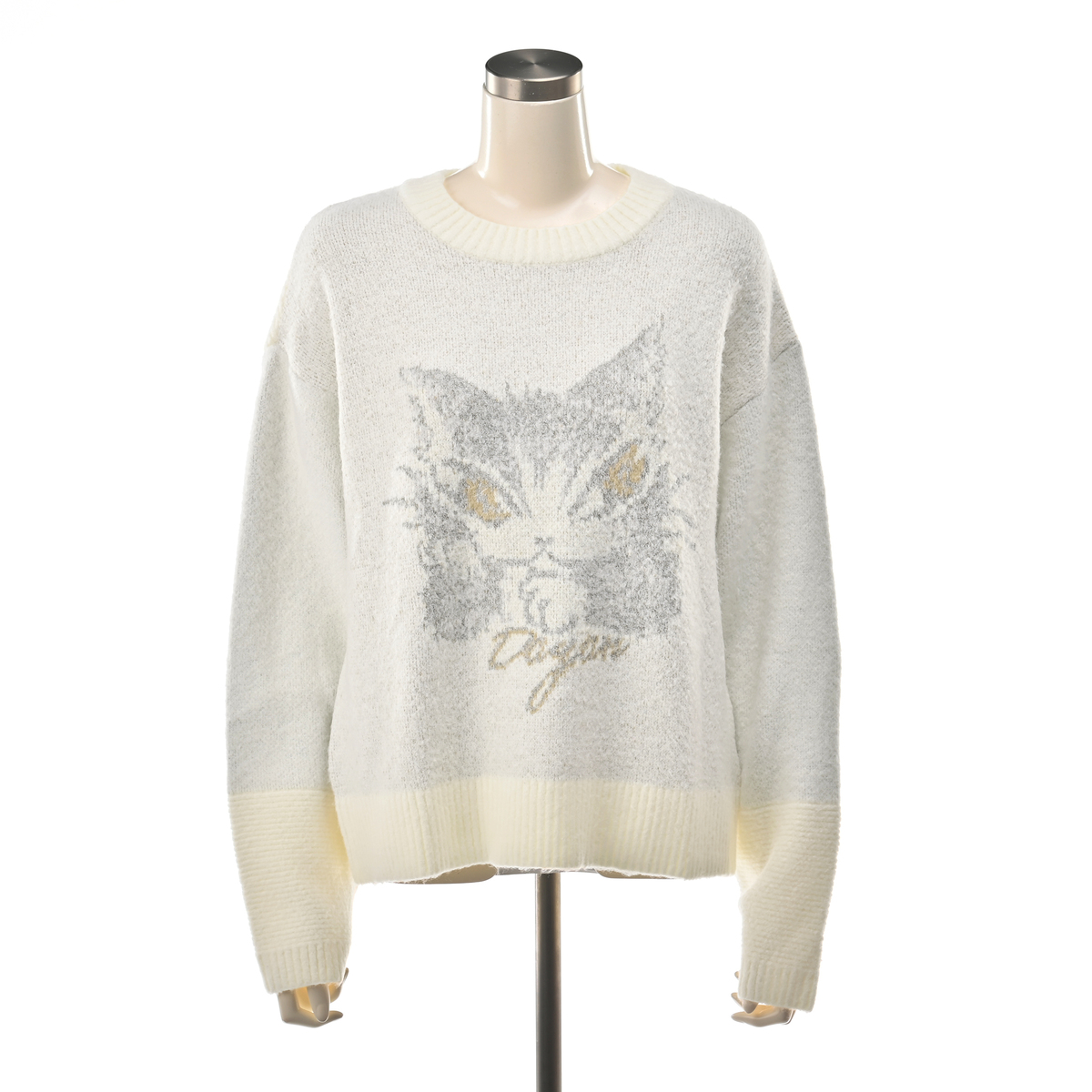 ふわふわの糸で編み上げた、愛らしいダヤンのアップフェイスが映えるニットプルオーバー。4色の糸で編み上げたジャガード組織が、ダヤンの表情を豊かに再現しています