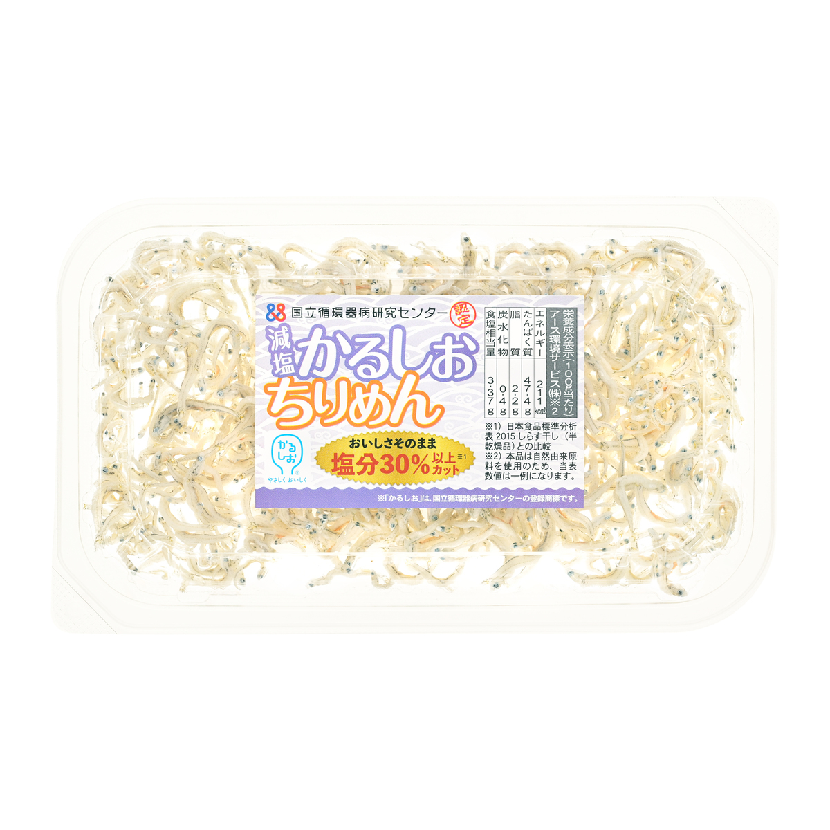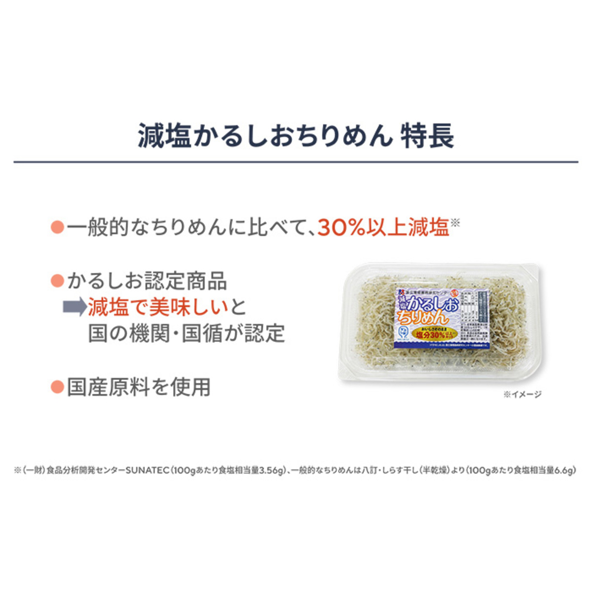 *1)(一財)食品分析開発センターSUNATEC(100gあたり食塩相当量3.56g)、一般的なちりめんは八訂・しらす干し(半乾燥)より(100gあたり食塩相当量6.6g)
