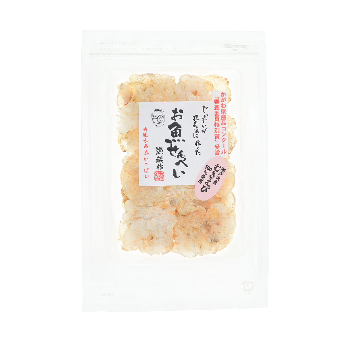頭と殻を取り除いたむきえびを使ったせんべいです。おやつや小腹が空いた時など、家族みんなでお楽しみいただけます