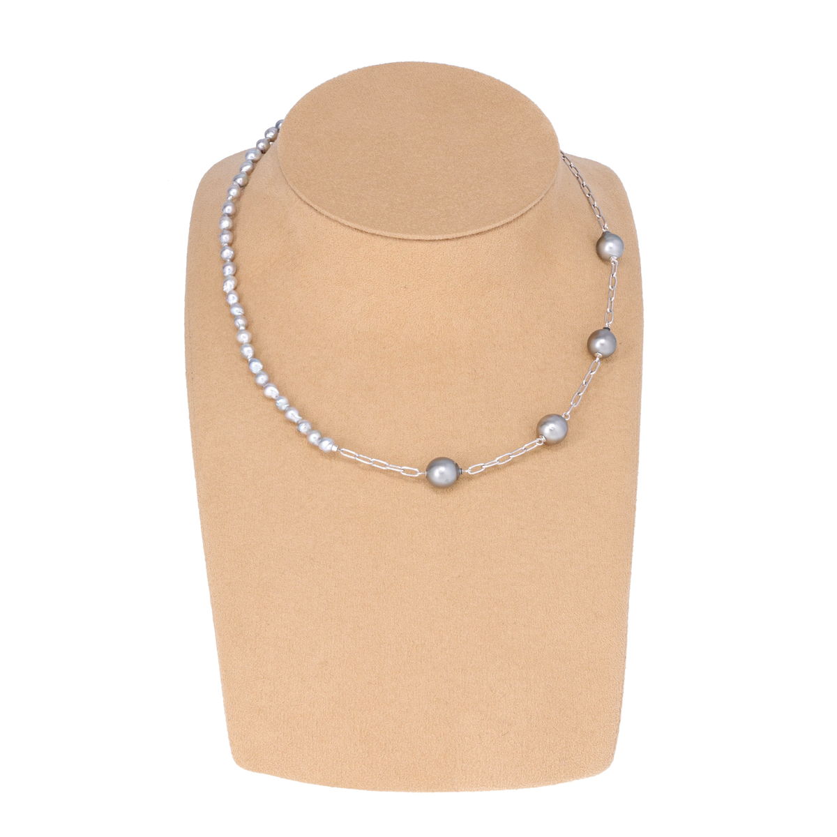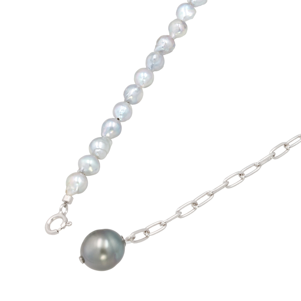 黒蝶真珠とアコヤ真珠を組合せたネックレス。自然な風合いを感じるバロック珠が胸元に華やかさを添え、シルバー系の色合いがコーディネートを引き立てます。アシンメトリーな配置が個性を際立たせ、服装を選ばず幅広いスタイルに合わせやすいアイテムです