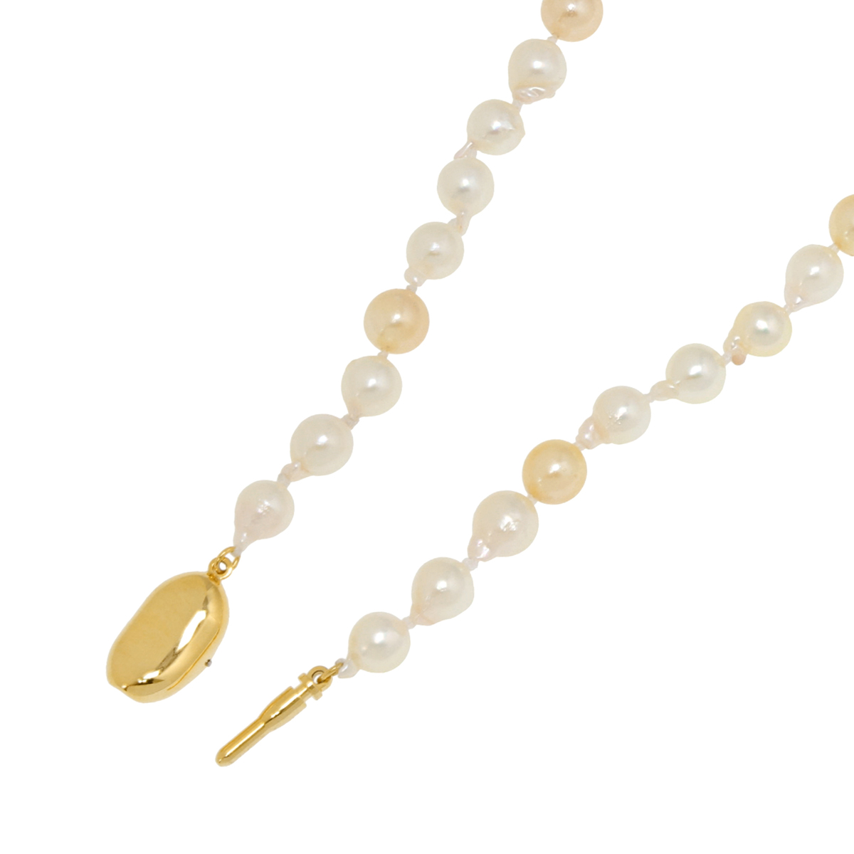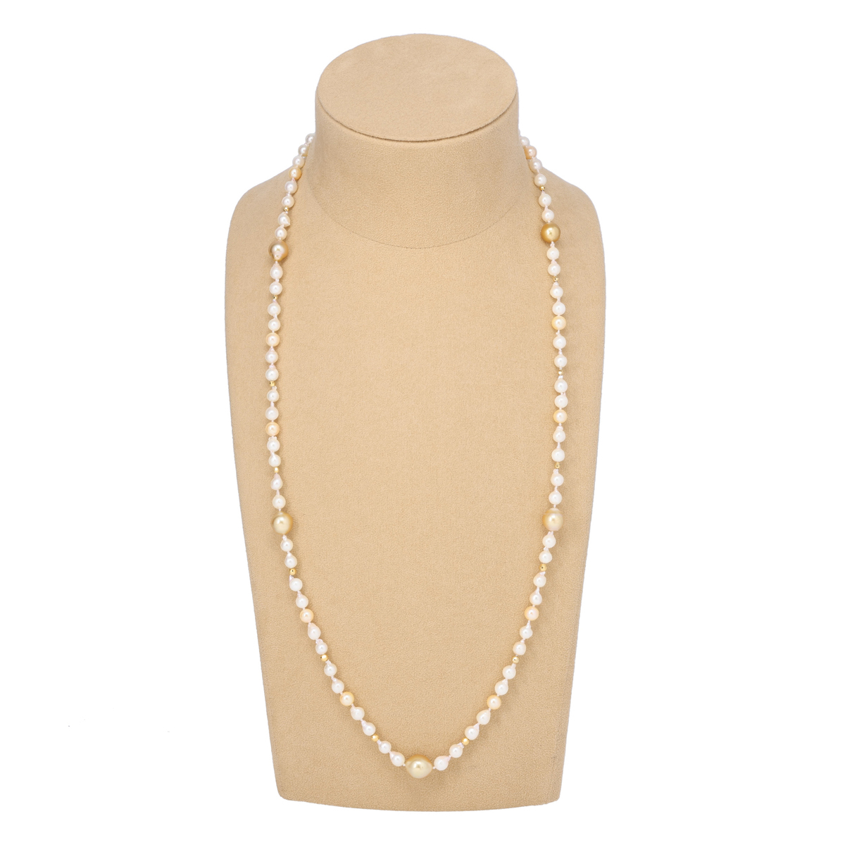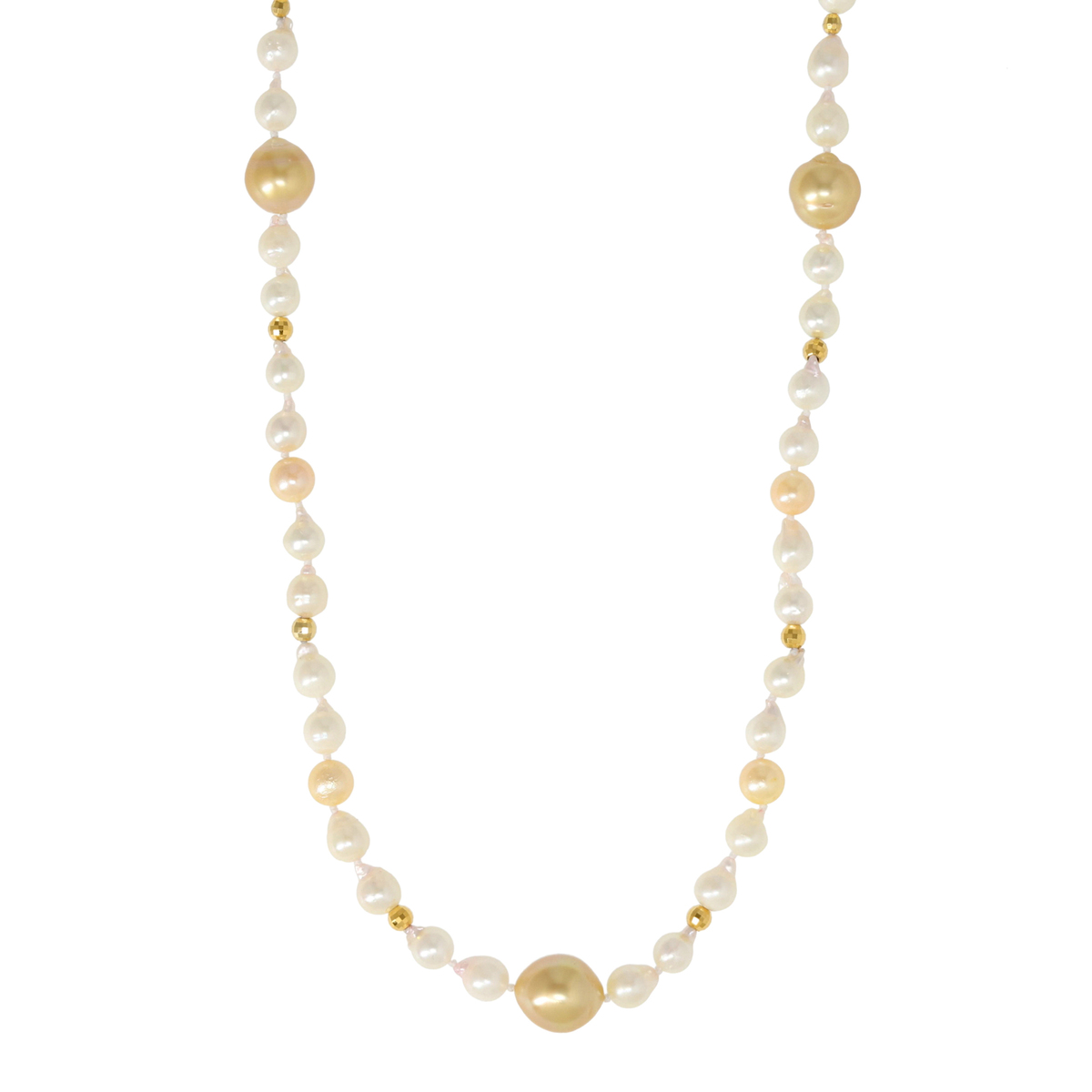 白蝶真珠のゴールドカラーとアコヤ真珠をミックスしたネックレスです。自然な形のバロックシェイプにこだわり、大珠の南洋をステーション状に配しています