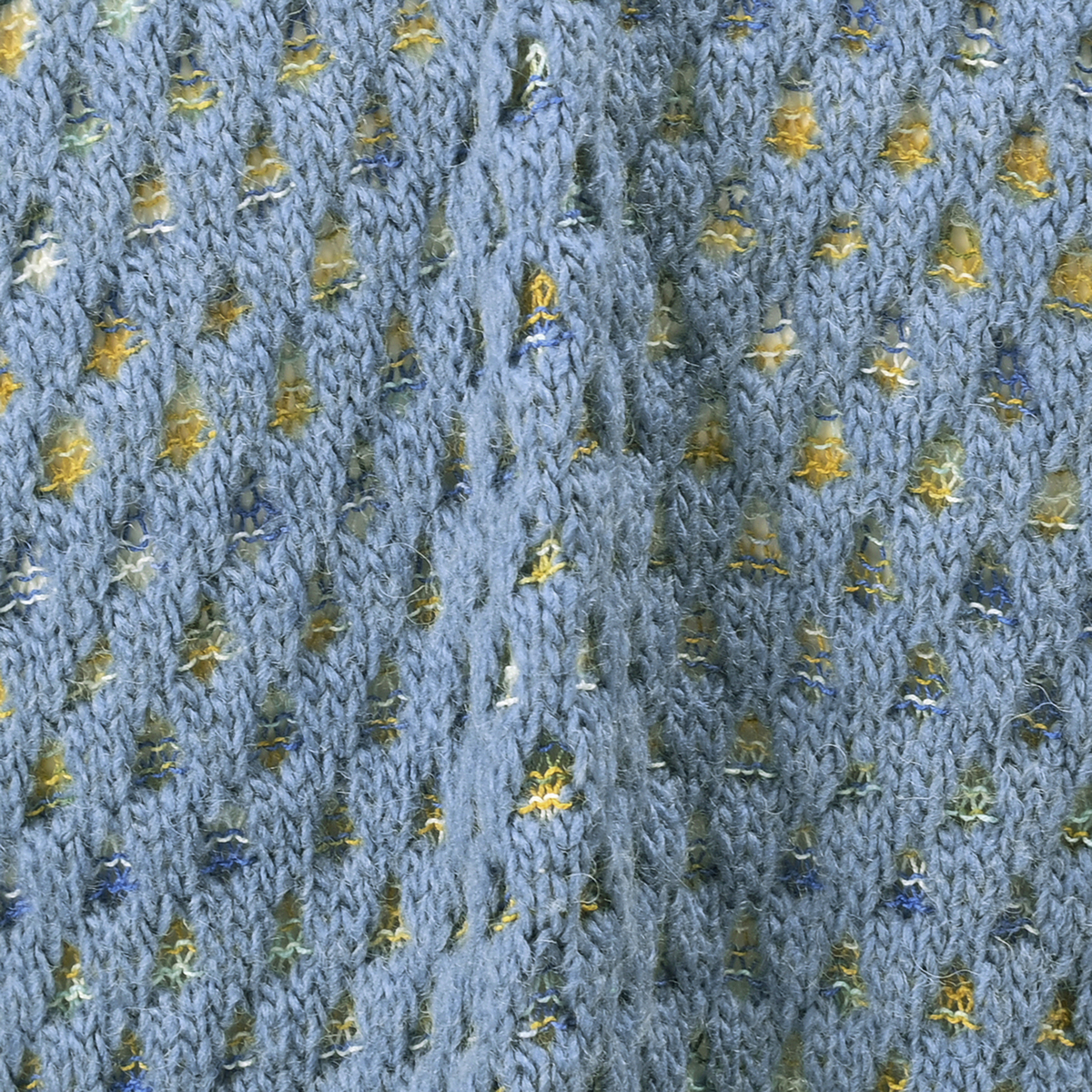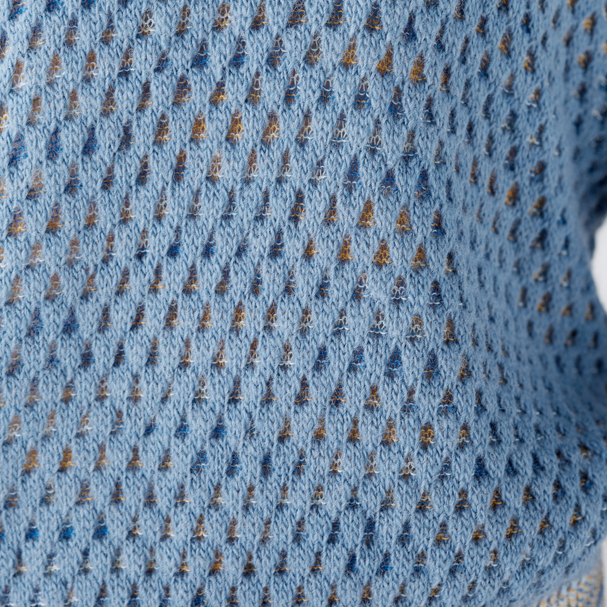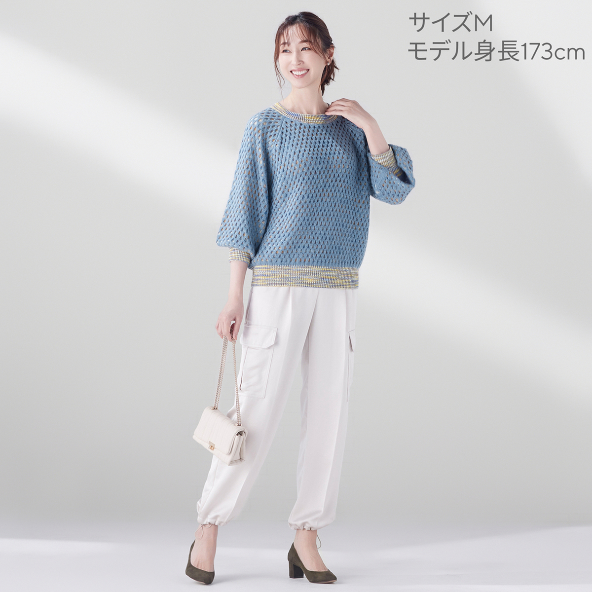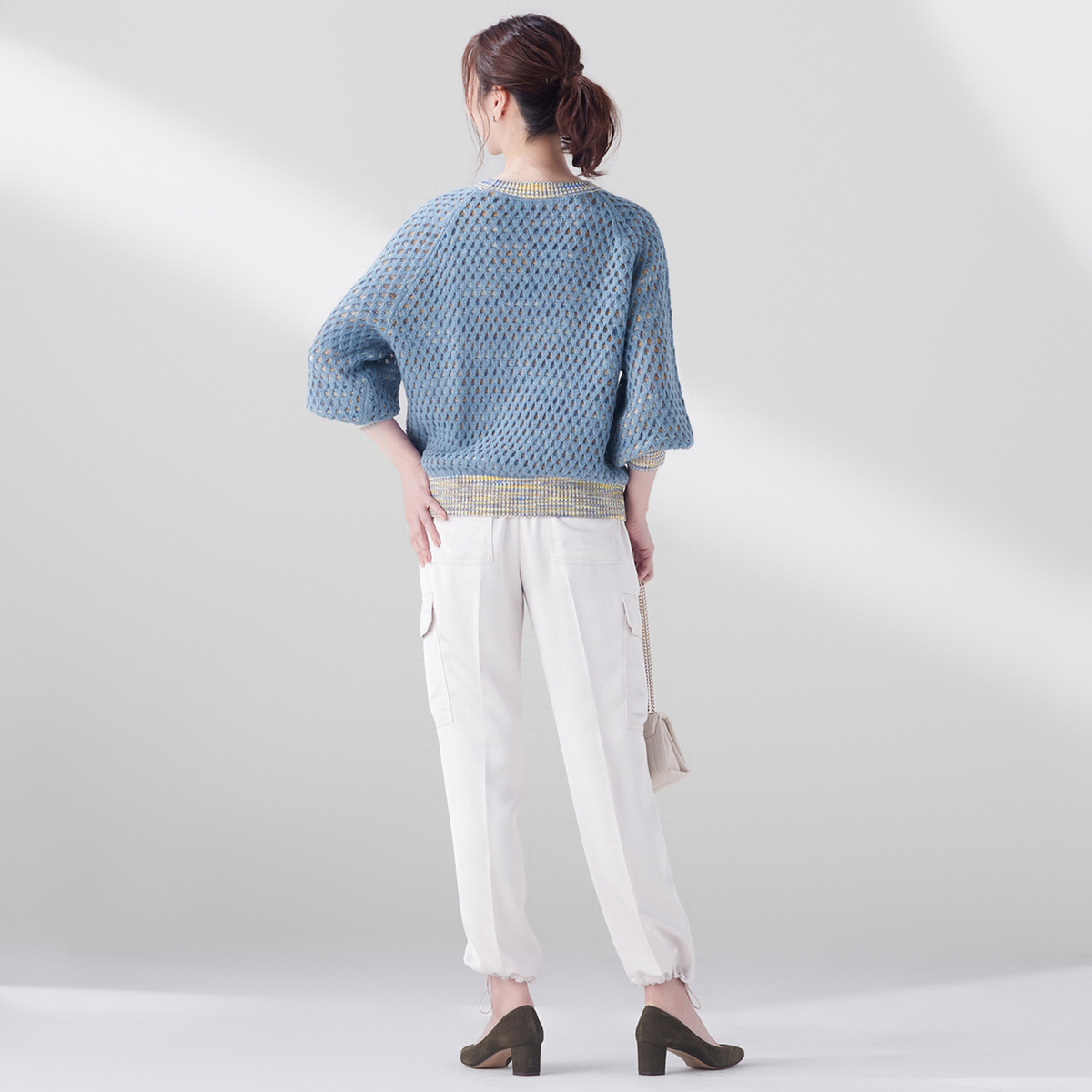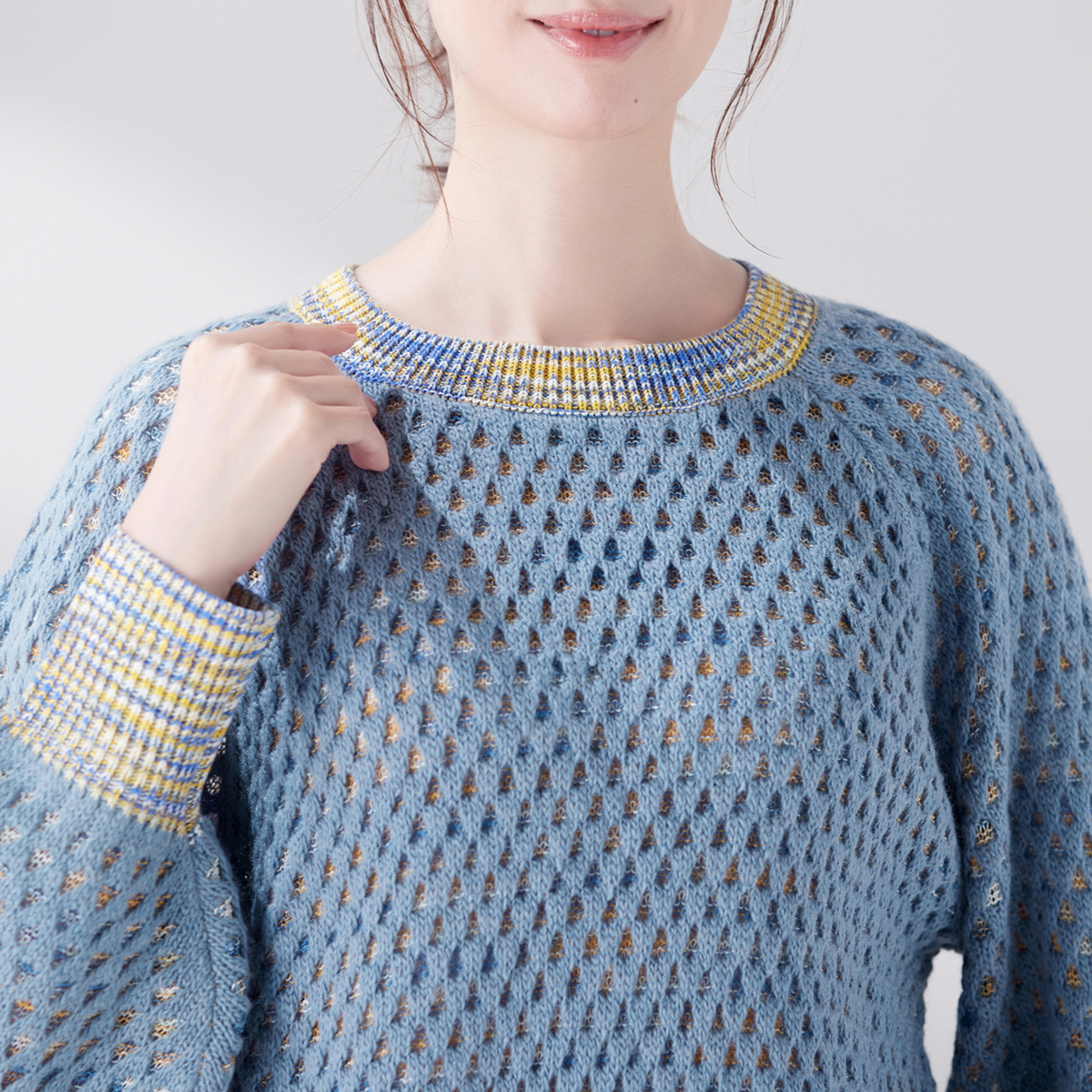 ニットの編み技法を活かしたプルオーバーです。表と裏で編み組織を変え、表情変化が楽しめるニットに。裏側にカスリ染め糸を使い、多彩な色合いが上品さを引き立てます