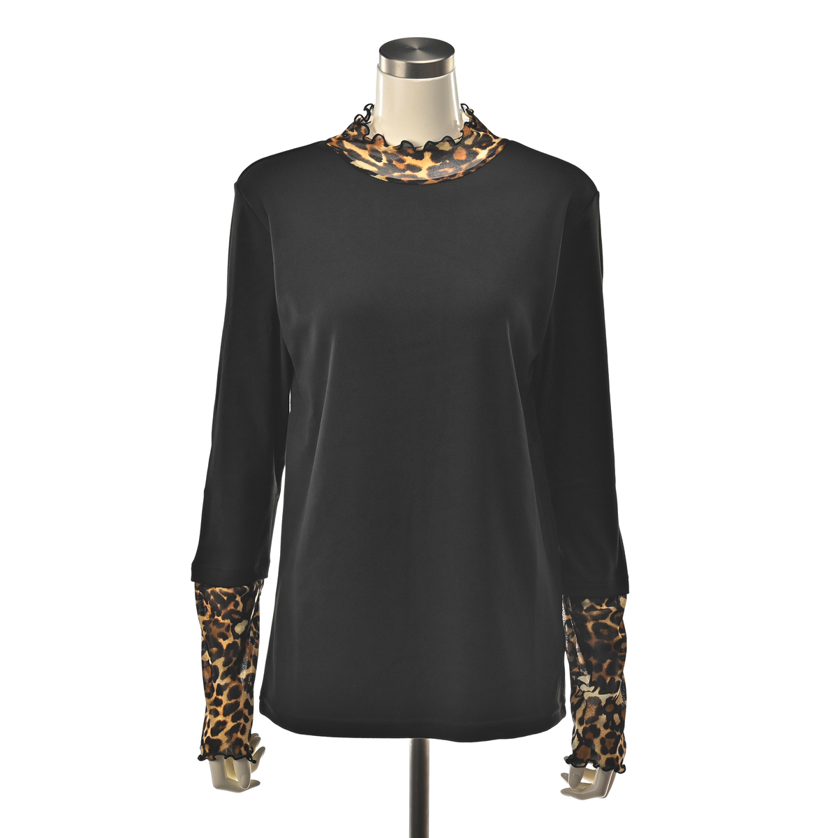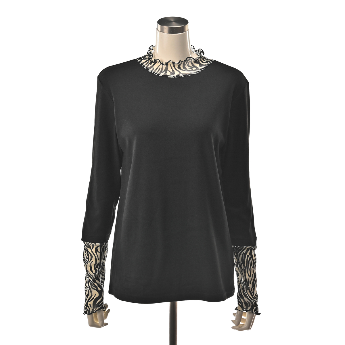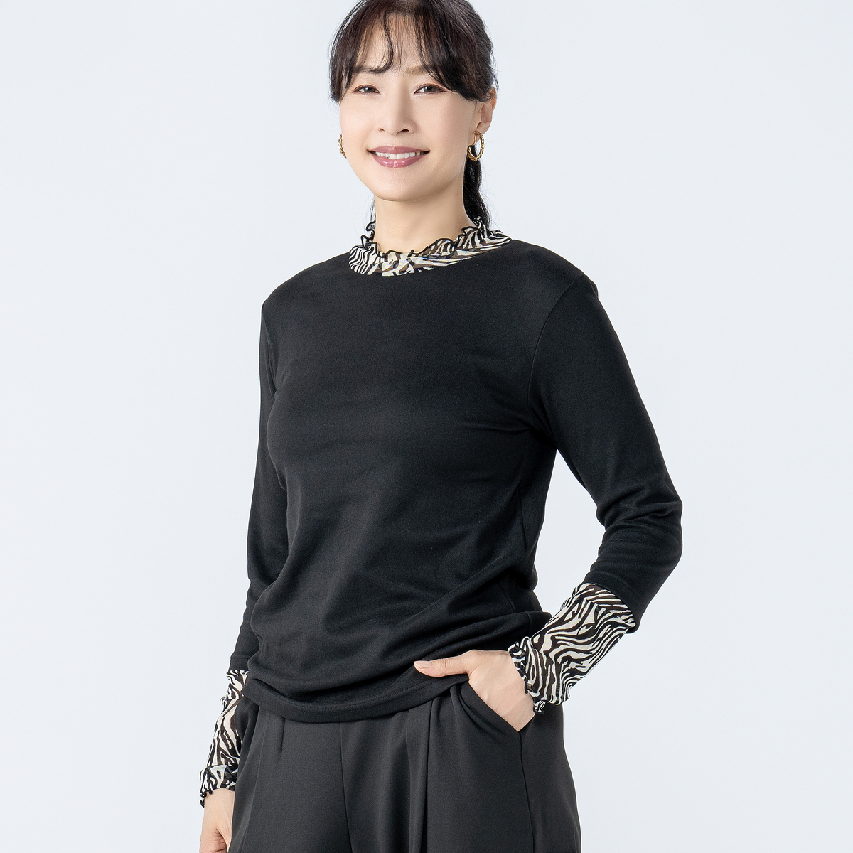 目を引く柄がポイントのインナートップス。コーディネートしやすいブラックをベースに、首元と袖に華やかなプリント加工をした異素材の生地を組合せ、印象的なデザインに仕上げました
