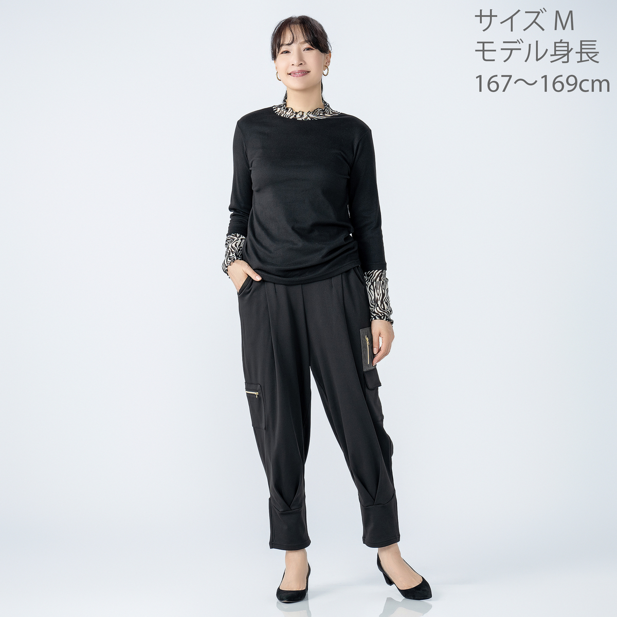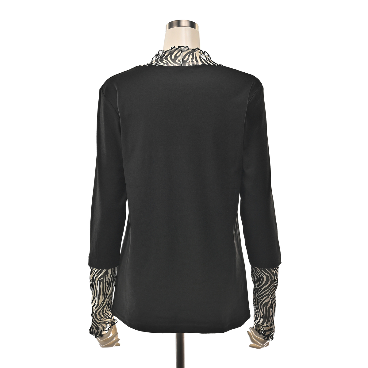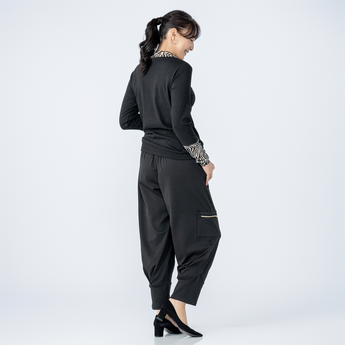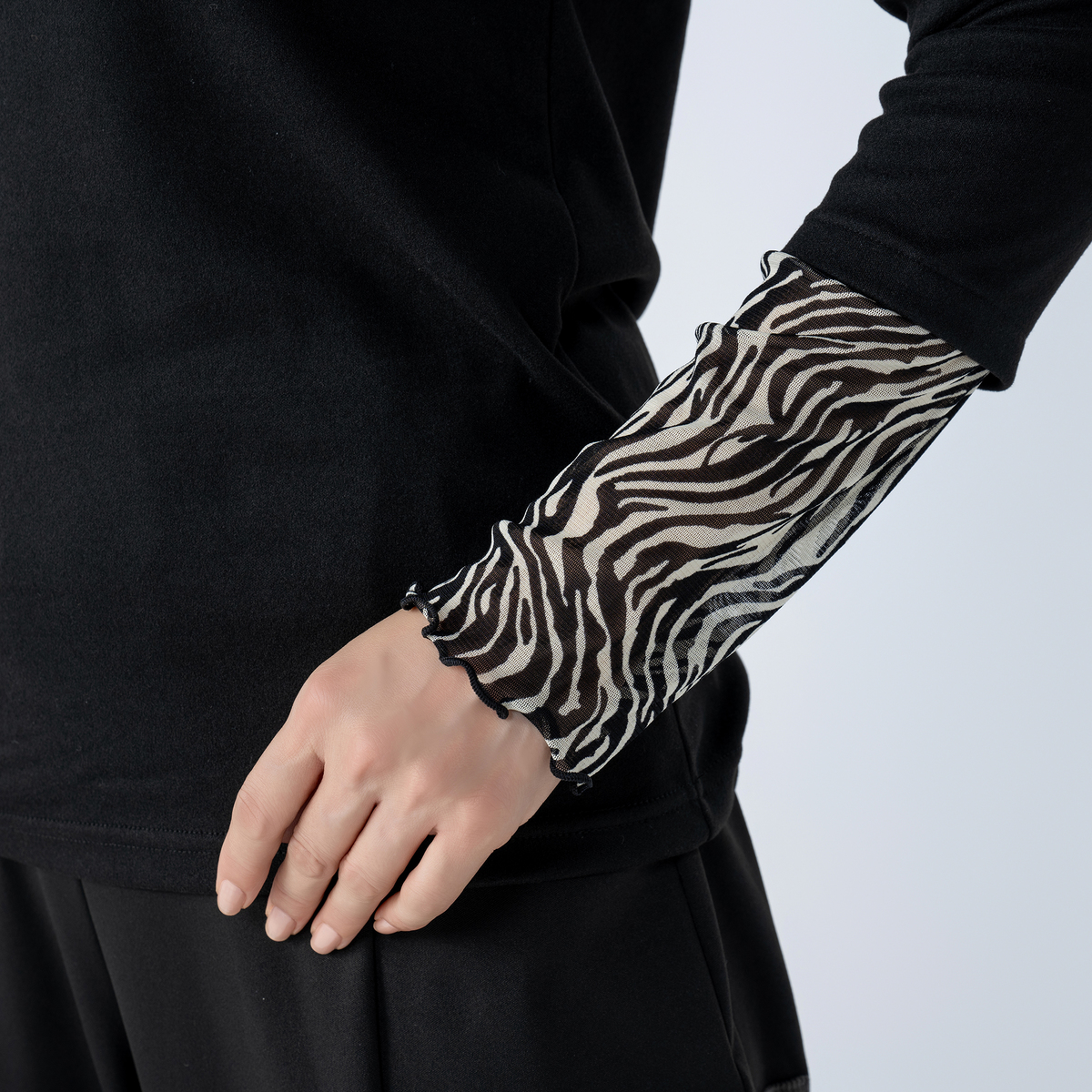 目を引く柄がポイントのインナートップス。コーディネートしやすいブラックをベースに、首元と袖に華やかなプリント加工をした異素材の生地を組合せ、印象的なデザインに仕上げました