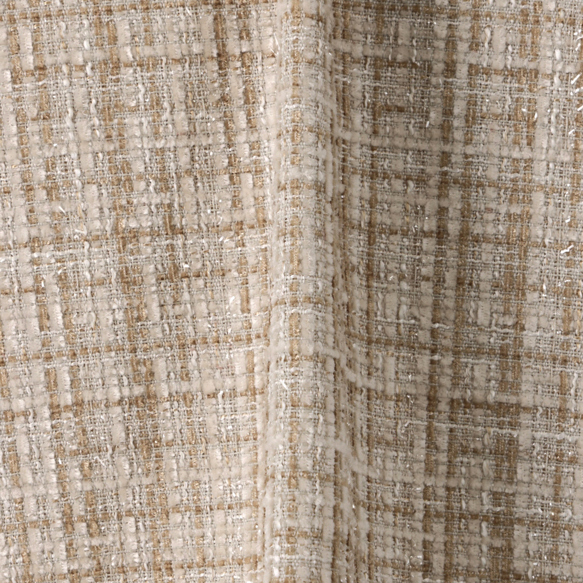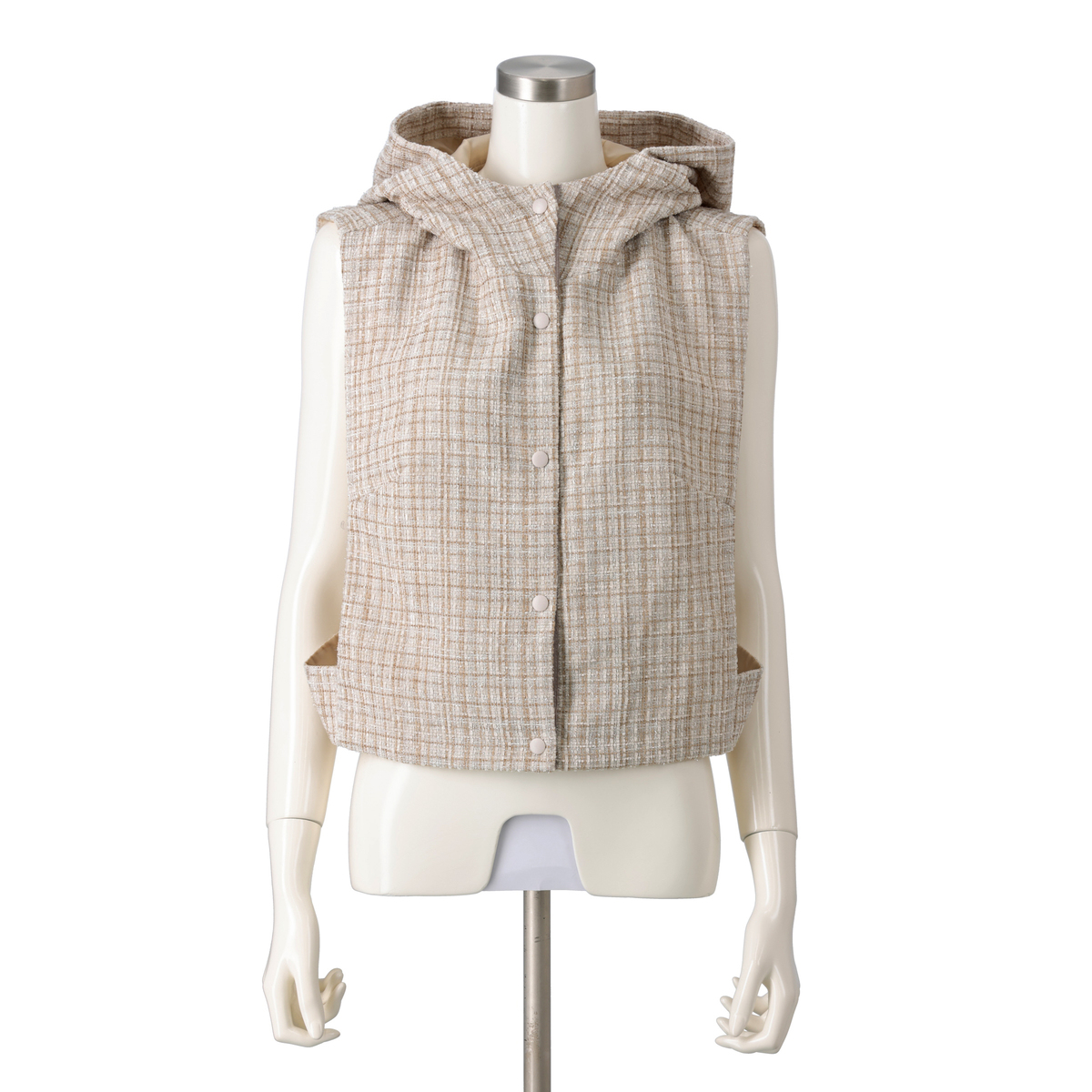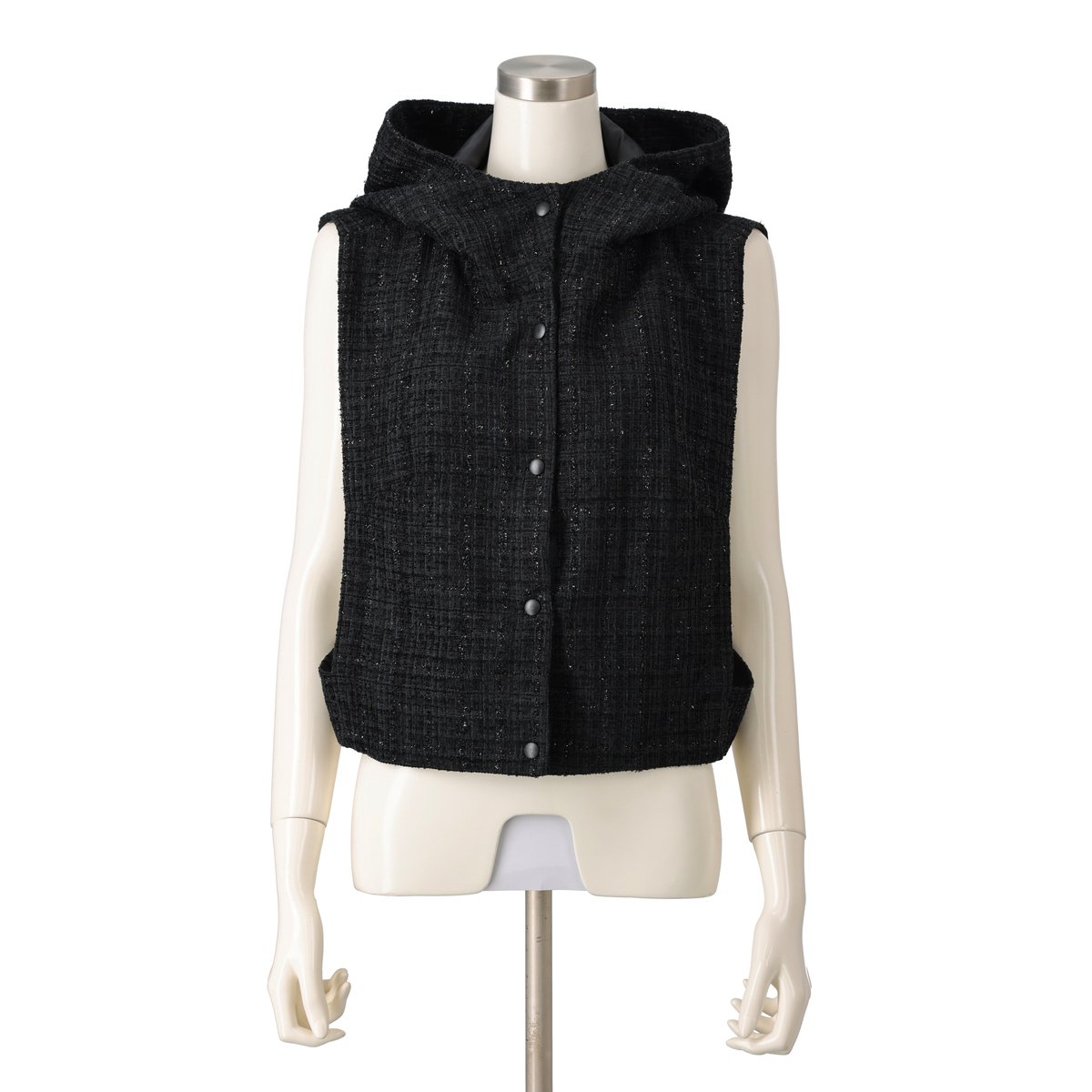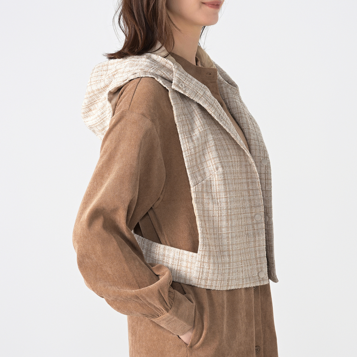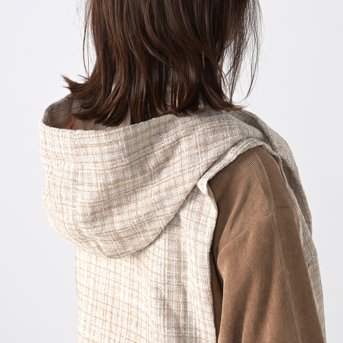 様々な色や太さの糸をざっくり織り上げたツイード生地で、奥行きのあるユニークな表情が魅力。そこにラメ感のあるグログランテープを縫い合わせることで、立体感をプラス。裏地には軽量なポリエステルタフタを使用しています。ボタンは首元までしっかり留められる仕様で、前を開けると襟のように見え、着こなしの幅が広がります