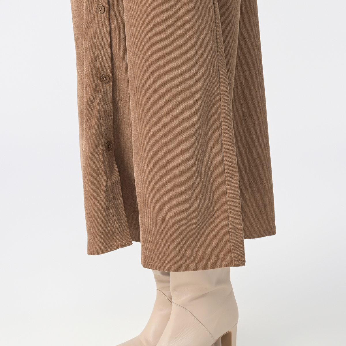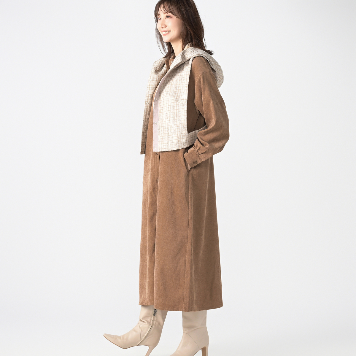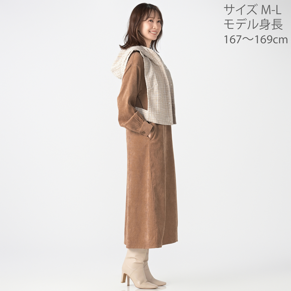 薄手のコーデュロイ生地で重ね着をしても着ぶくれしにくく、素材特有の細かな縦畝が立体感と温かみを演出。身幅にゆとりをもたせたAラインシルエットで、一枚で着ても安心です。袖口にギャザーを施し、腕まわりにふんわりとしたボリュームを出すことで二の腕のラインもさりげなくカバー。両サイドには便利なポケット付きです