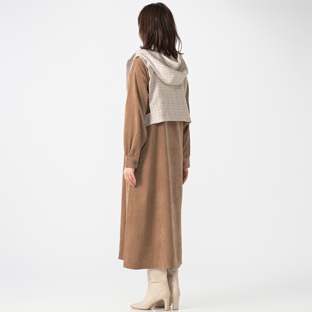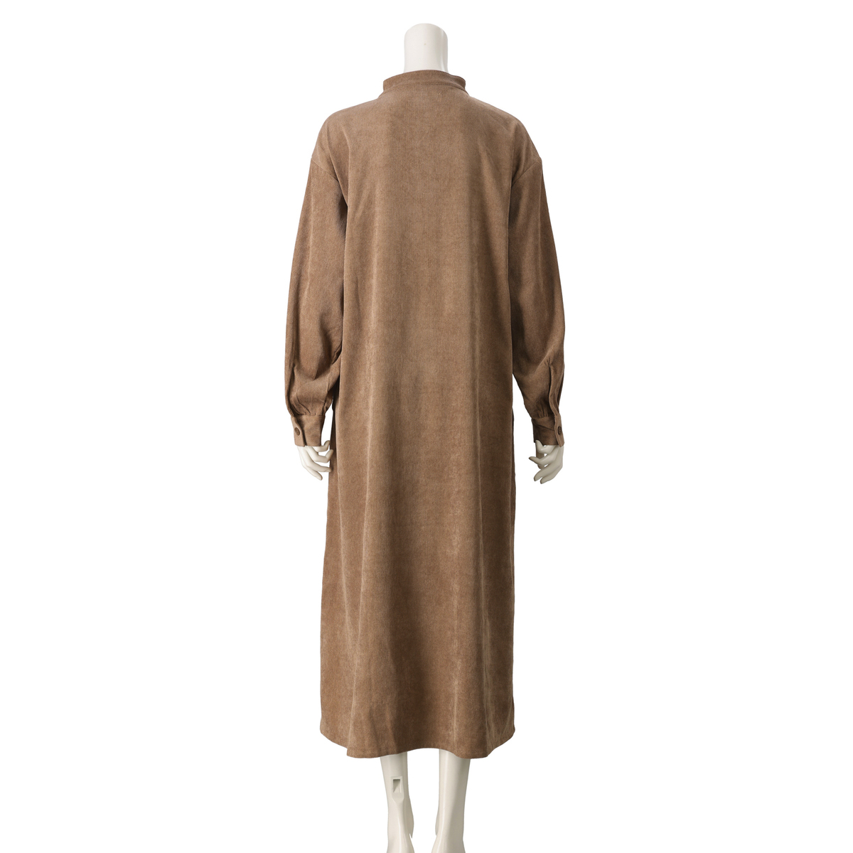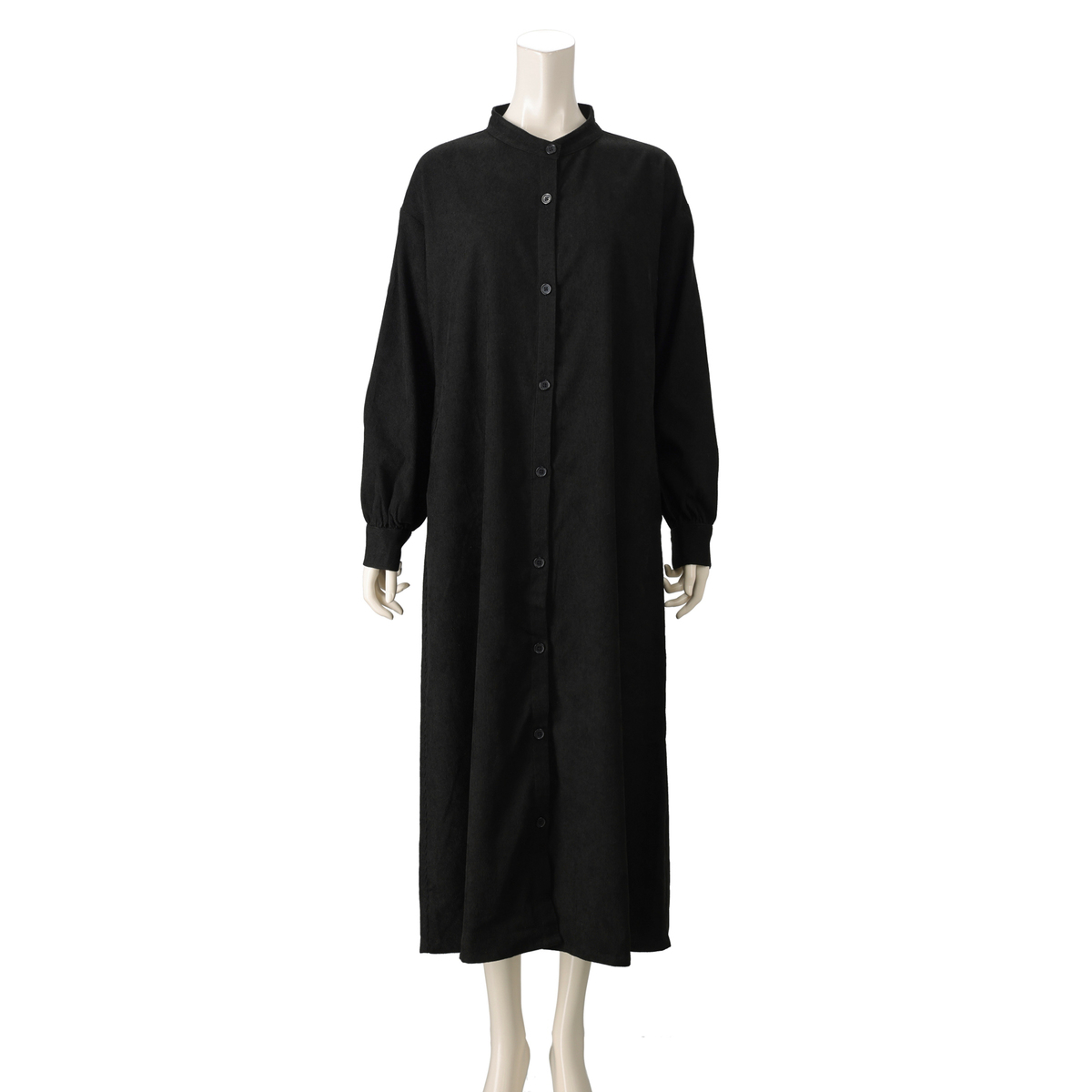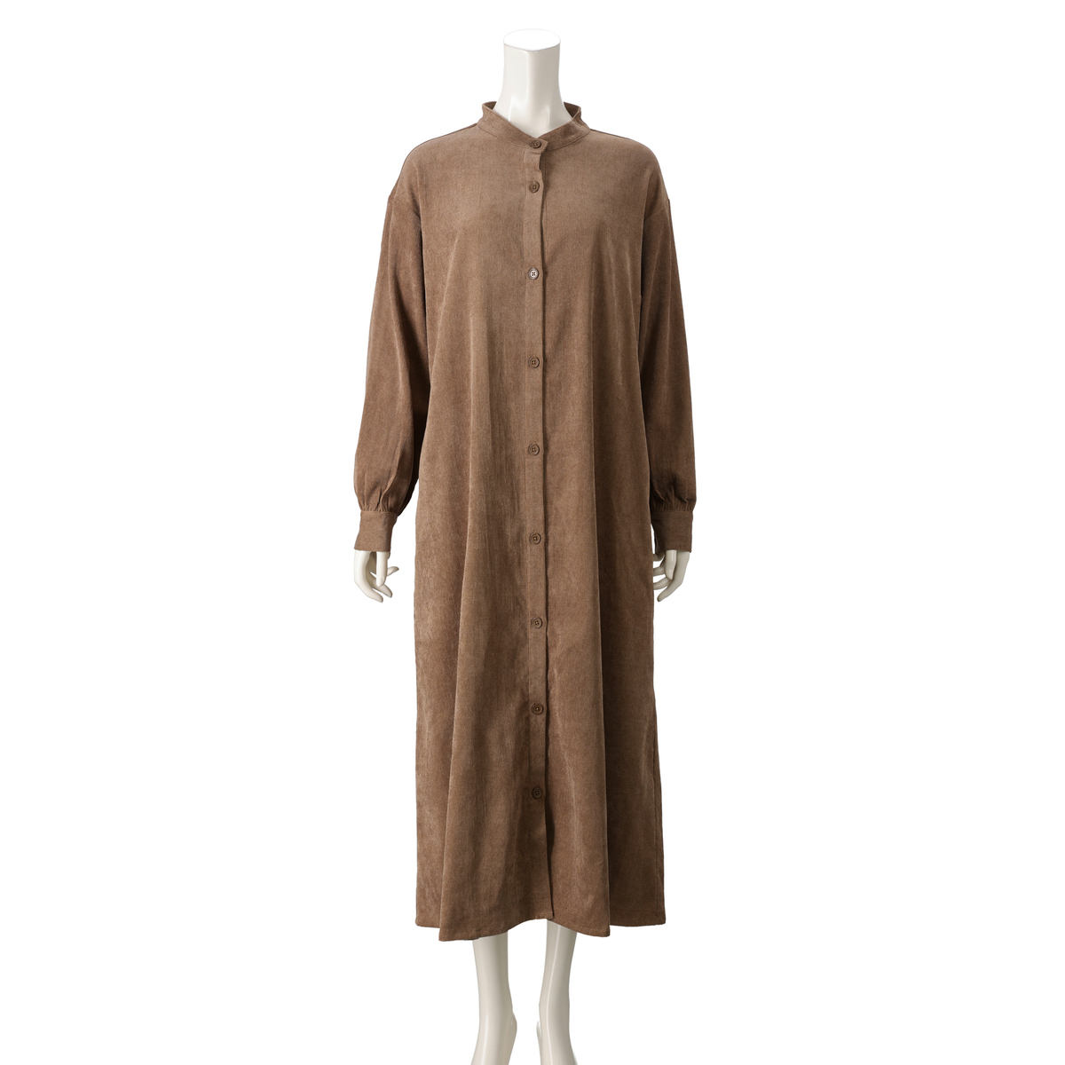 薄手のコーデュロイ生地で重ね着をしても着ぶくれしにくく、素材特有の細かな縦畝が立体感と温かみを演出。身幅にゆとりをもたせたAラインシルエットで、一枚で着ても安心です。袖口にギャザーを施し、腕まわりにふんわりとしたボリュームを出すことで二の腕のラインもさりげなくカバー。両サイドには便利なポケット付きです