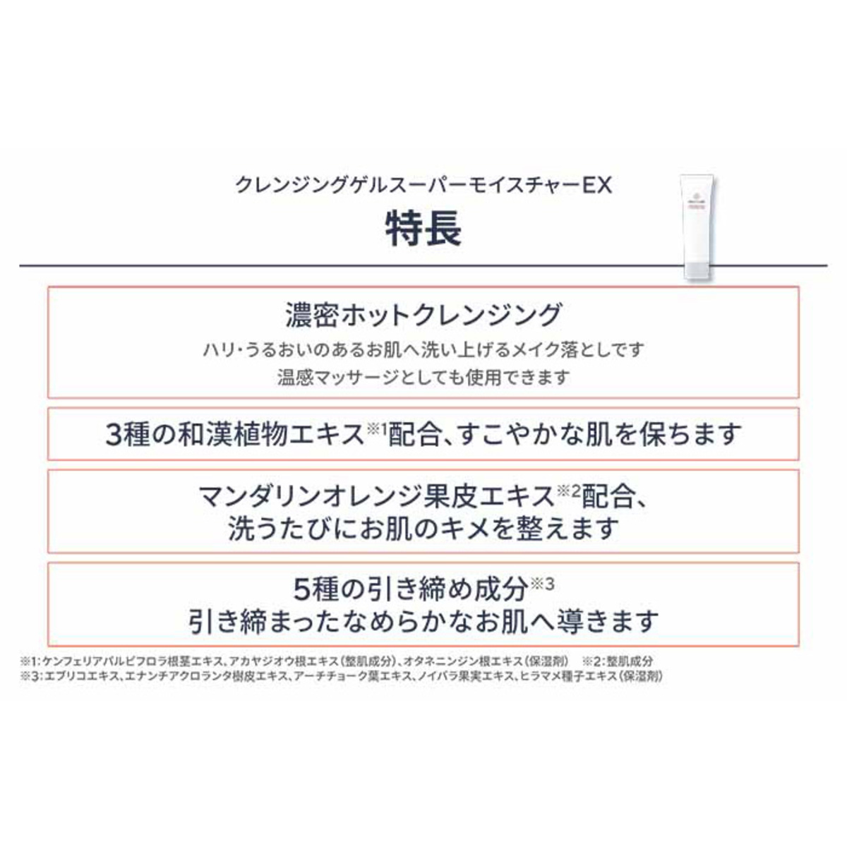 ハリ・うるおいのあるお肌へ洗い上げるクレンジングゲル。メイクをやさしく落とし、温感マッサージとしても使える心地よさが魅力。3種の和漢植物エキスが肌をすこやかに保ち(*1)、マンダリンオレンジ果皮エキス(*2)でキメを整えます。さらに、5種の引き締め成分がなめらかな肌へ導きます(*3)
