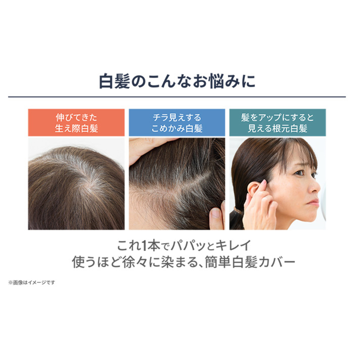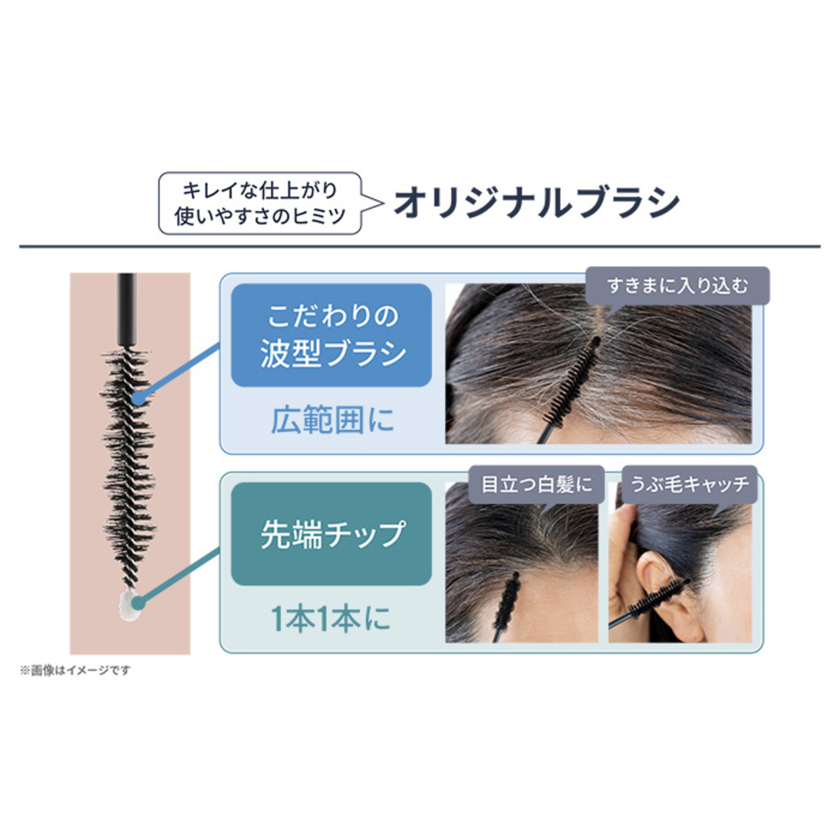4つ玉ブラシが広範囲の白髪をひと塗りでカバー。目立つ頭頂部や顔まわりは広範囲でダマにならずに塗れるように設計。先端のチップが、もみあげ付近の太くて目立つ白髪にしっかり塗布でき、細く弱った毛・産毛までしっかりキャッチします