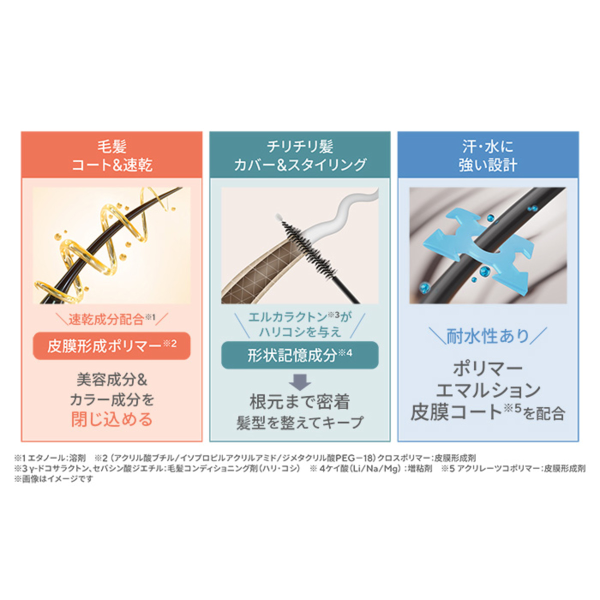 汗や水にも強いポリマーエマルション皮膜コート(*1)を配合。耐水性があり汚れ移りをカバー。紫外線による夏ダメージ(乾燥のこと)に着目してプロラミンタンパク(*2)を配合。被膜を作りキューティクルを保護し、毛髪の水分・油分を補い保ちます