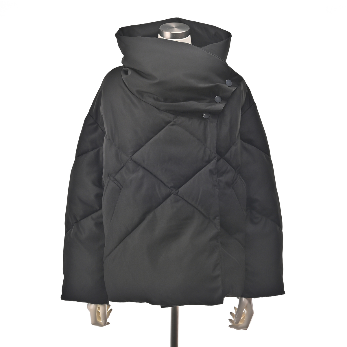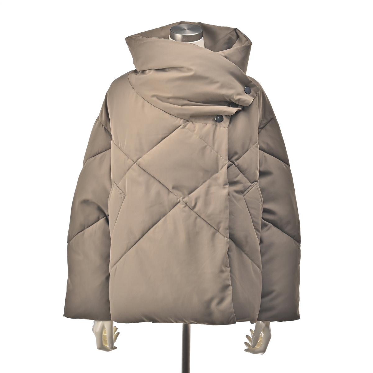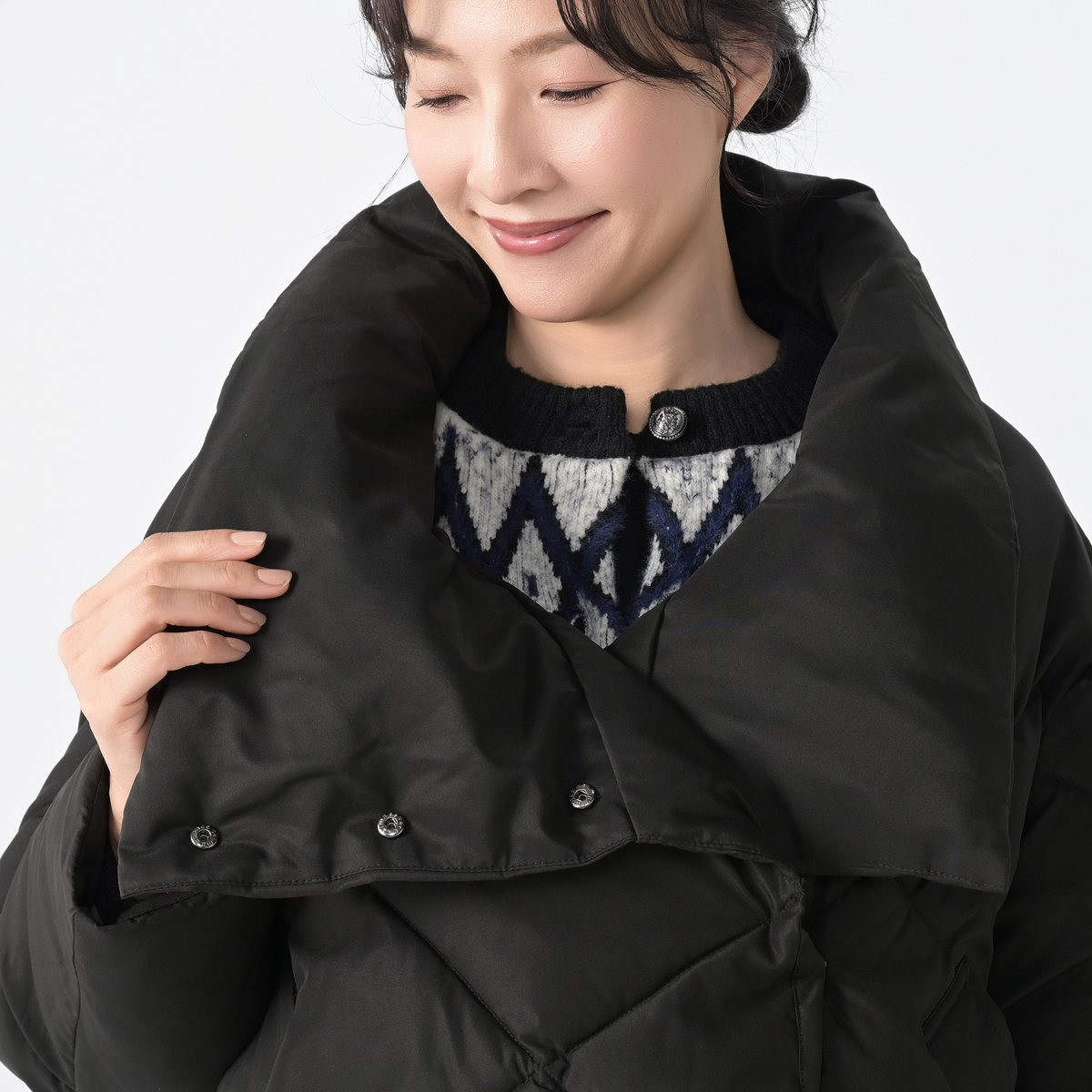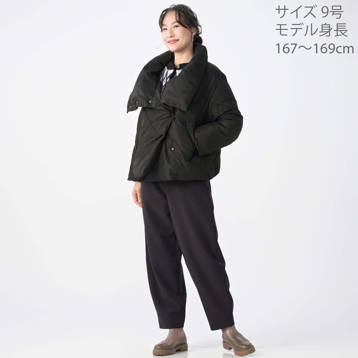 ゆったりとしたビッグシルエットでデザイン。幅広のスタンドタイプのハイカラーで、パフっとしたボリューム感を。開けても閉めても衿元が華やかに決まります。袖口から肘に掛けてダーツを入れ、バナナスリーブのように袖口を絞っています