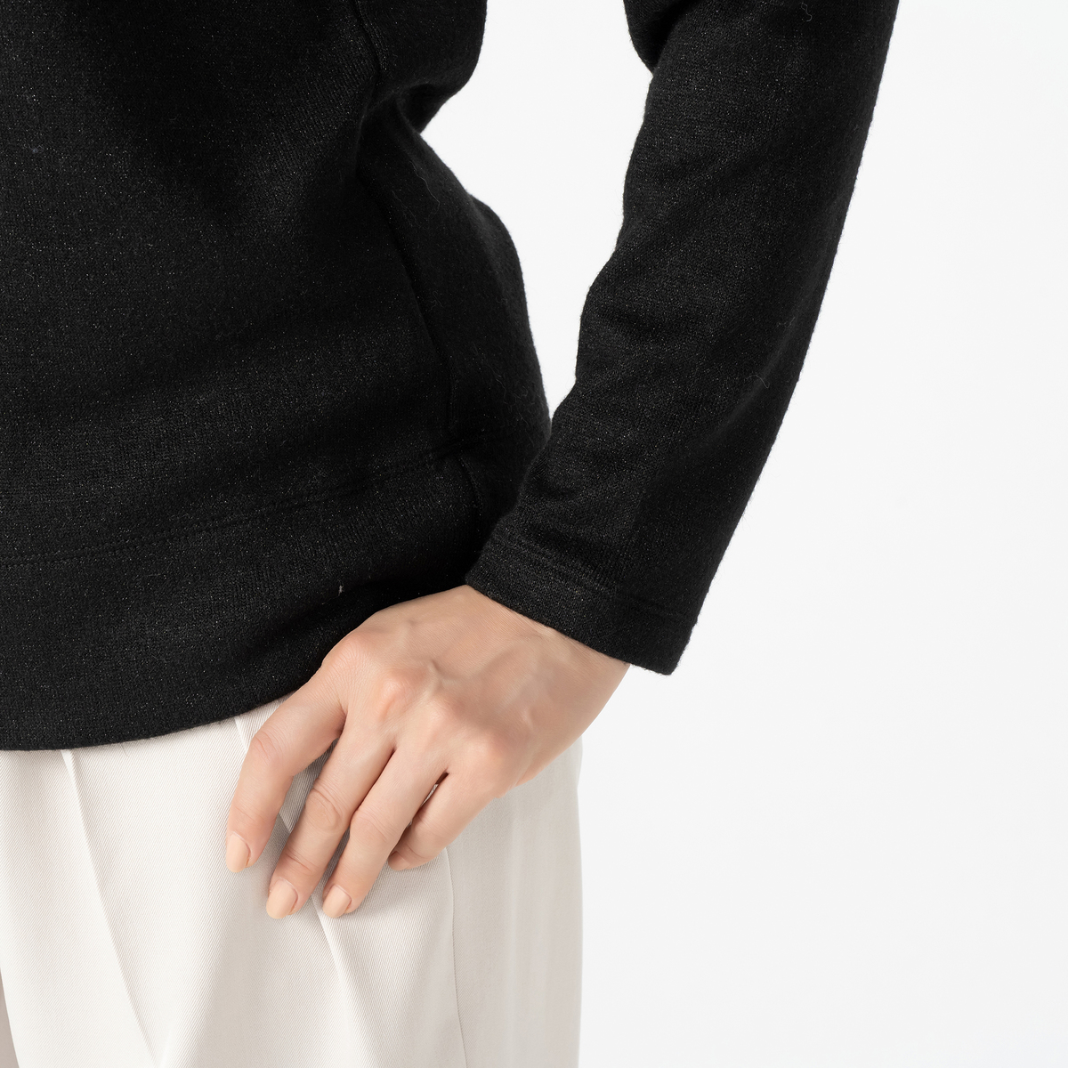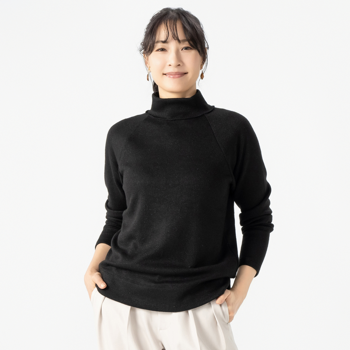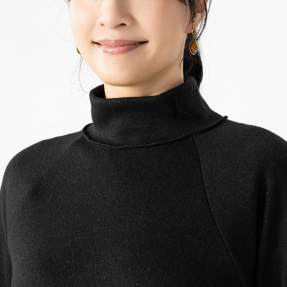 繊細なラメ混スムース素材を使用したプルオーバー。アイシャドウのような煌めくラメが上質な表情を醸し出します。素材の特徴で1枚着も可能ですし、長すぎない丈感なのでレイヤードコーデも楽しめます