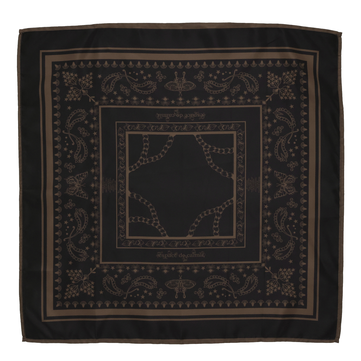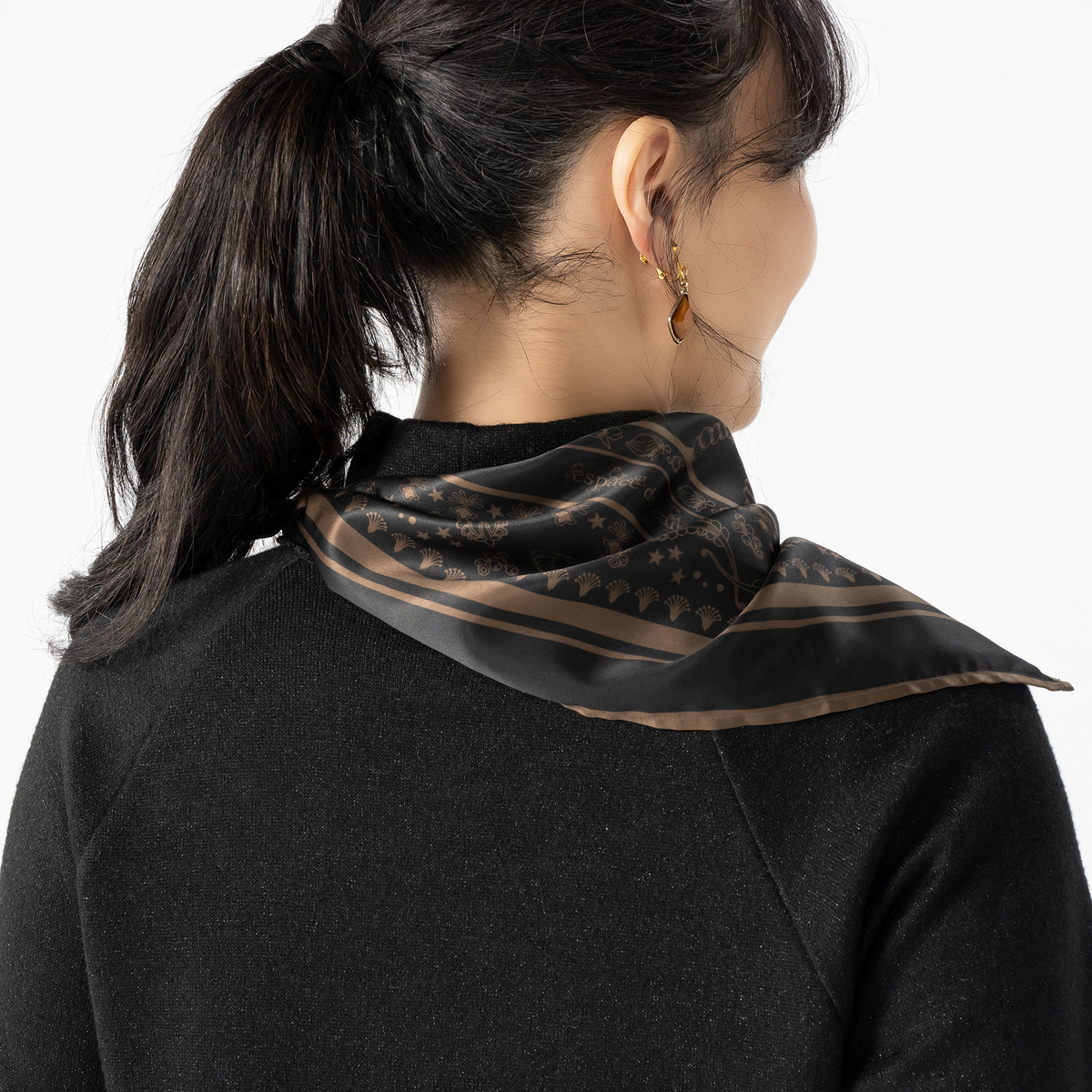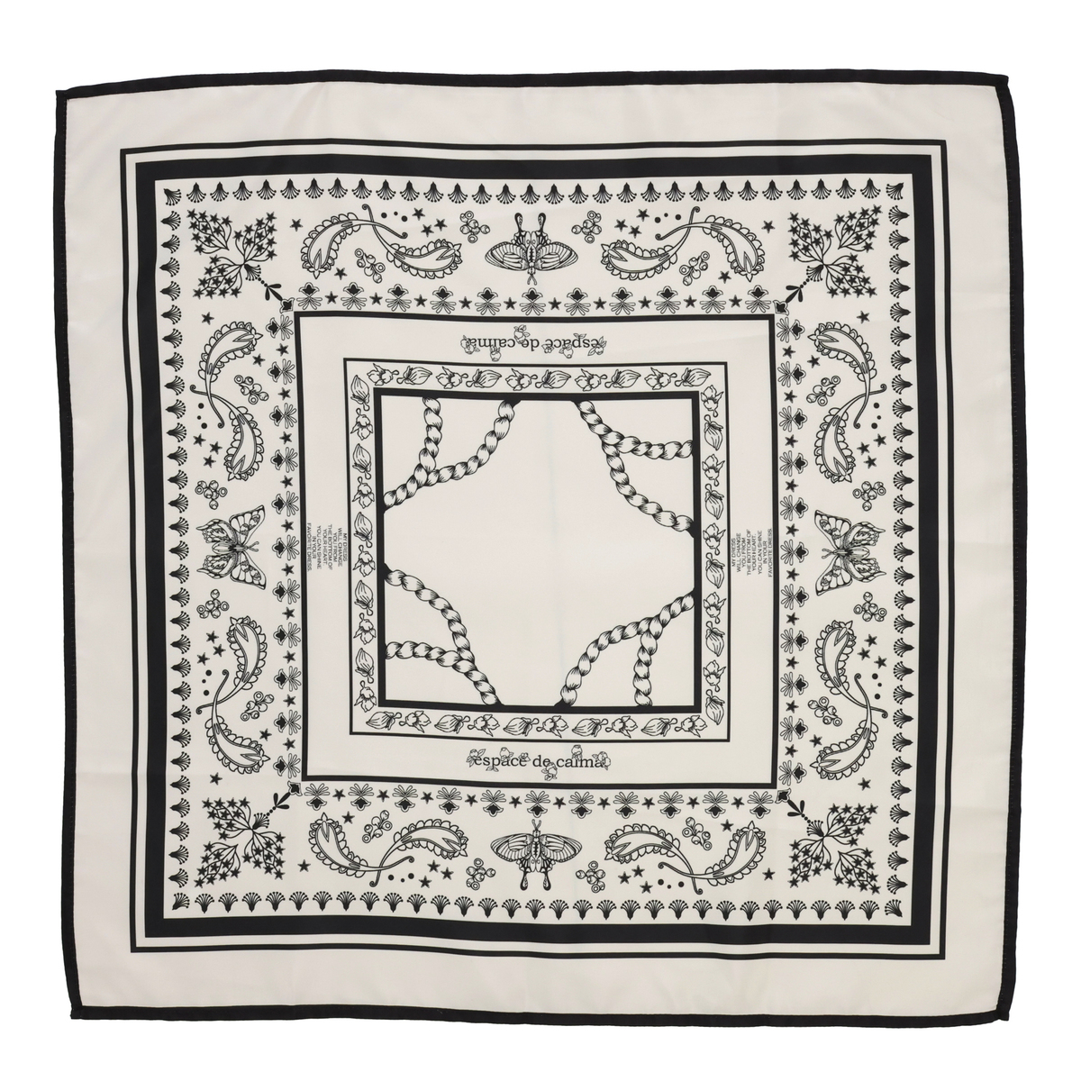 デザイナーが一つ一つ描いたペーズリーや蝶々の柄が、ブランドの世界観を表現。サテン生地に染み込みプリントで仕上げることでカジュアル過ぎず、エレガントも加え、スカーフとして使用できるように仕上げました