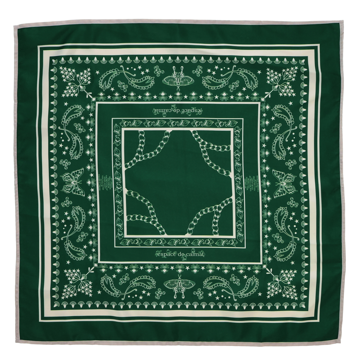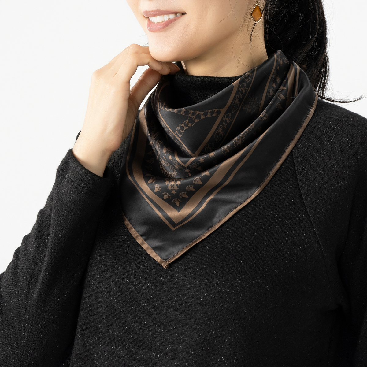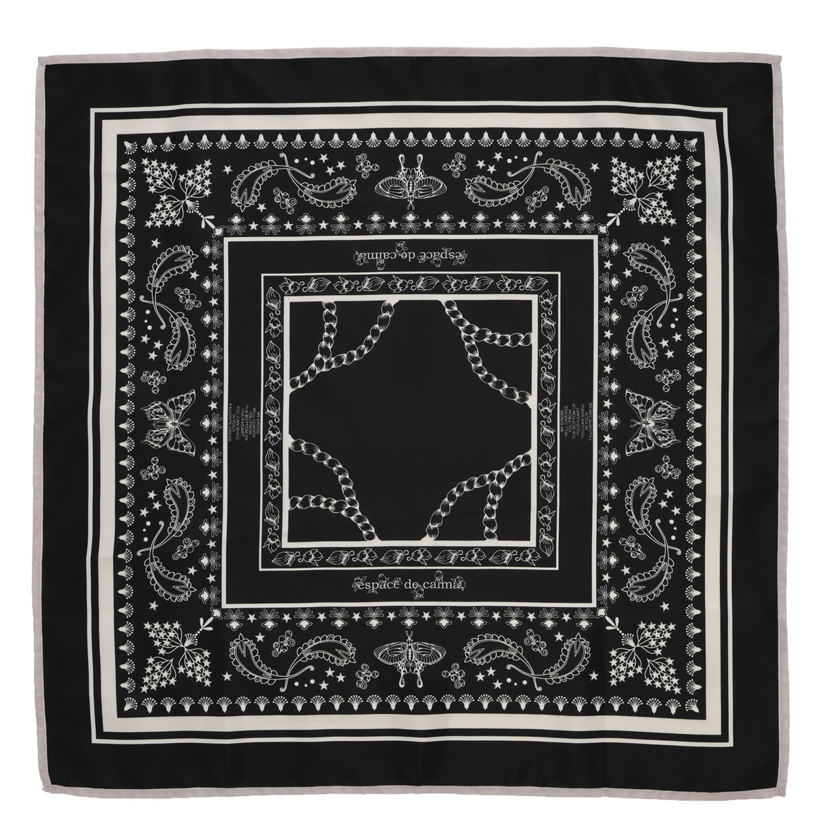 デザイナーが一つ一つ描いたペーズリーや蝶々の柄が、ブランドの世界観を表現。サテン生地に染み込みプリントで仕上げることでカジュアル過ぎず、エレガントも加え、スカーフとして使用できるように仕上げました