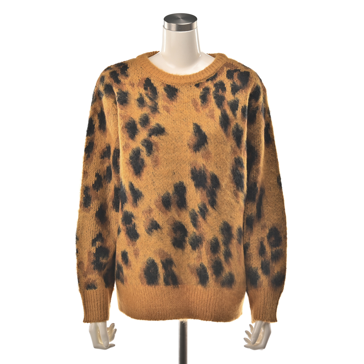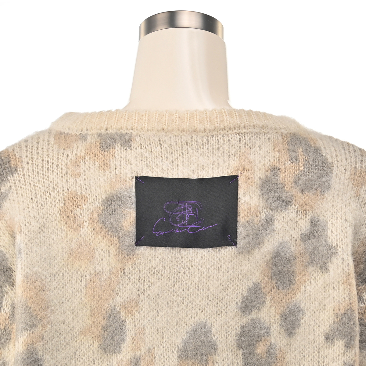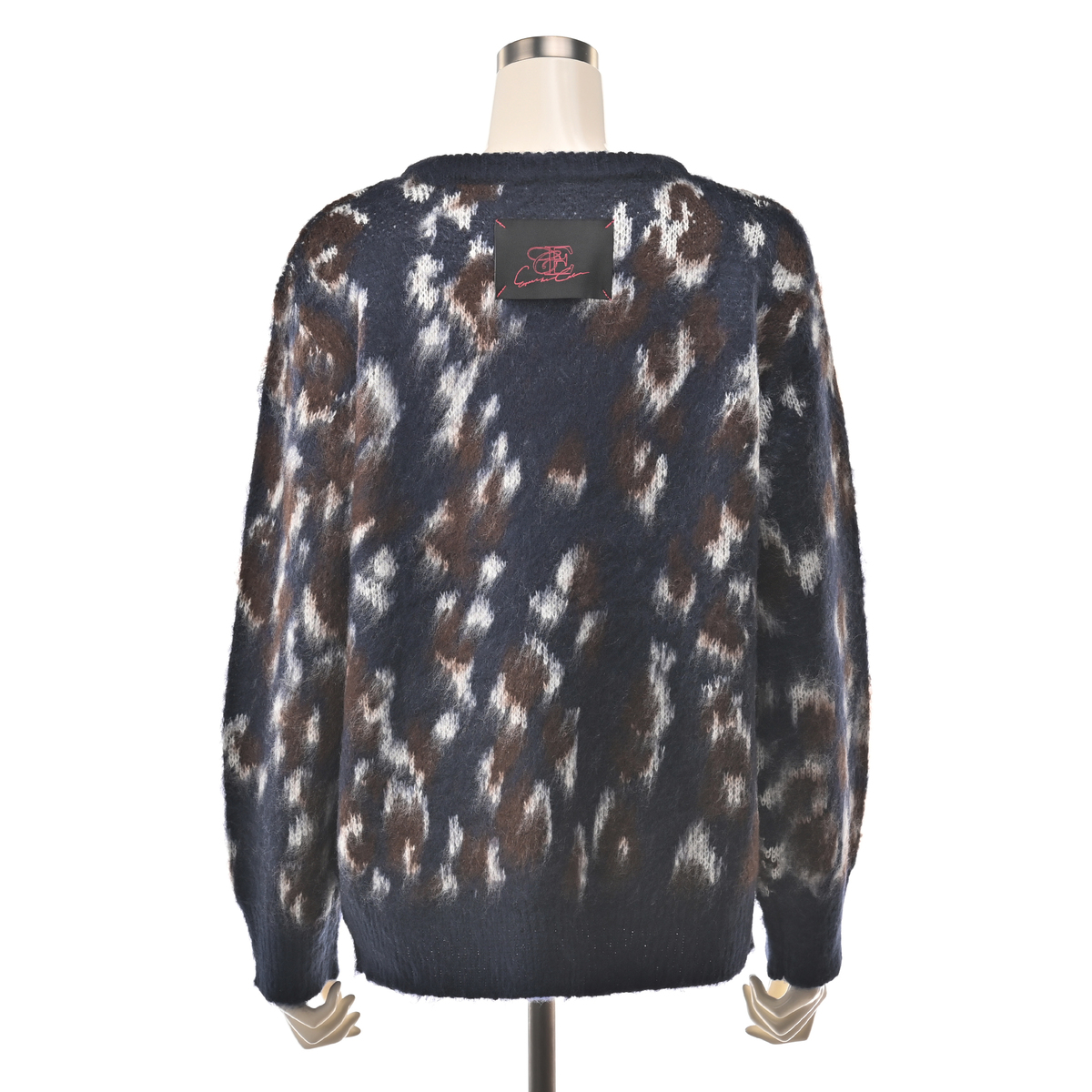 5ゲージのローゲージで編み立てたジャガードニットプルオーバー。製品で起毛加工を施し表面を毛羽立たせた、ふんわりとした風合いと見た目に仕上げています。流れ落ちるような柄行きと無地場の空間の使い方が、レオパード柄をモダンな表情に見せています