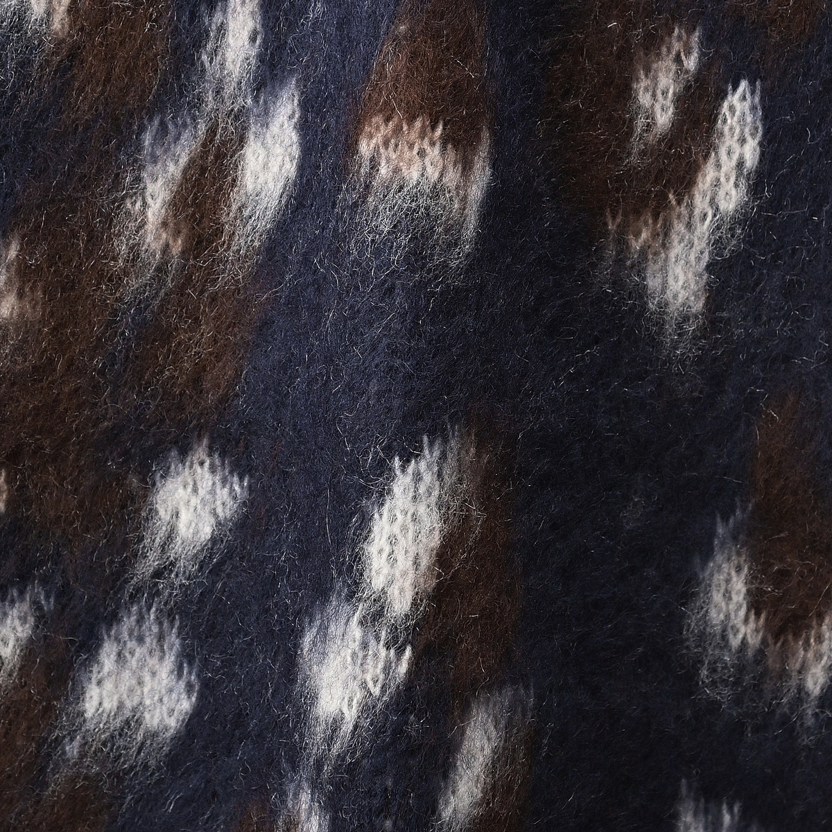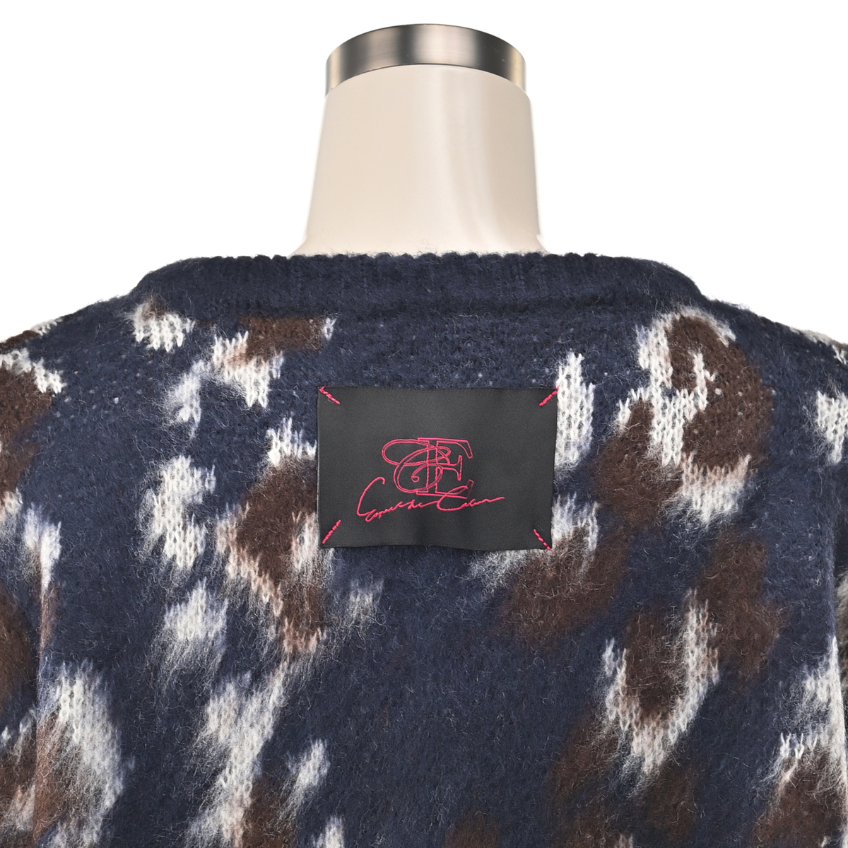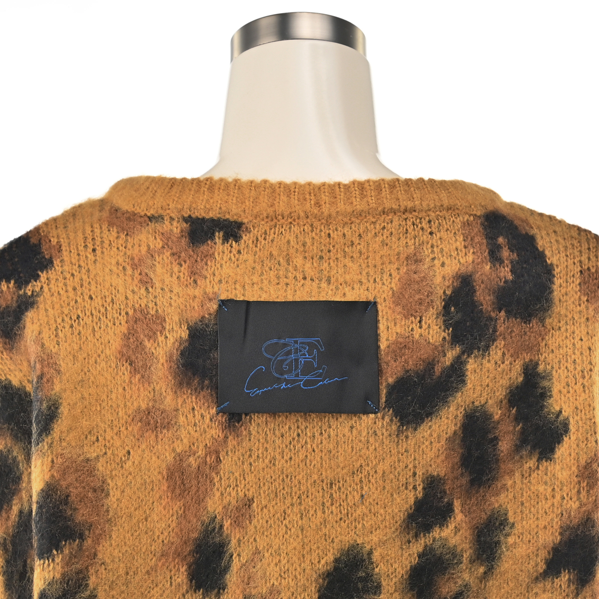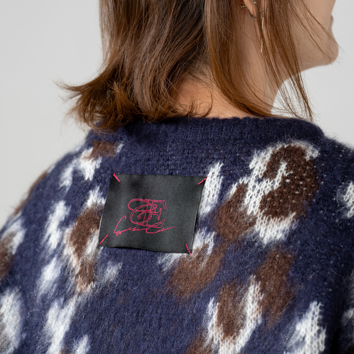 5ゲージのローゲージで編み立てたジャガードニットプルオーバー。製品で起毛加工を施し表面を毛羽立たせた、ふんわりとした風合いと見た目に仕上げています。流れ落ちるような柄行きと無地場の空間の使い方が、レオパード柄をモダンな表情に見せています