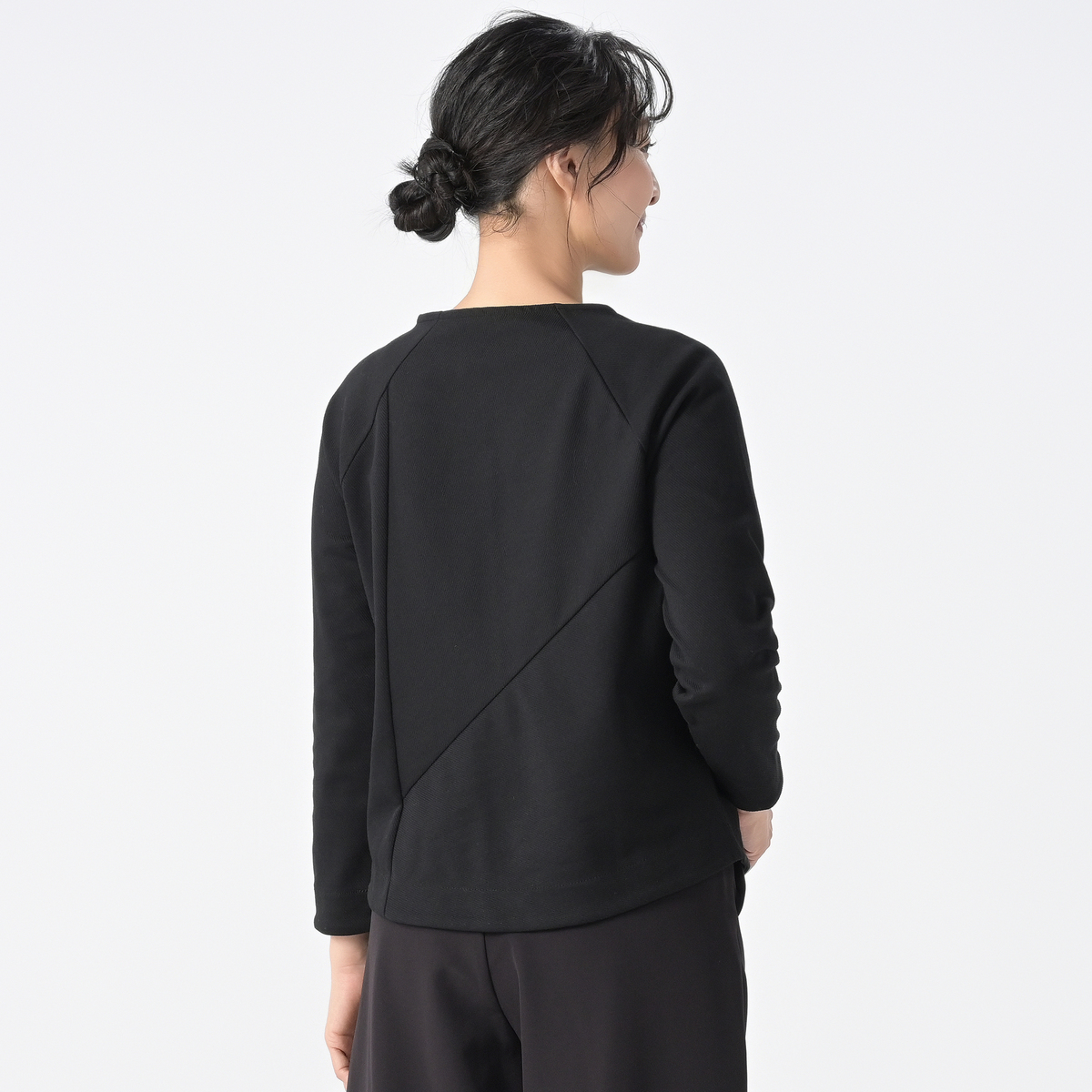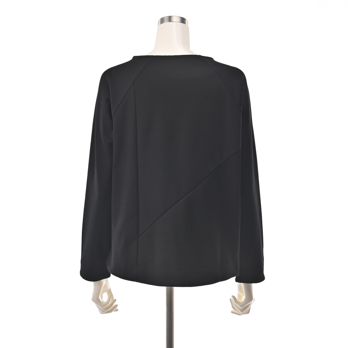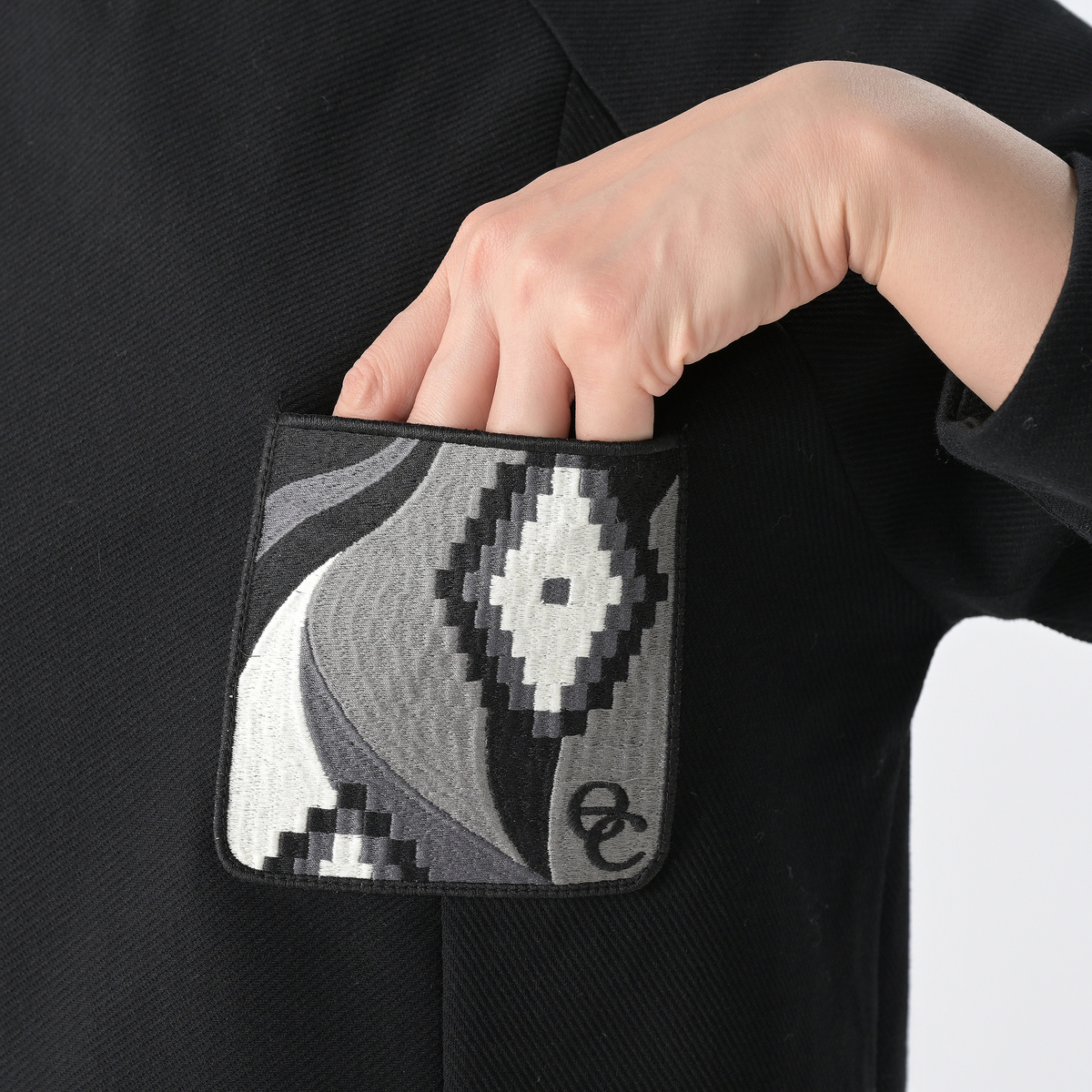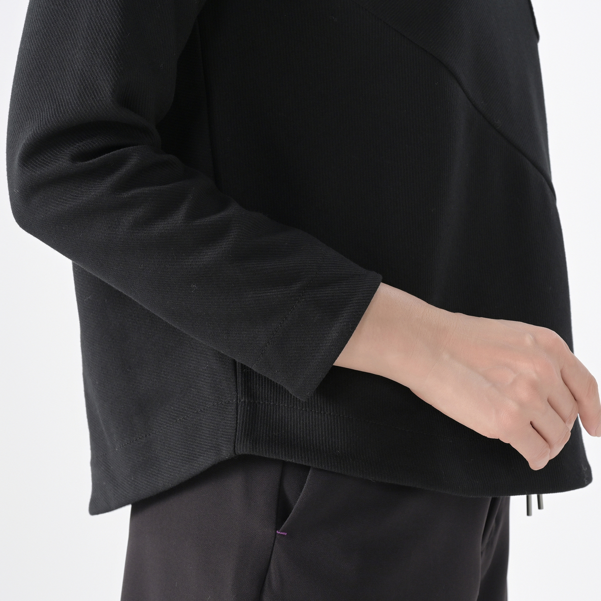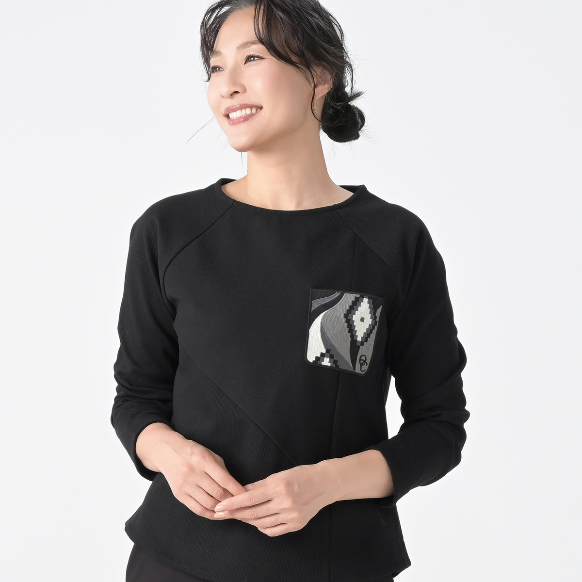 斜めの畝が特徴のカルゼ調カットソーを使用したプルオーバー。切替を施し、シンプルながらも表情豊かに仕上げました。オルテガ柄をイメージした幾何学模様の刺繍ポケットがアクセントになっています
