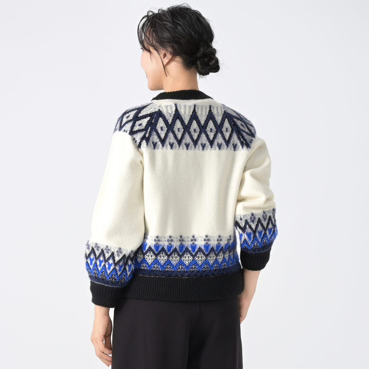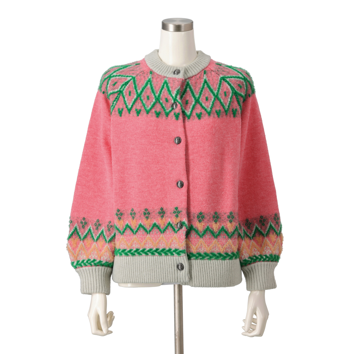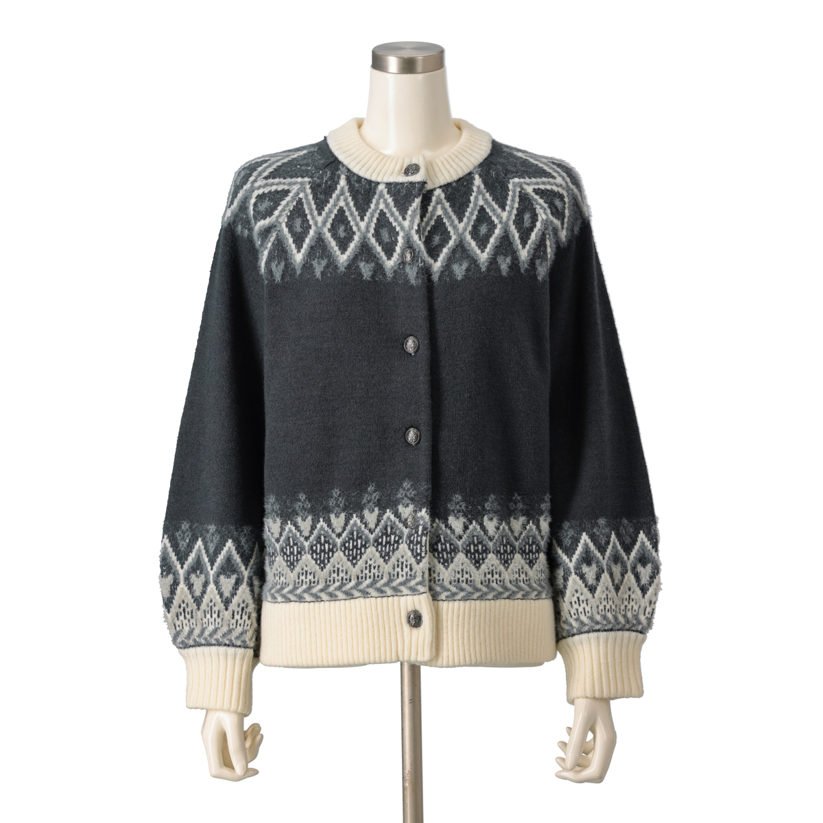 軽やかな起毛ヤーンを使用したニットカーディガン。デザイナーが描いたノルディック柄をジャガード編みで仕立て、フェザーヤーンをミックスしたことで毛羽の表面感が豊かな表情と季節感を表現しています