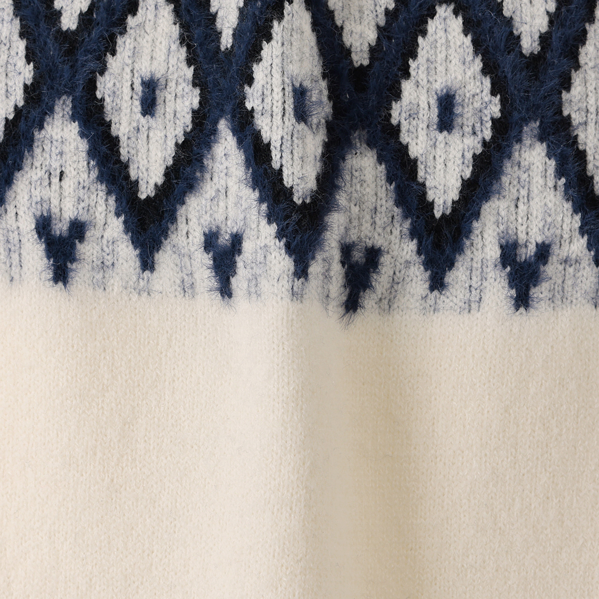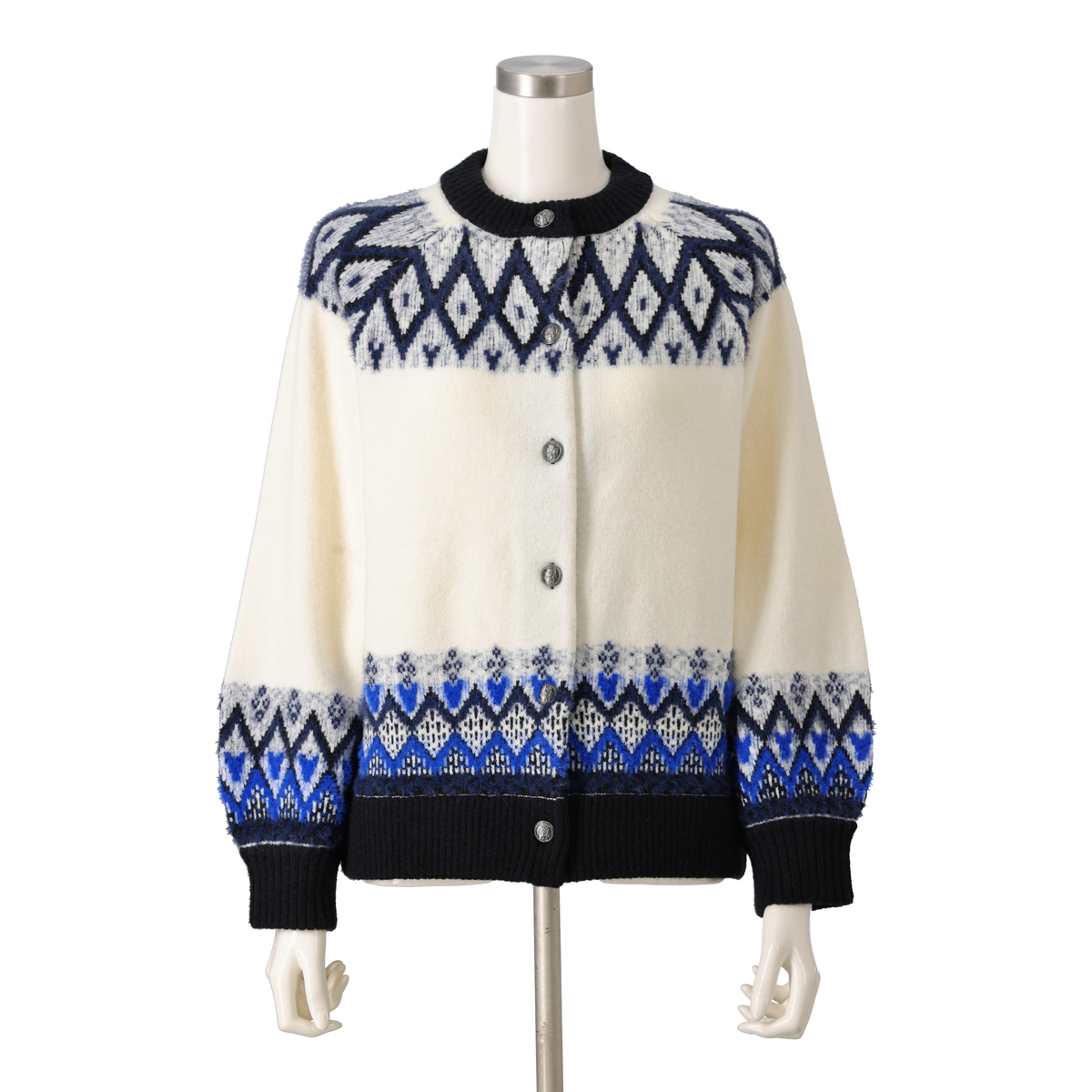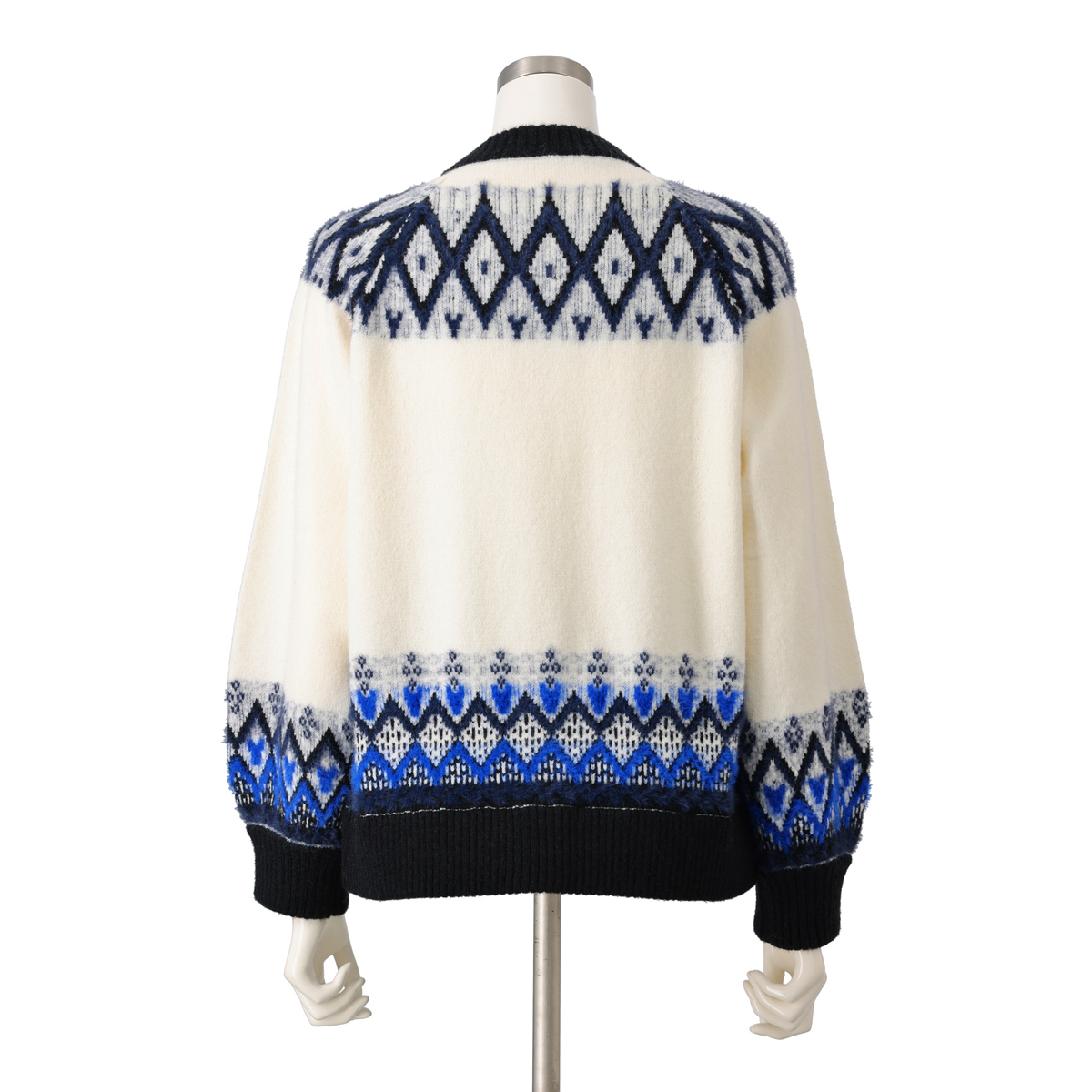 軽やかな起毛ヤーンを使用したニットカーディガン。デザイナーが描いたノルディック柄をジャガード編みで仕立て、フェザーヤーンをミックスしたことで毛羽の表面感が豊かな表情と季節感を表現しています